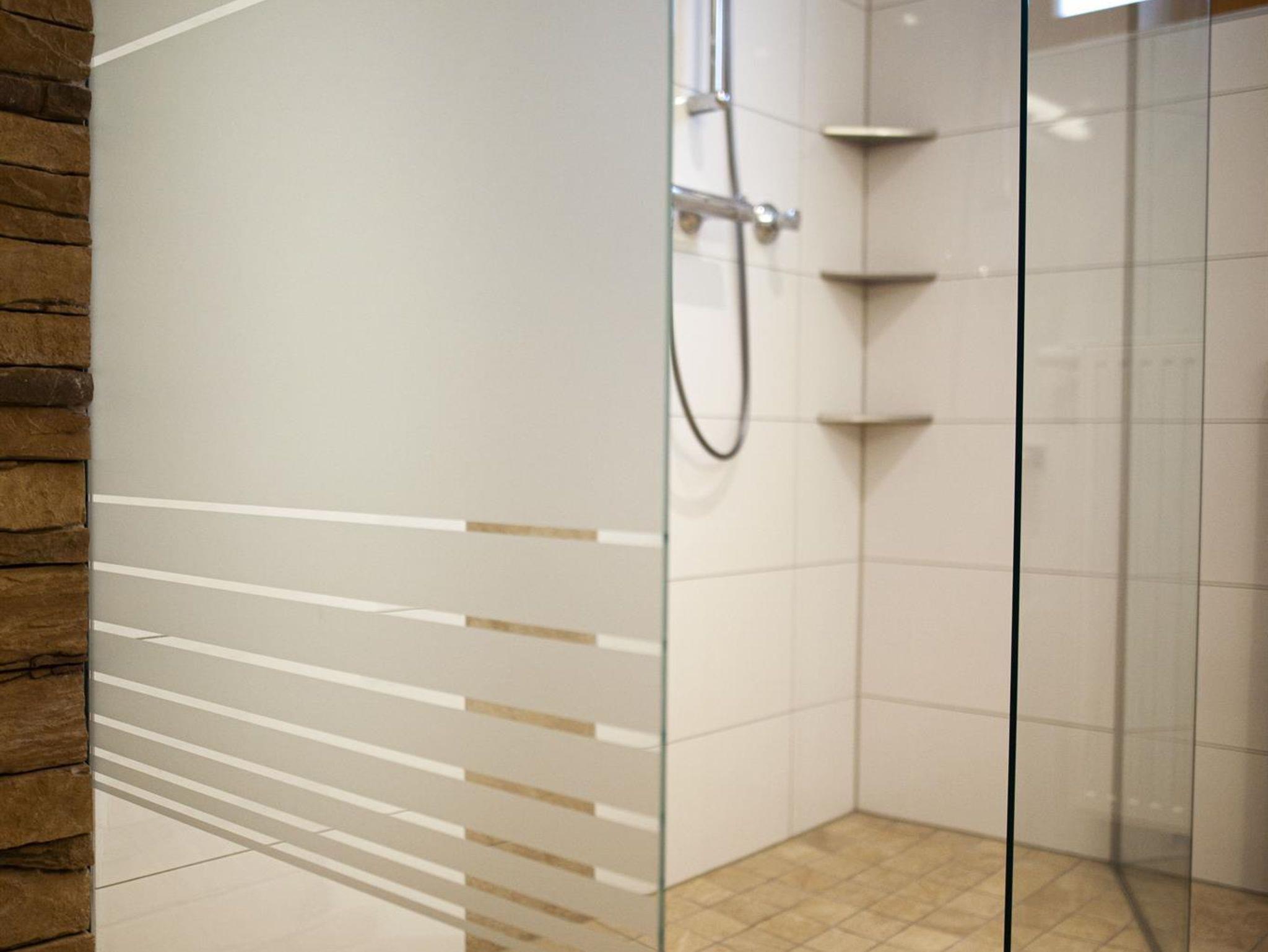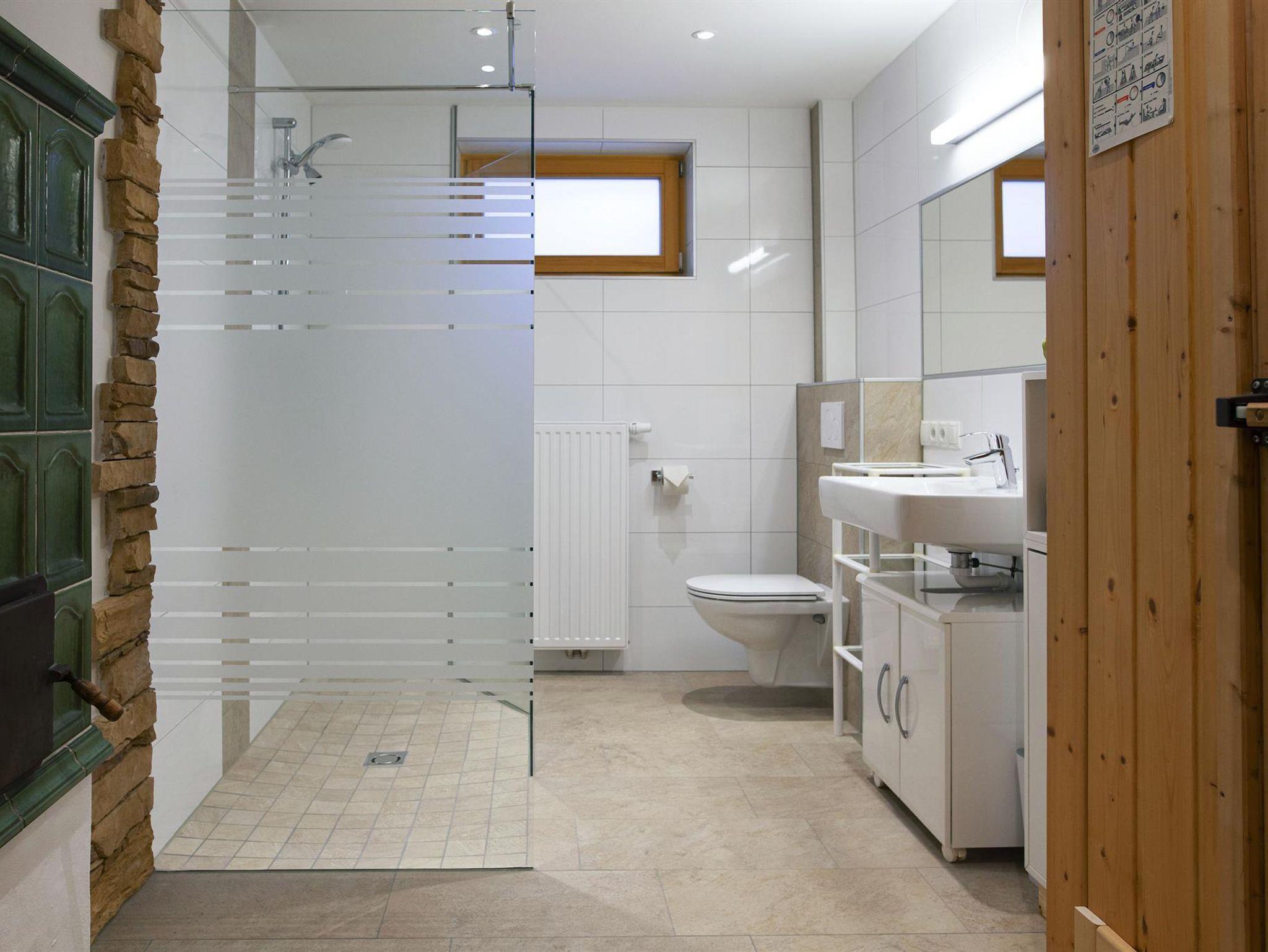 Großes familiengerechtes Badezimmer mit Walk-In Dusche und WC. Die geräumige finnische Sauna bietet Aufgussmöglichkeit für Öle und Kräuter. Haarfön, Handtücher und Saunaöle sind vorhanden.
