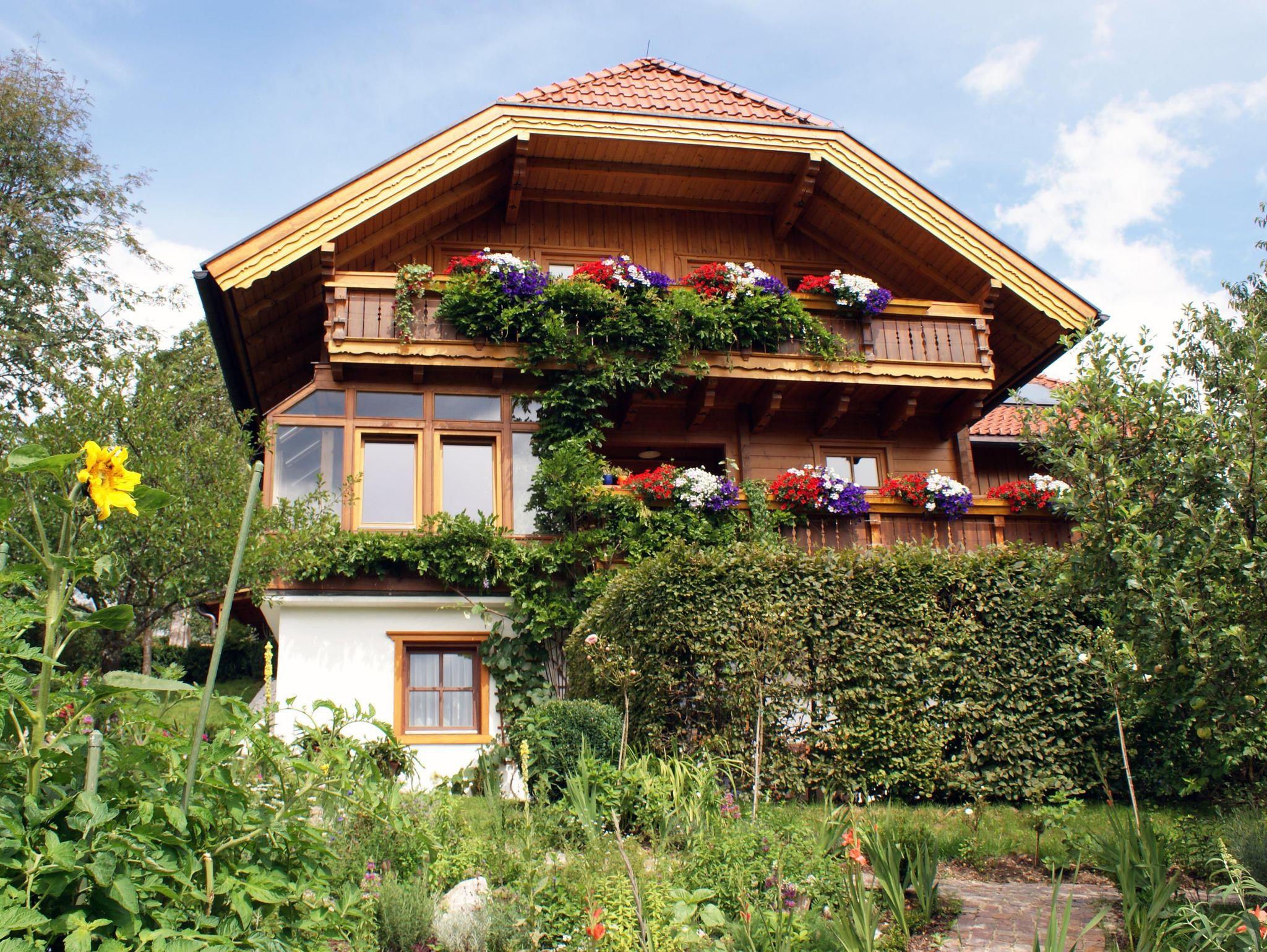 Holz-Bio-Appartement Dachstein verfügt über 2 Stockwerke, einen Balkon mit Gartenzugang, eine geräumige Infrarotsauna, ein Badezimmer und ein seperates WC. Carport Platz für 1 Auto inkludiert.
