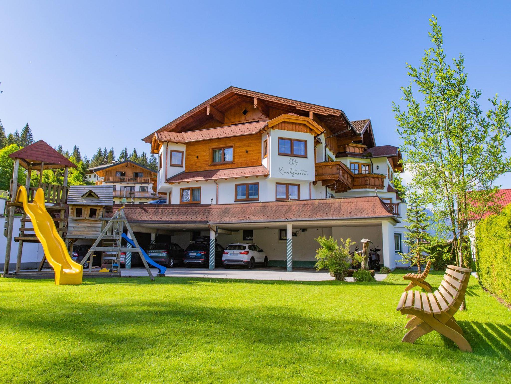 Erleben Sie traumhafte Urlaubstage in unserer 3 Sterne Pension Landhaus Kirchgasser in Ramsau am Dachstein. Umgeben von blühenden Wiesen und grünen Wäldern, mit einzigartiger Panoramasicht auf den Dachstein. Ideal für den sportlich aktiven und erholsamen Urlaub zu jeder Jahreszeit. Die erstklassige Lage ermöglicht Ihnen im Winter den direkten Einstieg in das 220km umfassende Loipennetz sowie auf die 70km präparierten Winterwanderwege. Sie befinden sich inmitten des familienfreundlichen Skigebietes - “Kali`s Erlebnispisten” von Ramsau am Dachstein. In nur 5 Fahrminuten sind Sie am bekannten Rittisberg mit der beleuchteten Nachtrodelbahn. Der Dachstein Gletscher ist 10km und das Skigebiet in Schladming-Dachstein 7,5km von uns entfernt. Im Sommer befinden sich zahlreiche markierte Wanderwege, Mountainbike - und 8 verschiedene Nordic Walking Strecken direkt vor der Haustür. Einen ganz besonderen Spaßfaktor für die ganze Familie verspricht die Slalom Kard Bahn “Formel 1 der Berge” die Sie in 5 Gehminuten erreichen. Unsere drei komfortablen Ferienwohnungen namens: Dachstein, Rittisberg oder Tauern bieten Platz für 2 - 5 Personen. Jede Ferienwohnung empfängt Sie mit gemütlichen Schlafzimmern und einer voll ausgestatteten Wohnküche mit einladender Sitzecke. Zusätzlich bieten wir Ihnen vier weitere liebevoll ausgestattete Studios mit 32m² bis 36m² und ein geräumiges Doppelzimmer. Alle Kategorien haben einen W-Lan Anschluss, sind mit hellen Holzmöbeln eingerichtet und verfügen über einen eigenen sonnigen Balkon oder Terrasse. Genießen Sie die frische und klare Bergluft oder erleben Sie einen einzigartigen Sonnenuntergang. Zum Frühstück bieten wir unseren Gästen im Landhaus Kirchgasser ein reichhaltiges Frühstücksbuffet mit regionalen und hauseigenen Bio Produkten wie frischem Obst, einer Auswahl an Müslis, selbstgemachten Fruchtsäfte und Marmelade. Auf Wunsch gibt es am Abend ein 4 Gänge Menü. Ruhe und Entspannung finden Sie in unserem modernen Wellnessbereich. Nach einem anstrengendem Urlaubstag erholen Sie sich in der Dampfsauna, Infrarotkabine, finnischen Sauna, ruhen auf den Wärmebänken oder Panoramaliegen mit freiem Blick auf den imposanten Dachstein. Ein besonderes Erlebnis für unsere Gäste, ist der beheizte Whirlpool auf der Außenterrasse der Sommer wie Winter gerne genutzt wird. Auf unserem Spielplatz gleich neben dem Haus, können sich die Kinder beim Gokart fahren, auf der Schaukel, im Spielhäuschen und am Trampolin so richtig austoben. Im Winter bietet unsere Wiese viel Spielraum für Schneeballschlachten, zum Iglu bauen oder einfach zum Herumtollen. Verbringen Sie Ihren wohlverdienten Urlaub mit Ihrer Familie im schönen Landhaus Kirchgasser in Ramsau am Dachstein! Ihre Familie Kirchgasser