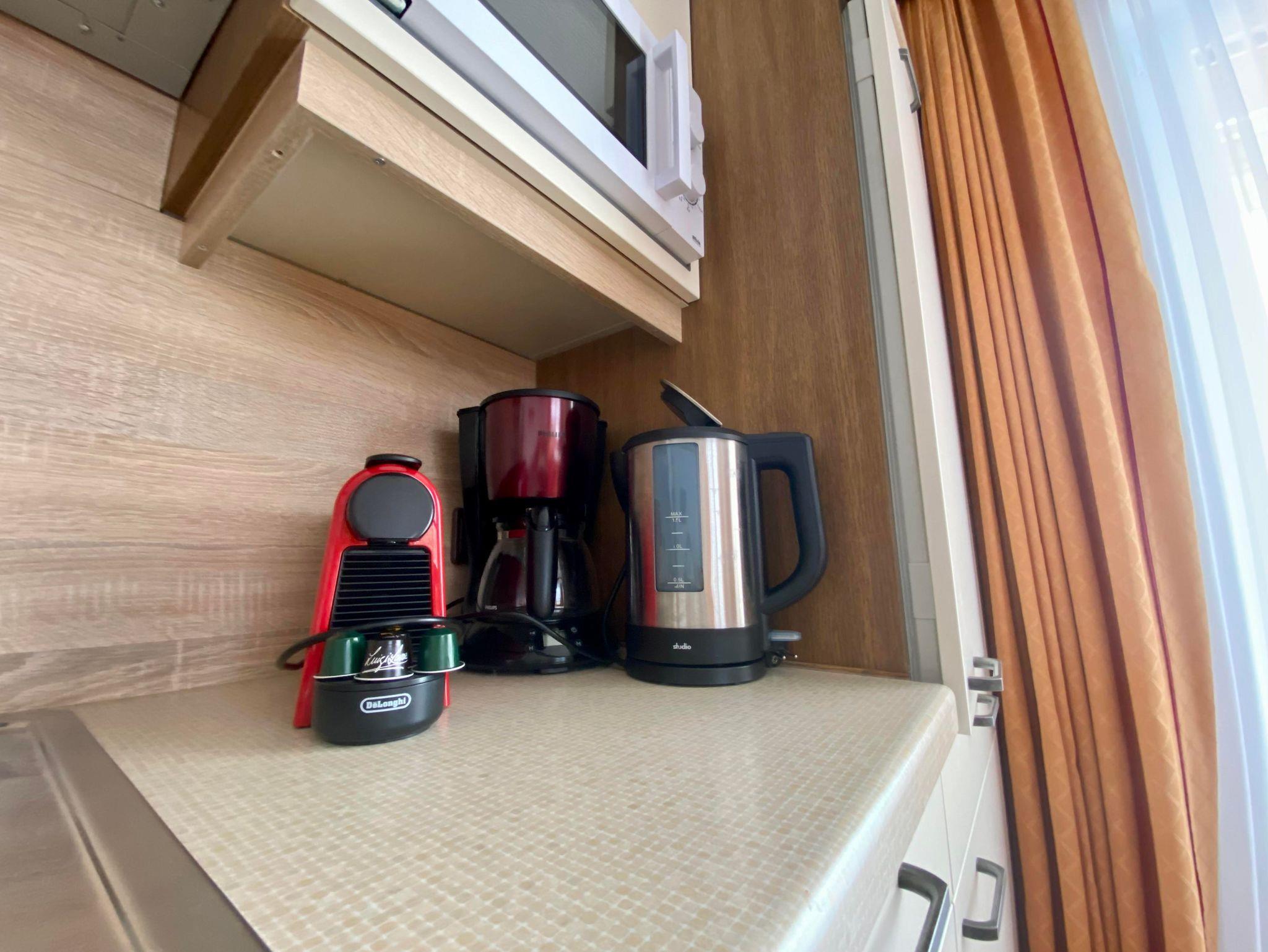 Die Wohnung (55m²) besteht aus einem Schlafzimmer mit Doppelbett, einem separatem Zimmer mit Stockbett und eigenem Badezimmer, Wohnschlafzimmer mit ausziehbarer Couch, Dusche/WC, Vorraum, komplett eingerichtete Küchenzeile, Backofen, Mikrowelle, Geschirrspüler, Telefon, Kühlschrank, Sat TV und Balkon.