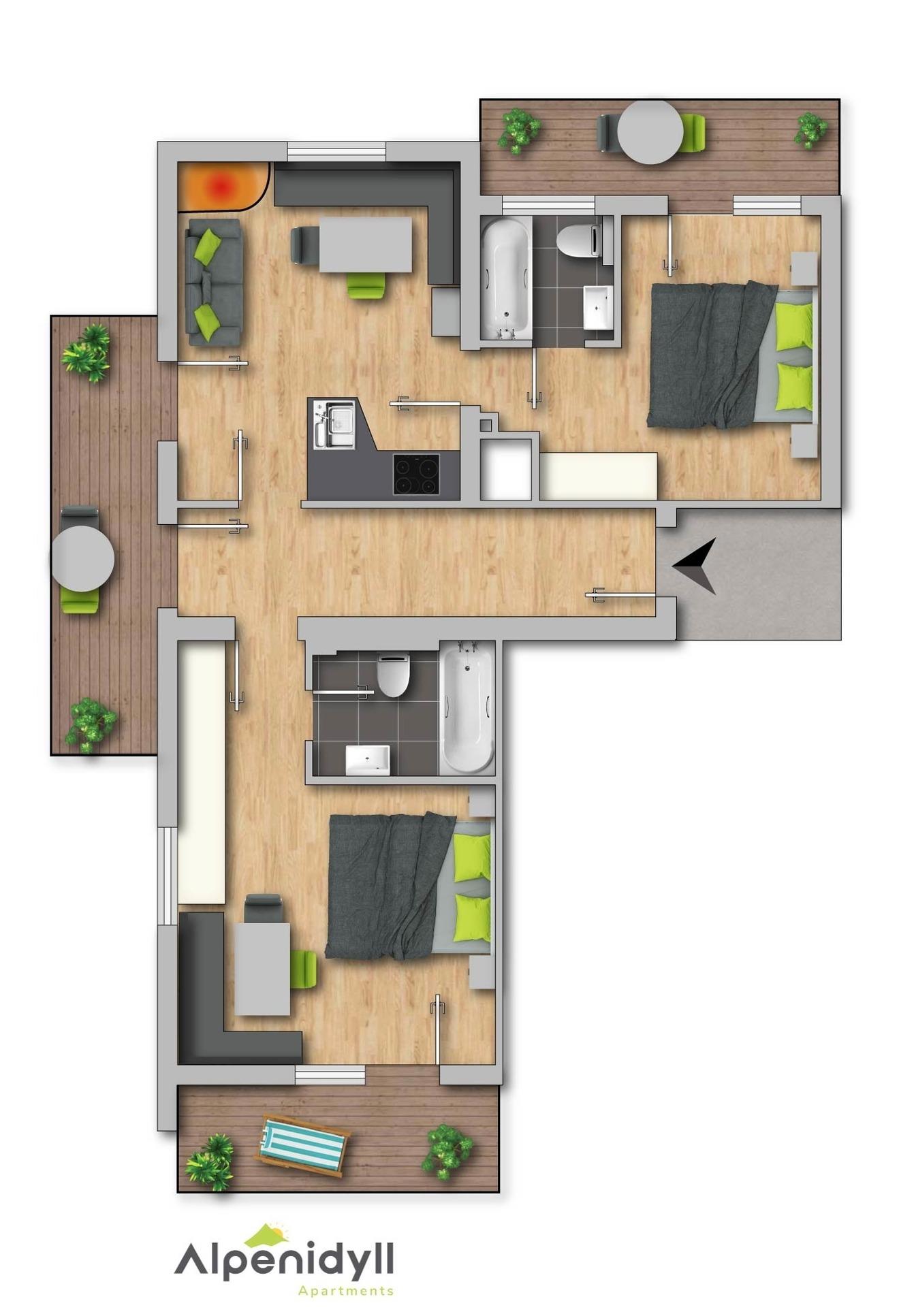 Die gemütlich eingerichtete Wohnung besteht aus zwei Schlafzimmern, einer Wohnküche mit ausziehbarer Couch, zwei Bädern und 3 Balkonen mit traumhaftem Rundumblick.