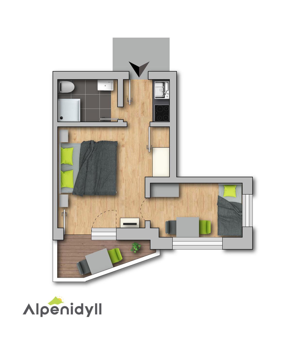 Dieses gemütliche kleine Apartment bietet auf rund 27m² einen Südbalkon, kostenloses WLAN sowie Kabel-TV, eine voll ausgestattete Küchenzeile abgetrennt vom Schlafzimmer, einen Wohnbereich mit Schlafsofa und einem Esstisch mit Stühlen.