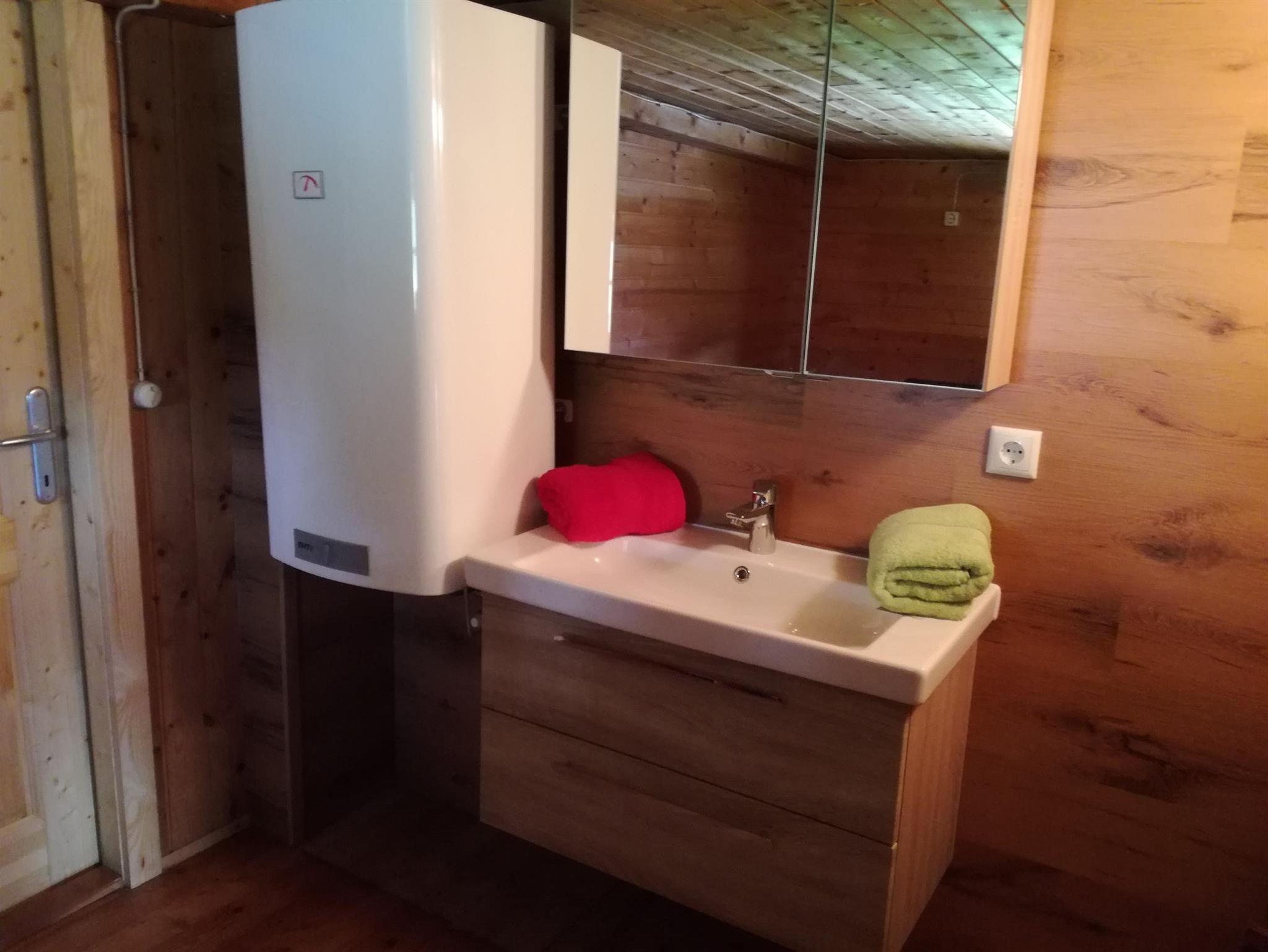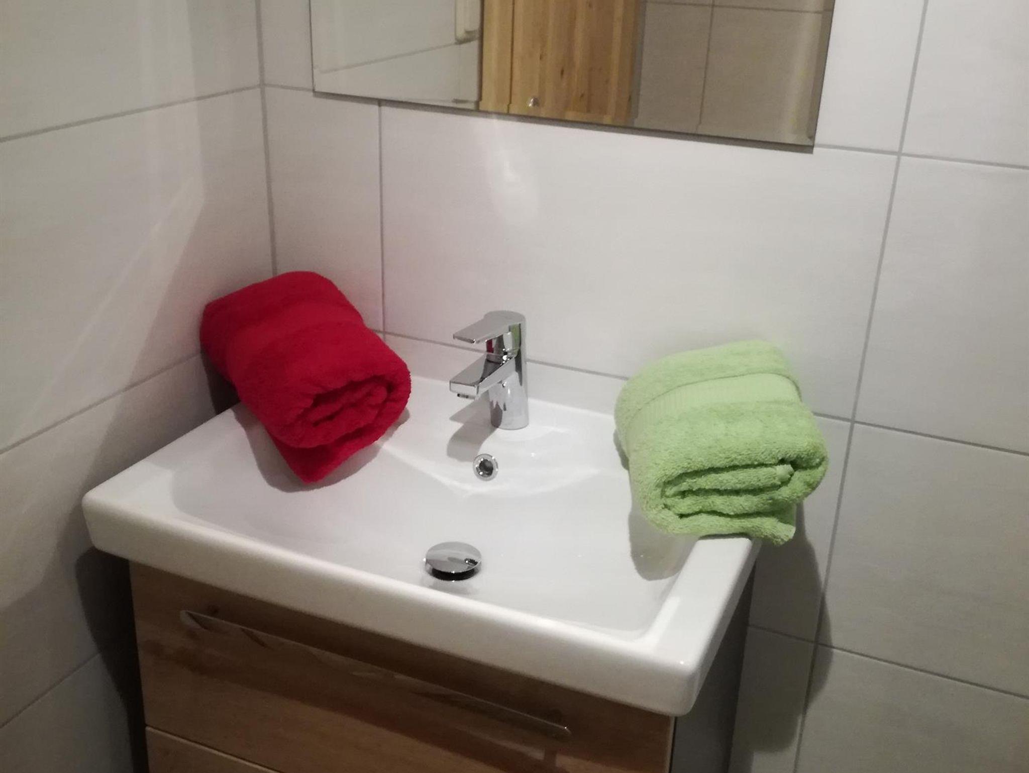 • Badezimmer mit Dusche und WC, Waschbecken und Infrarotheizung.