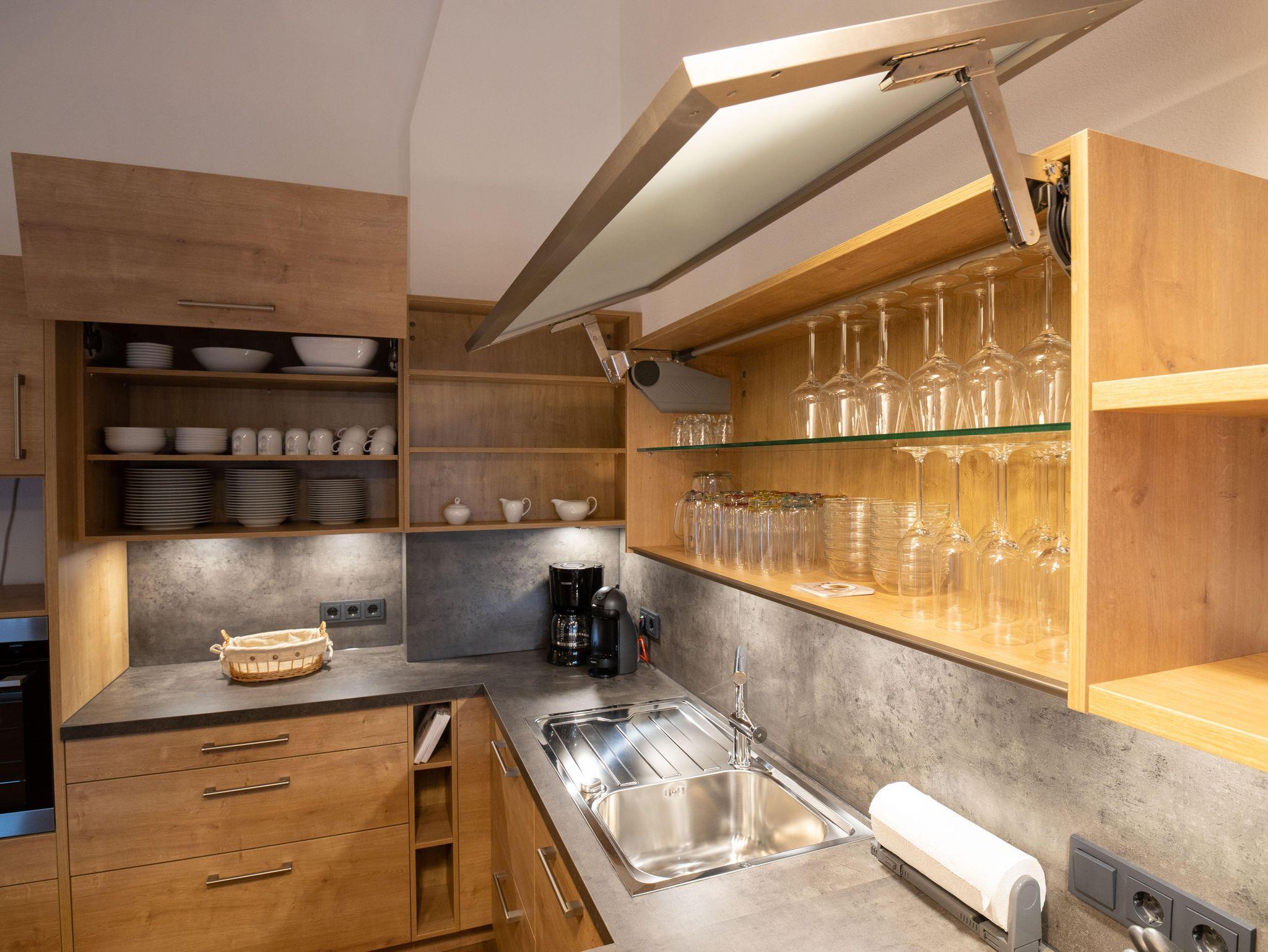Kühlschrank, Gefrierfach, Elektroherd, Töpfe, Pfannen, Backofen, Mikrowelle, Geschirrspüler, Kaffeemaschine, Wasserkocher, Toaster, Eierkocher, Mixer, Geschirr & Besteck