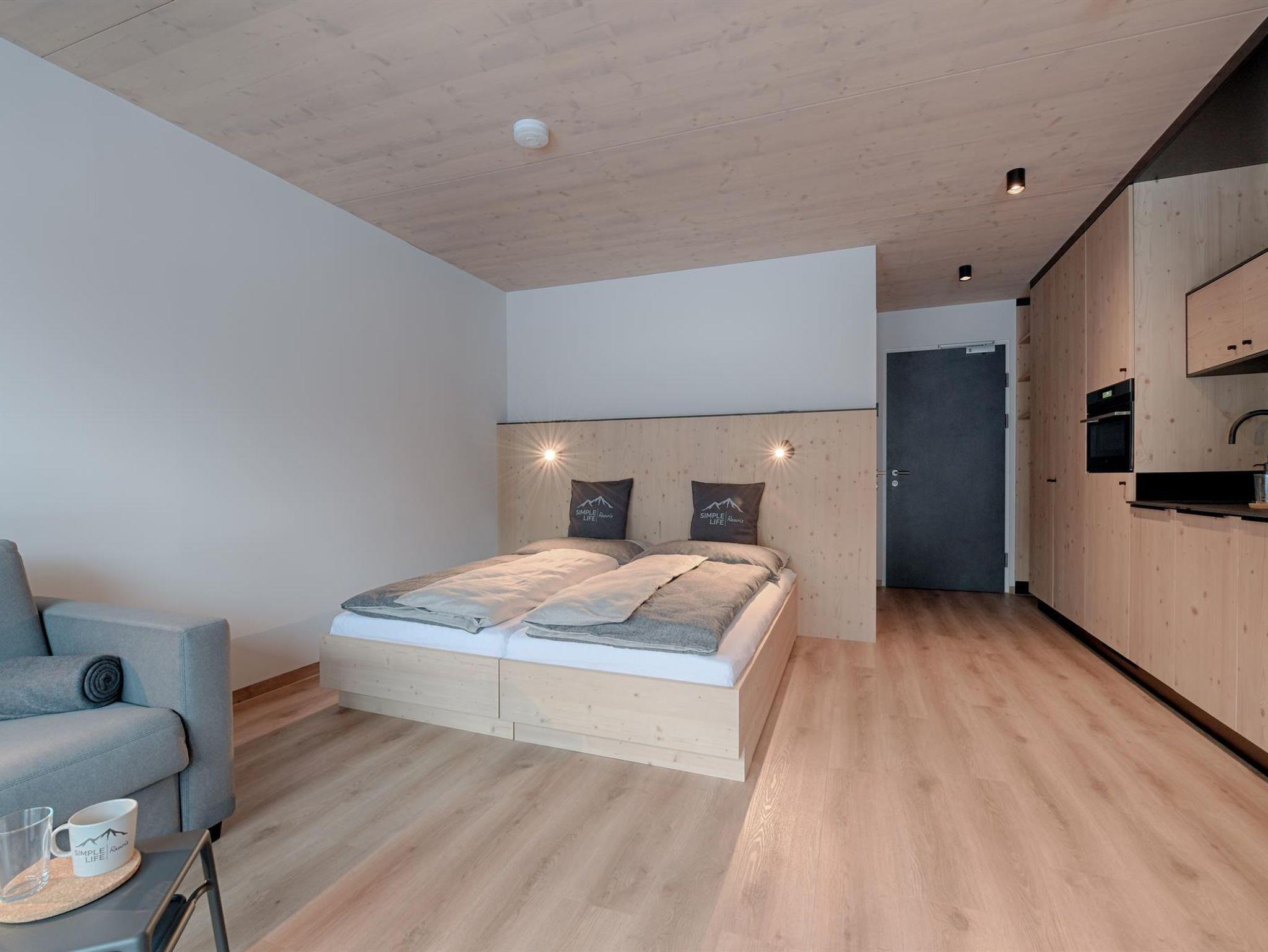 Unsere großzügigen 1 Zimmer Apartments punkten mit trennbaren Doppelbett, gratis WLAN, neueste Technologie (elektronischem Zutrittssystem, mobiler Handy Schlüssel), großen Terrassen oder Balkonen und einem besonders angenehmen Raumklima durch den kompletten Massivholzbau.