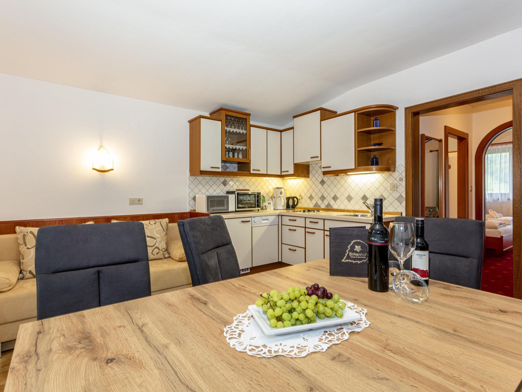 1x Doppelzimmer mit Flat-TV, W-Lan und Balkon, Kinderschlafraum mit Hochbett (1,80 m Bettenlänge), Badezimmer mit Dusche, Doppelwaschtisch, Fön, Seife/Duschbad, Kosmetiktücher, WC separat, Vorraum mit Garderobe, voll ausgestatteter Wohnraum mit Küche, Sitzecke, Liegecouch, Flat-TV, W-Lan, Balkon, Bügeleisen und Bügelbrett, Wäscheständer, Staubsauger,
