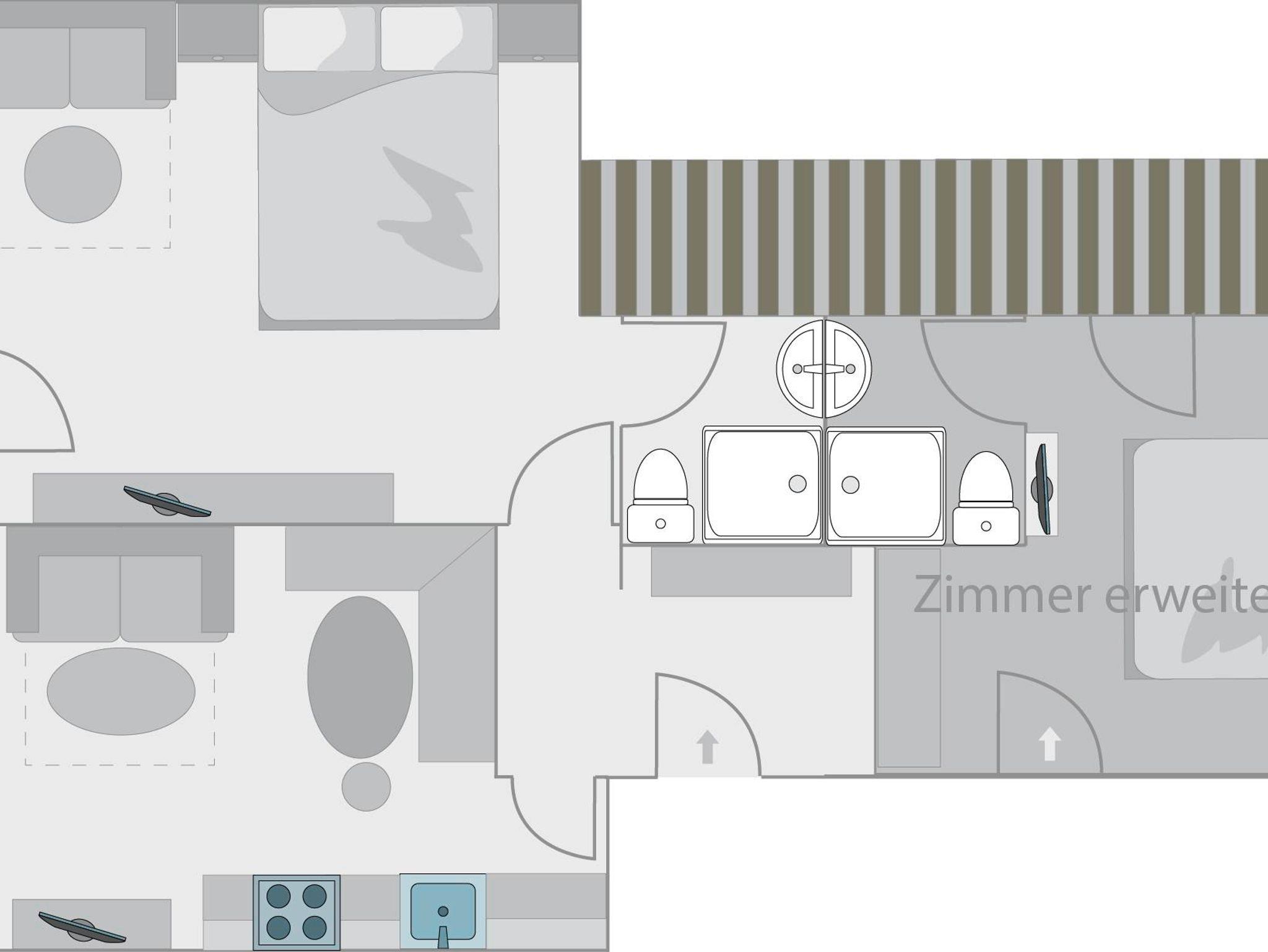 Bei mehreren Erwachsenen Personen ist ein zusätzl. 2.Schlafzimmer mit Flat - TV, DU/WC und Balkon auf Anfrage zubuchbar.