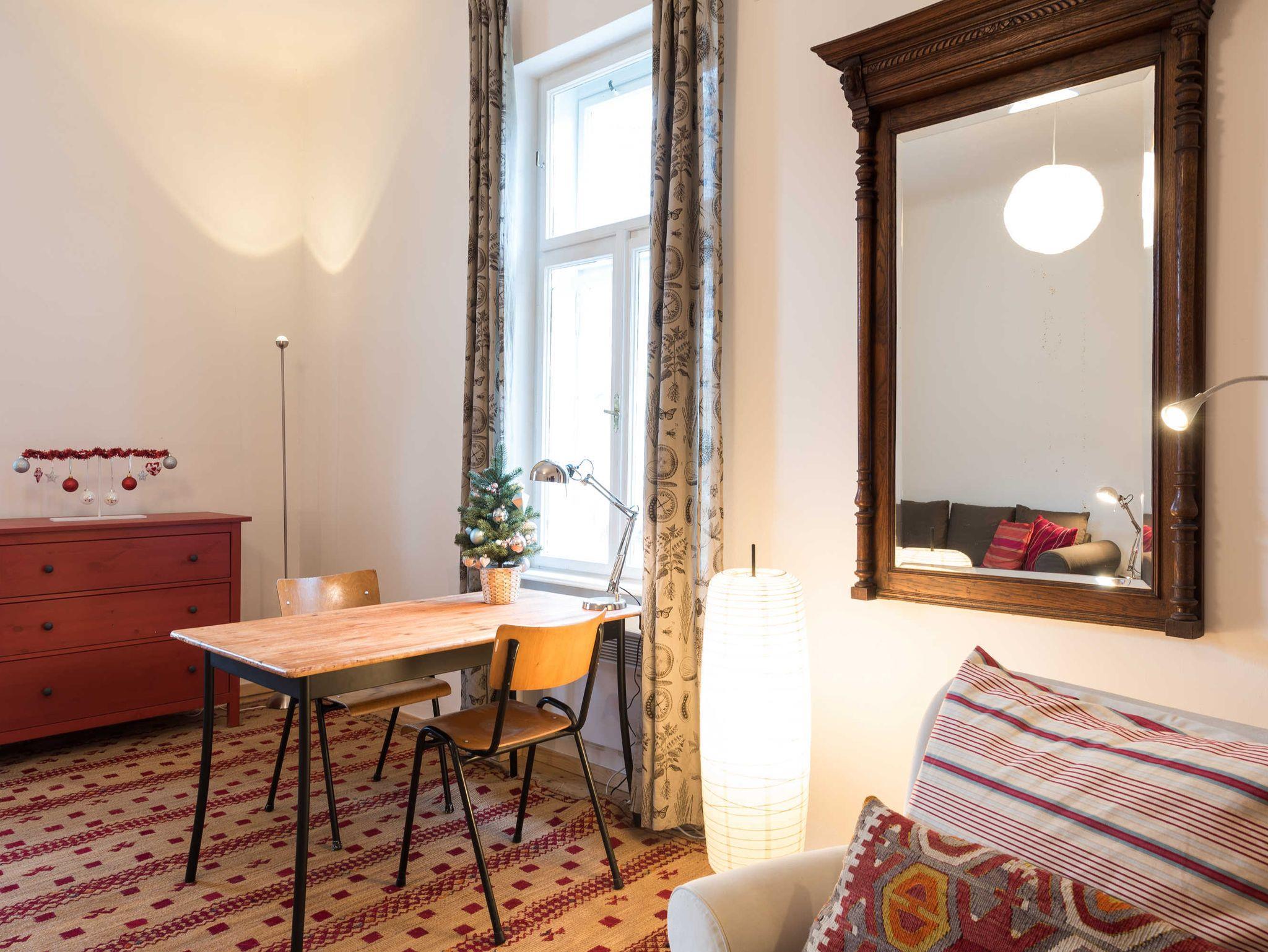 Im 1. Stock gelegene 70m2 Wohnung mit dem Namen Red Otto bietet ein Schlafzimmer mit Doppelbett und Direktzugang zum Badezimmer. In der separaten Küche gibt es einen 100 Jahre alten Dauerbrandofen. Das 30m2 große Wohnzimmer mit Doppelschlafcouch ist mit einem Pelletofen ausgestatten. Im Badezimmer mit Badewanne gibt es eine Fußbodenheizung. 100 Jahre alte Schiffböden, gemütliche Sofas und Lesesessel, Flachbildschirm mit SAT-Anschluss und DVD-Player, sowie eine Auswahl von Filmklassikern für verregnete Abende. Saunazugang und Gartenbenützung inklusive. Die Küche umfasst alles was das Herz begehrt. Wohnzimmer sumptously red - perfekt, um endlich den 1990er Bordeau zu köpfen.