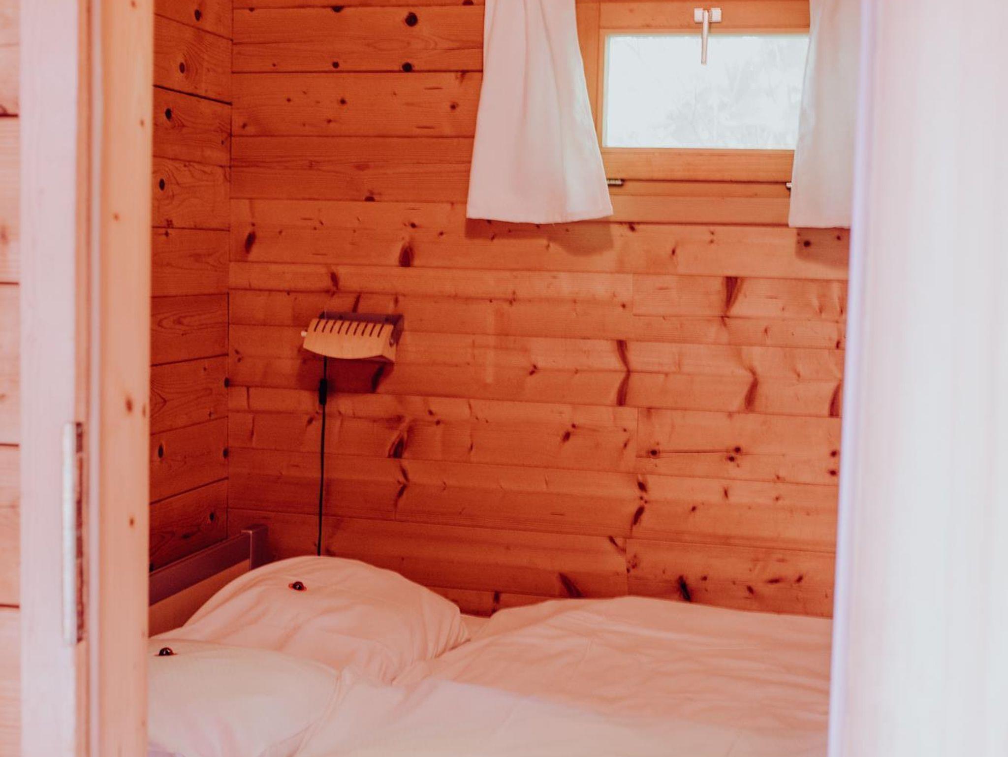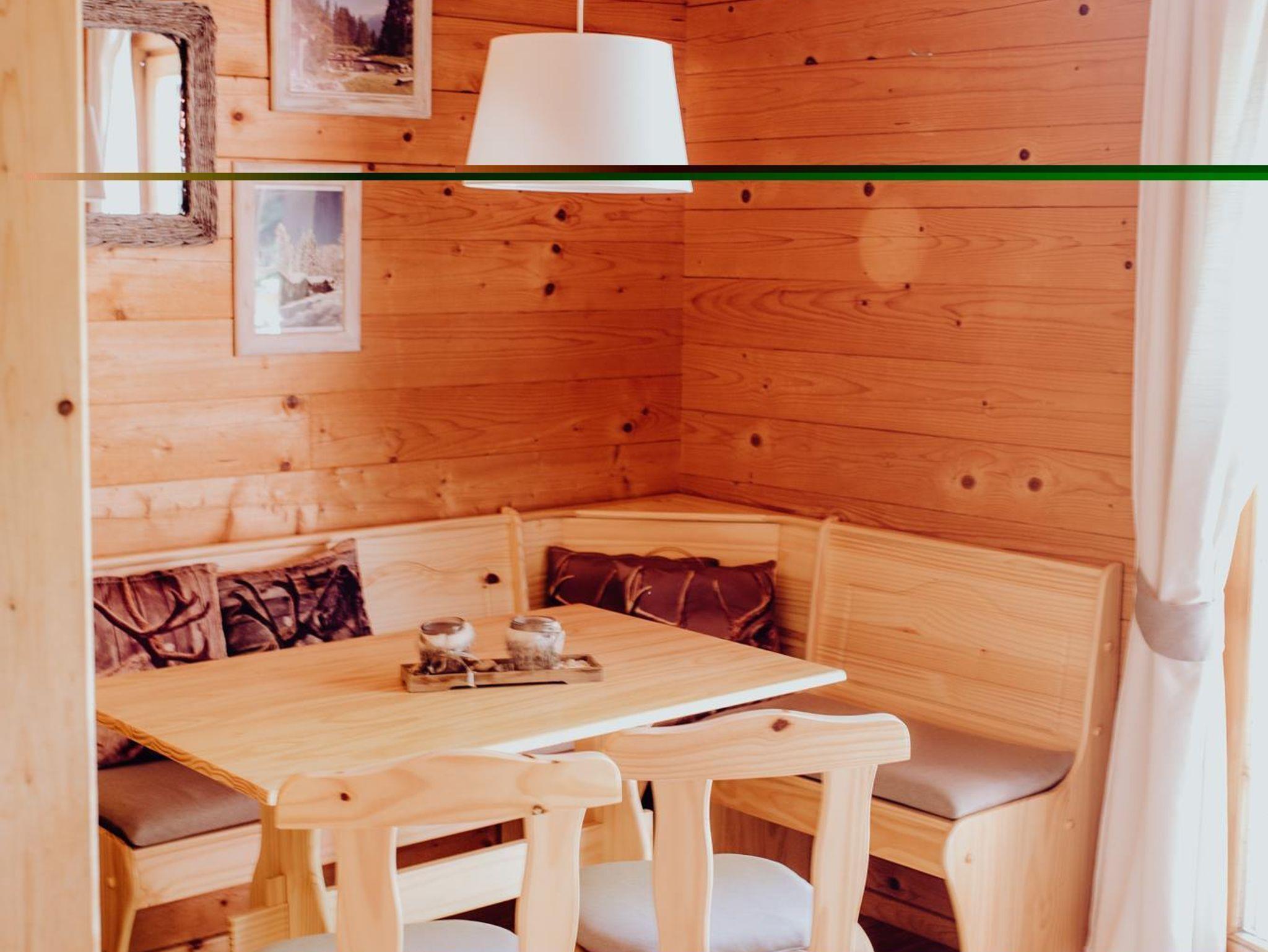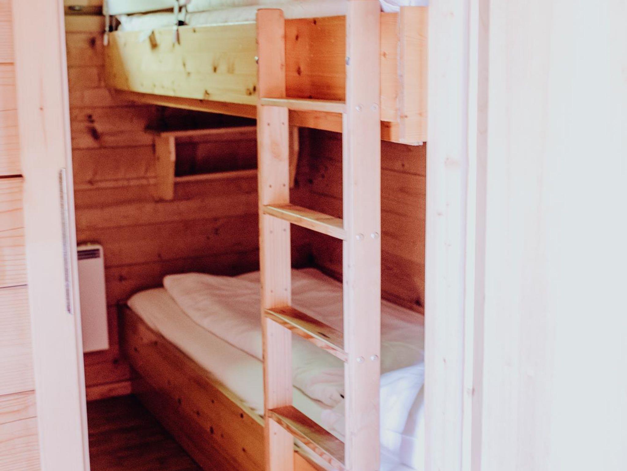 Entdecken Sie unsere Blockhütte C mit Ihren schönen österreichischen Charme. Sie ist unsere geräumigste Blockhütte und umfasst ca. 25m2. Beim Eintritt finden Sie den Wohnbereich mit einem Ecktisch und Stühlen. Die Blockhütte verfügt über 2 separate Schlafzimmer. Im ersten Zimmer befindet sich ein Doppelbett, das andere verfügt über ein Stockbett und ein Einzelbett.