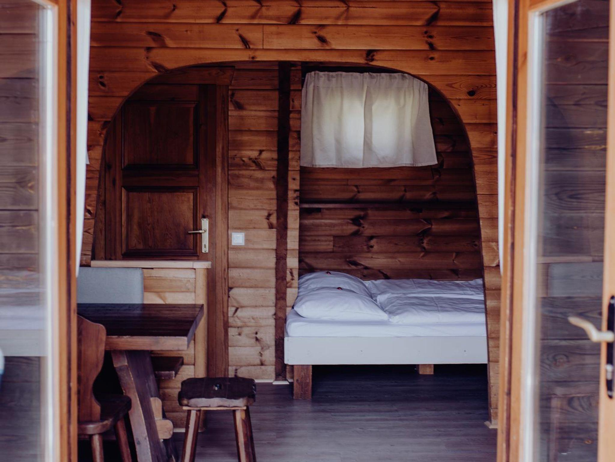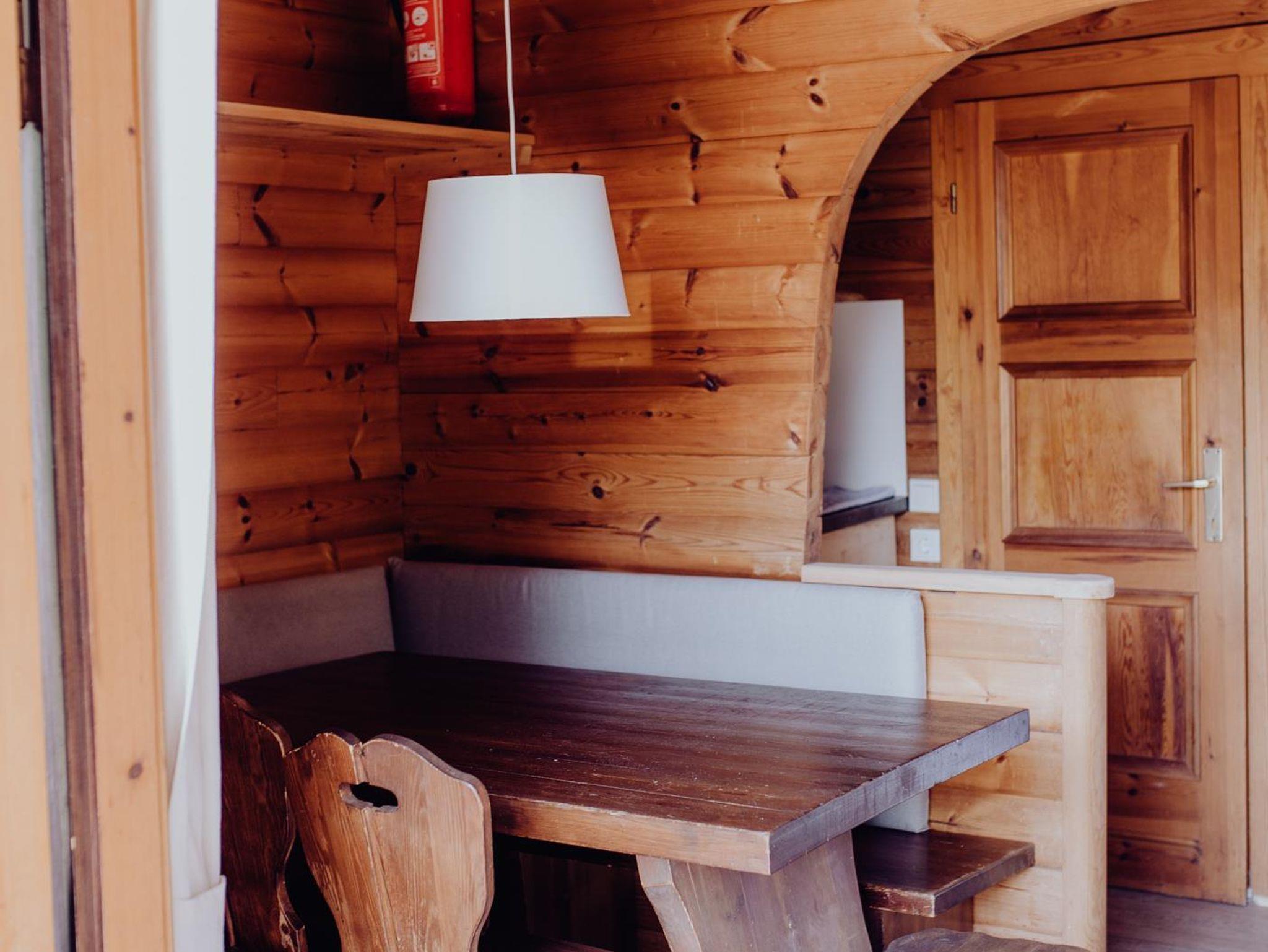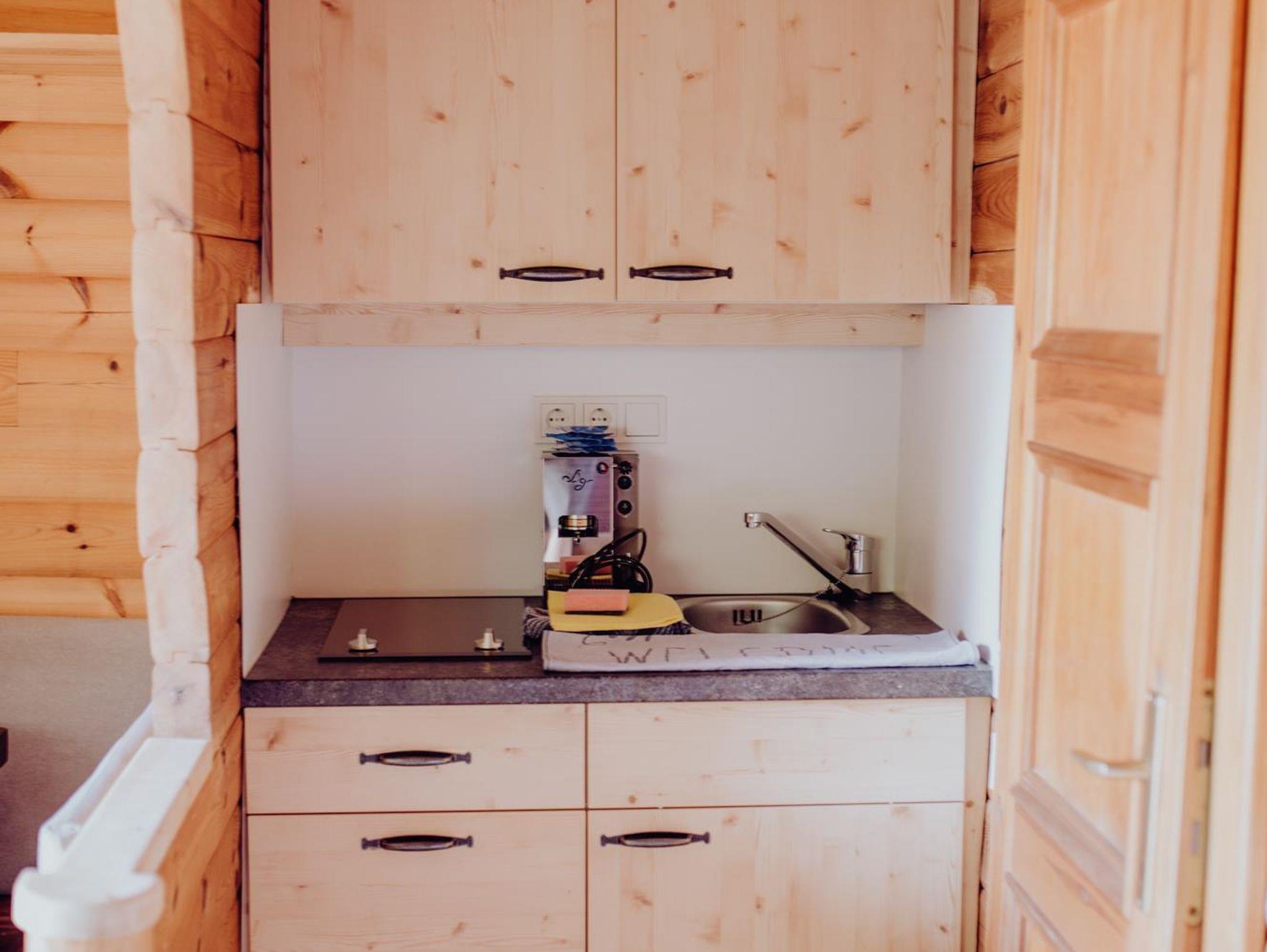 Die Blockhütte B mit ca. 20 m2 ist ein einfache aber charmante Holzhütte, mit typisch österreichischer Gemütlichkeit. Im ersten Raum befindet sich der Wohnbereich und eine Schlafcouch die leicht in ein Bett für eine Person umgewandelt werden kann. Der Wohnbereich verfügt über einen festen Ecktisch mit Stühlen. Zusätzlich befindet sich auf der einen Seite die Küche auf der anderen Seite ein Doppelbett. Dahinter befindet sich in einem separaten Raum ein Schlafzimmer mit einem Etagenbett.