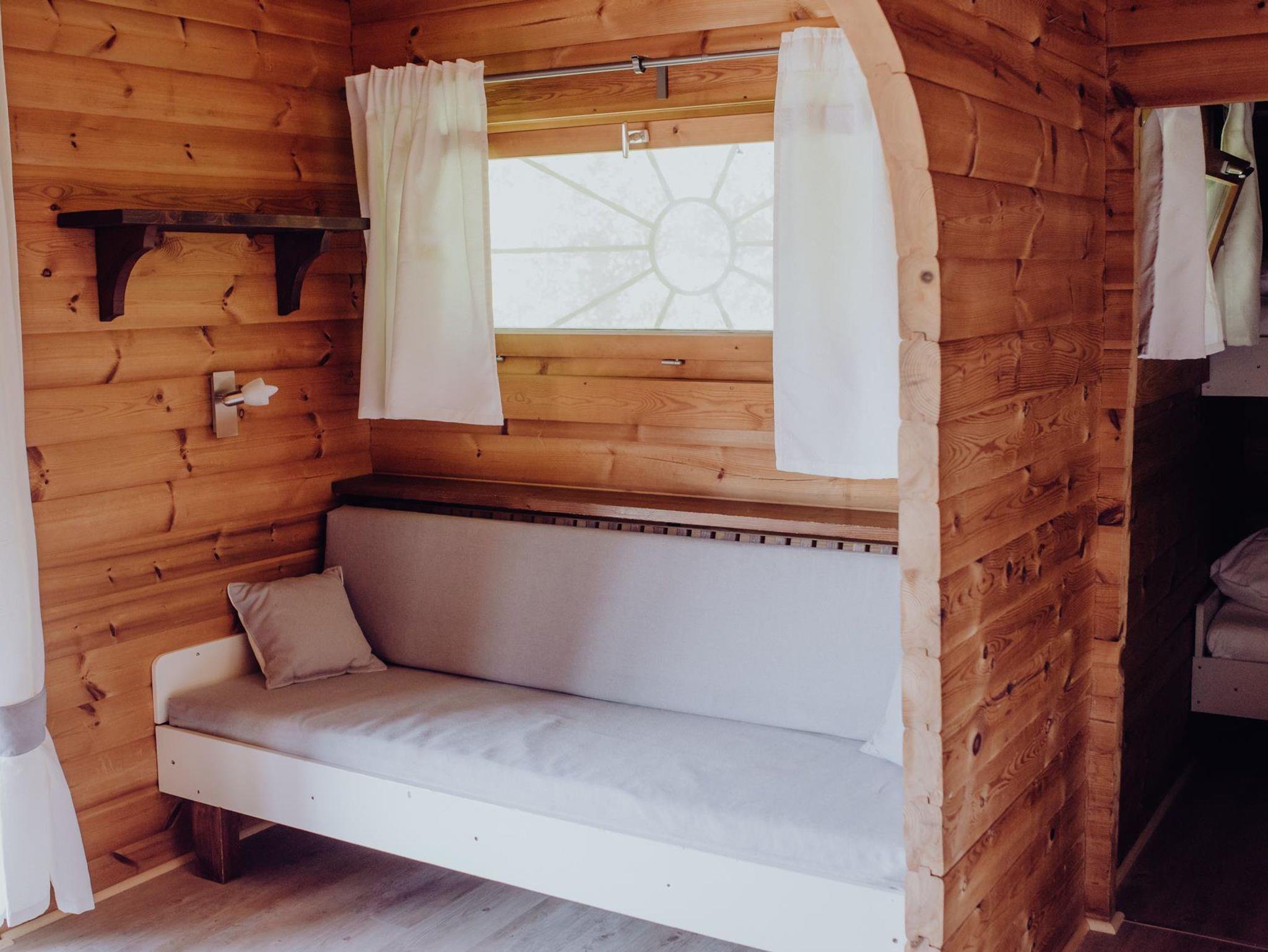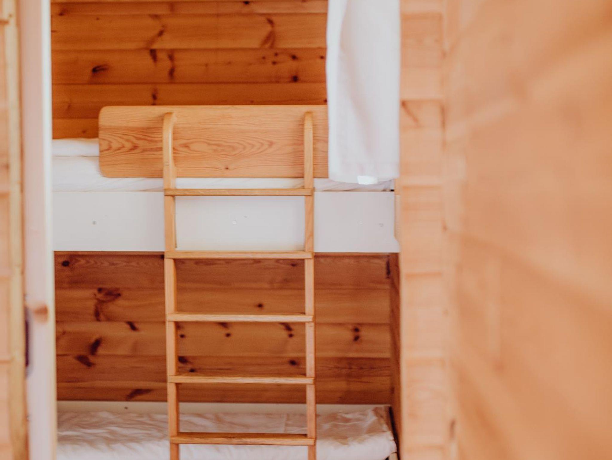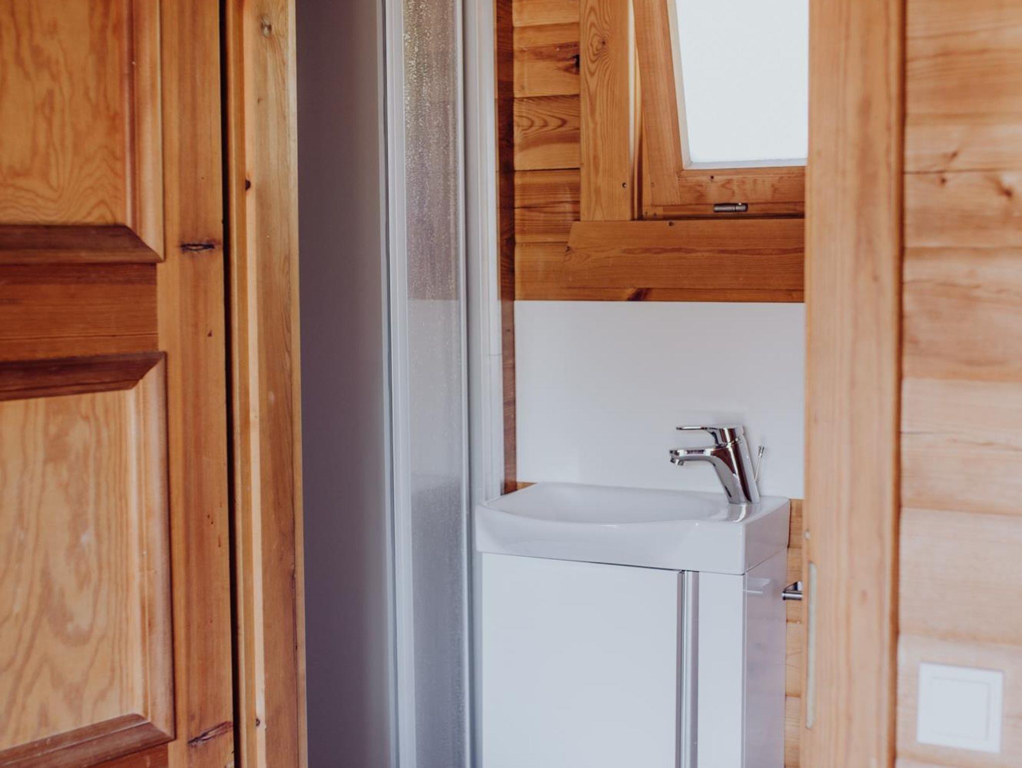 Die Blockhütte B mit ca. 20 m2 ist ein einfache aber charmante Holzhütte, mit typisch österreichischer Gemütlichkeit. Im ersten Raum befindet sich der Wohnbereich und eine Schlafcouch die leicht in ein Bett für eine Person umgewandelt werden kann. Der Wohnbereich verfügt über einen festen Ecktisch mit Stühlen. Zusätzlich befindet sich auf der einen Seite die Küche auf der anderen Seite ein Doppelbett. Dahinter befindet sich in einem separaten Raum ein Schlafzimmer mit einem Etagenbett.