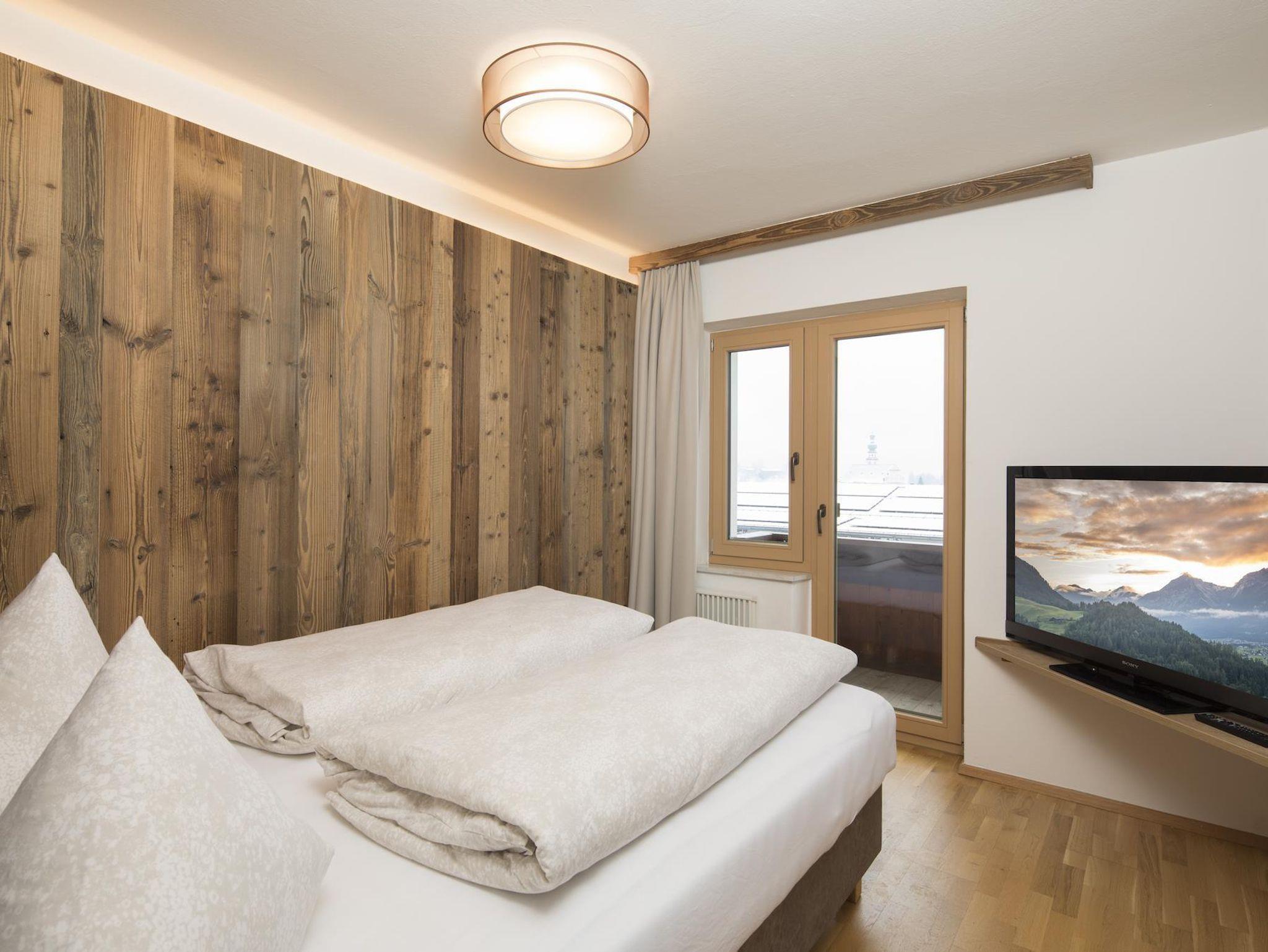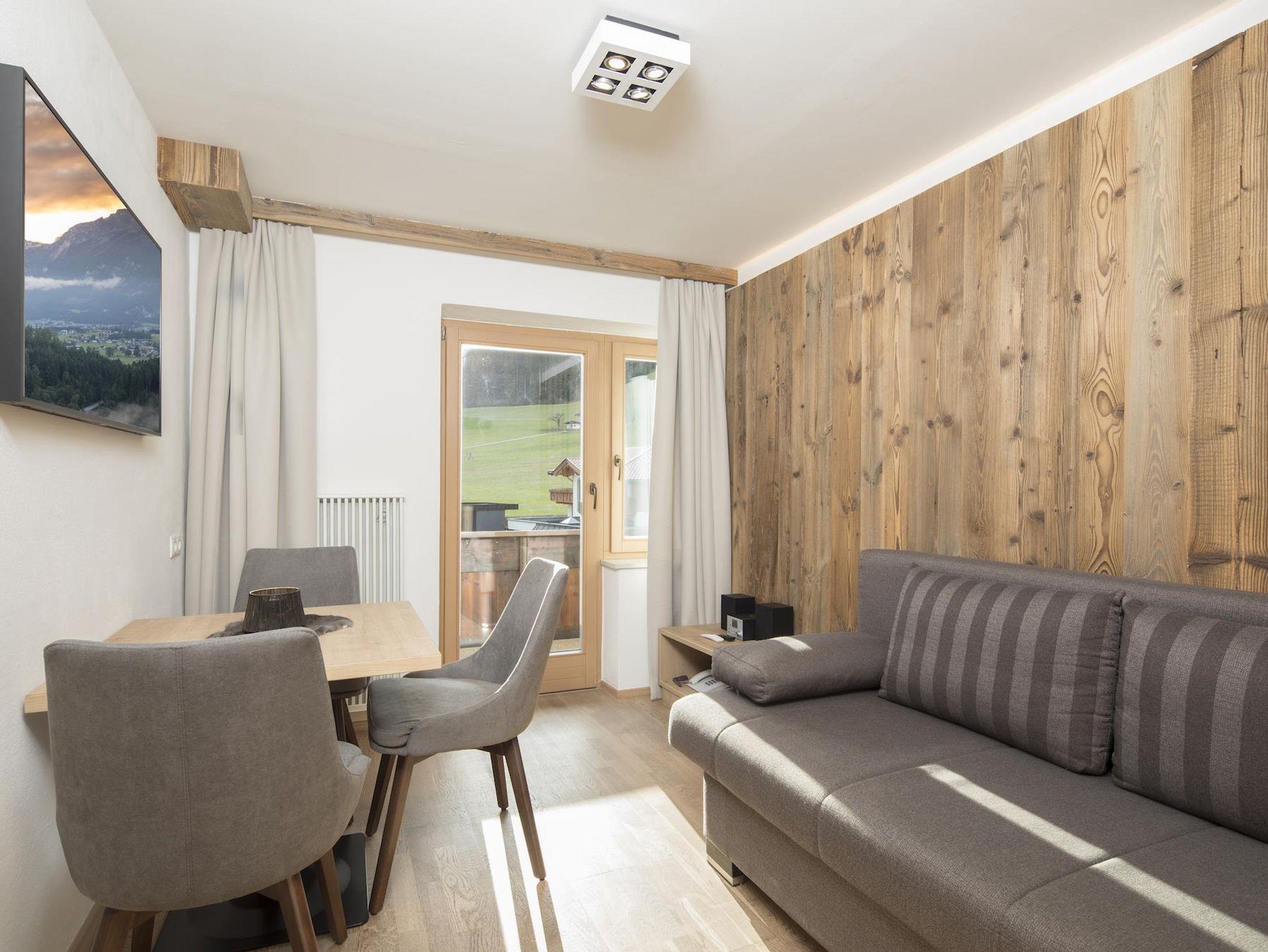 Die Familiensuite Alpenchalet ist mit 65 m2 Wohnfläche großzügig gestaltet und überzeugt mit einem besonders gemütlichen Ambiente sowie einer hochwertigen Ausstattung im alpinen Chalet-Stil. Die Suite verfügt über eine große mit Zirbenholz getäfelte Bauernstube mit Kachelofen und Esstisch sowie zwei Schlafzimmer für bis zu fünf Personen (1 Schlafzimmer mit einem Boxspring-Doppelbett und einem zusätzlichen Einzelbett sowie 1 Schlafzimmer mit einem Boxspring Doppelbett). Bei unseren Gästen besonders beliebt sind die große südseitige Terrasse und die zwei Balkone. In der Familiensuite Alpenchalet kann nach Rückfrage maximal ein Zustellbett für eine weitere Person zum Preis von EUR 15,00 pro Übernachtung und ein Babybett (kostenfrei für Kinder bis 2 Jahre) platziert werden.