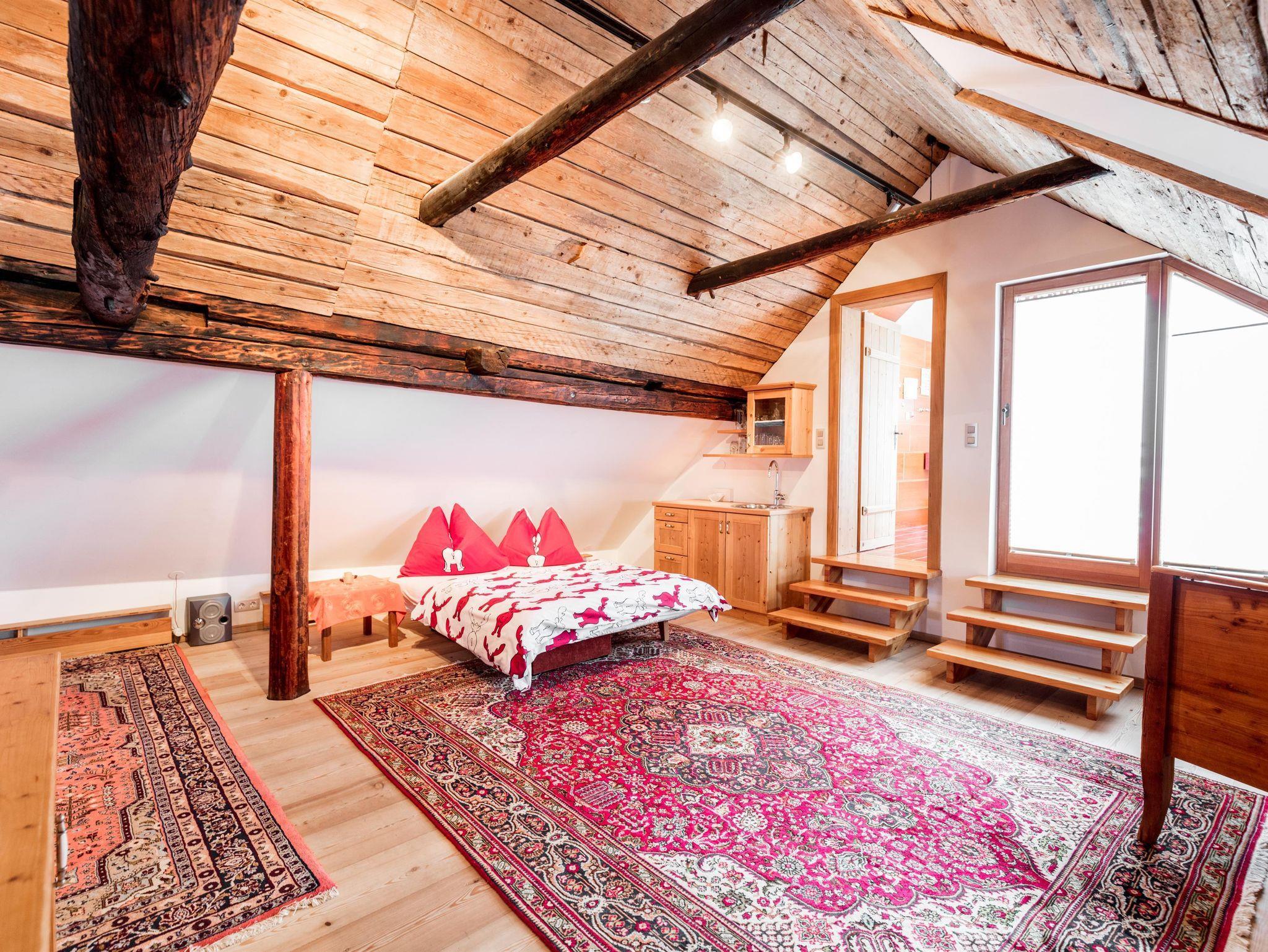 Obergeschoss für 4 bis 10 Personen (ca. 100 m²) Brautzimmer (ehemals Getreidekammer), Panoramazimmer (ehemals Heukammer) mit jeweils 2 Betten, großzügige Dachstube (40 m2) als Ruheraum mit Galerie und Unterdach für weitere Schlafgelegenheiten, Dusche/WC, Sauna, Balkon, Stereoanlage. Erdgeschoss für 4 bis 6 Personen (ca. 100 m²) Schlafkammer, Kinderzimmer, Kreativstube (ehemals Auszüglerstube) mit jeweils 2 Betten, Bad/Dusche und WC und 1 getrenntes WC, große Gardarobe in der Laube, großzügige Wohnstube (ehemals Rauchstube 42 m2) mit Bibliothek und Sat-TV, vollausgestattete Küche (Geschirrspüler, Mikrowelle, E-Herd, Kühl- und Eisschrank, Geschirr etc), Wireless Internet. Hauseingang von der Südseite, sowie separater Zugang über den Wirtschaftsraum bergseitig. Kellerräume – Waterloo (ca. 50 m²) Wellnesszone Waterloo mit Dampfsauna, Erlebnisdusche, Steinwaschbecken, WC, zwei Ovodarien (Ruhezonen, Tepidarium) sowie separat Waschraum (Waschmaschine, Trockner, Bügeleisen), Kellervorraum für Getränkedepot.