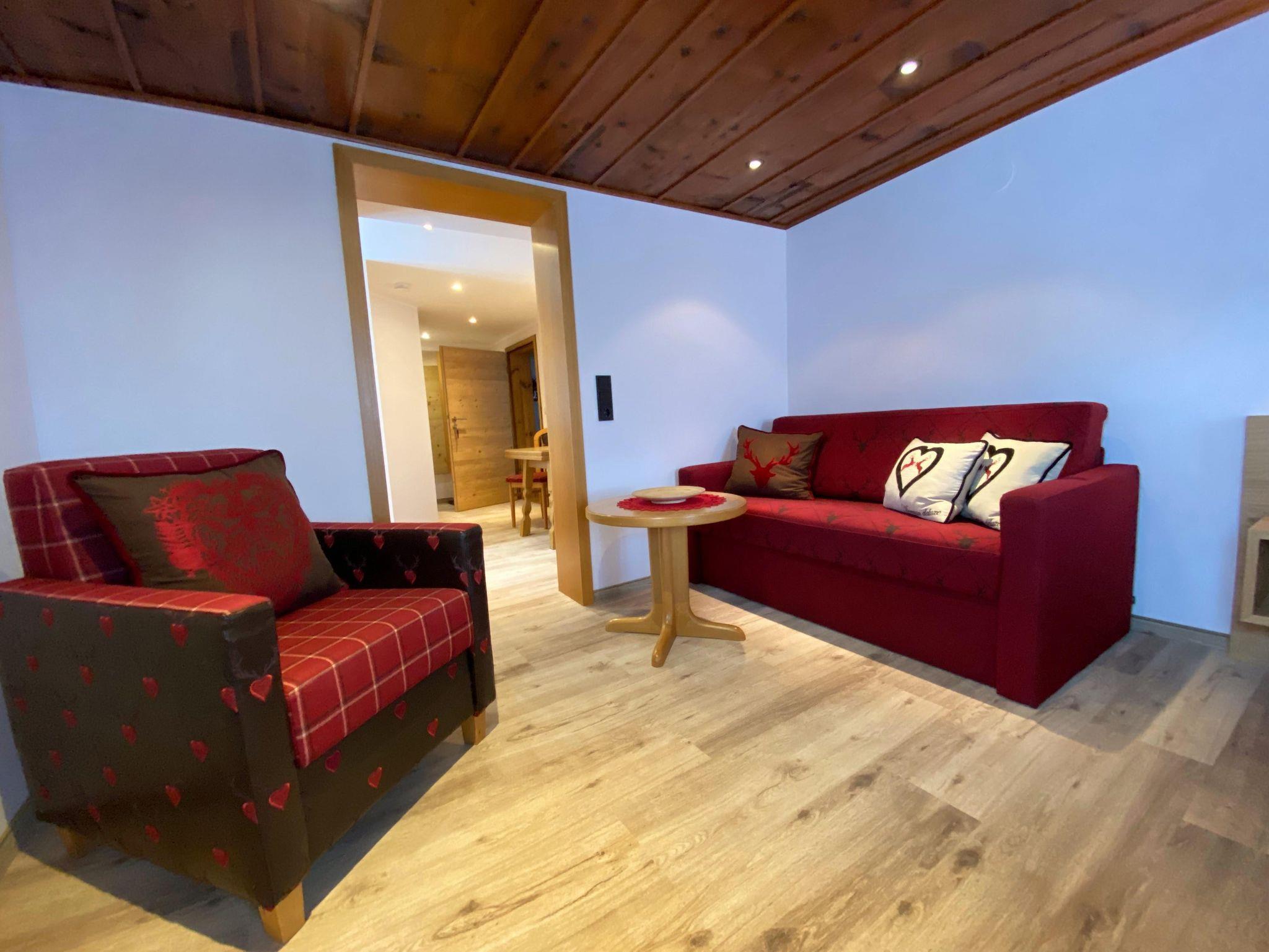Großer Garten mit Liegewiesen. Bus, Bergbahn, Restaurants fünf Gehminuten. Im Sommer Bergbahntickets inklusive.