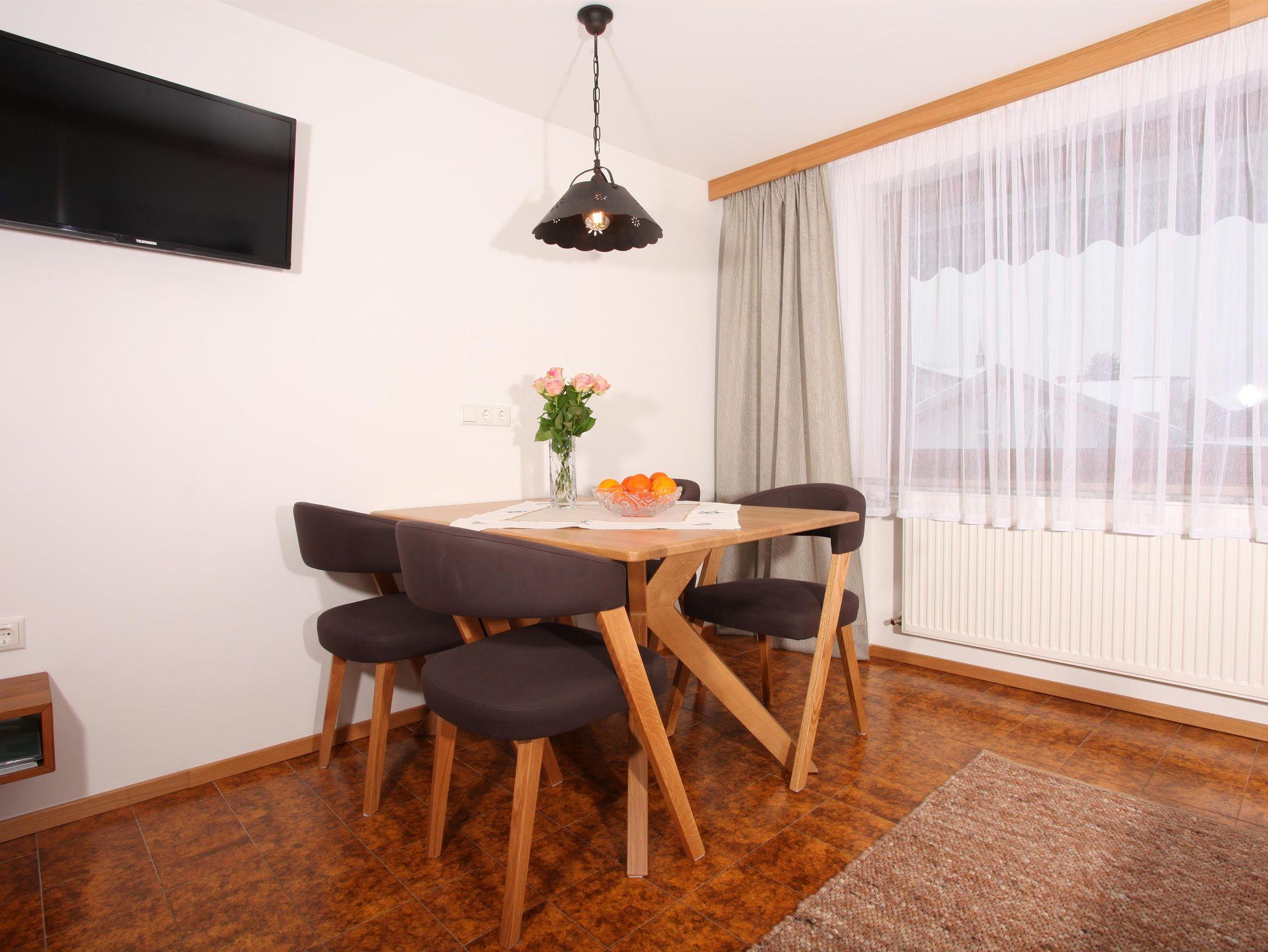 Komfortables Apartment mit 41qm mit großem Wohn- und Schlafbereich. Doppelbett, Ausziehcouch und Sessel, komfortable Essecke, sep.Küche, sep.Dusche, sep. WC. Standard sind Fliesenboden mit Fußbodenheizung, sowie Radiatoren, Telefon, Sat-TV und Safe, W-Lan. Südbalkon mit Markise oder Südterrasse mit Liegewiese sowie Komfortliegestühlen und Bergblick. Brötchenservice oder auf Wunsch Frühstücksservice.