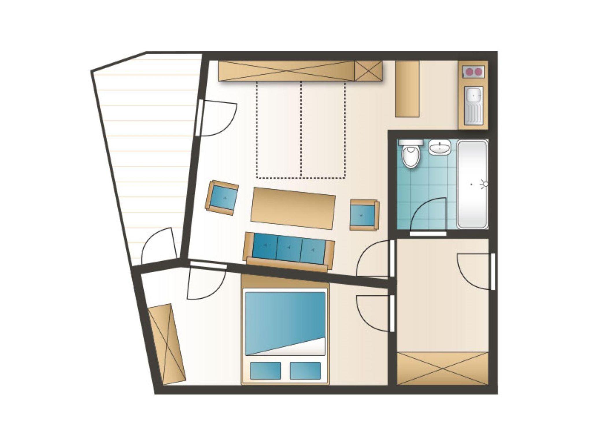 Wohnlich eingerichtetes 2-Raum Appartement für 2 Personen mit Doppelbett im Schlafzimmer. Das Appartement verfügt über einen Wohnbereich mit Kochnische, einen privaten Balkon, ein Bad mit Dusche oder Wanne und Flatscreen-TV. Von Mai bis November ist das Bergbahnticket inklusive.