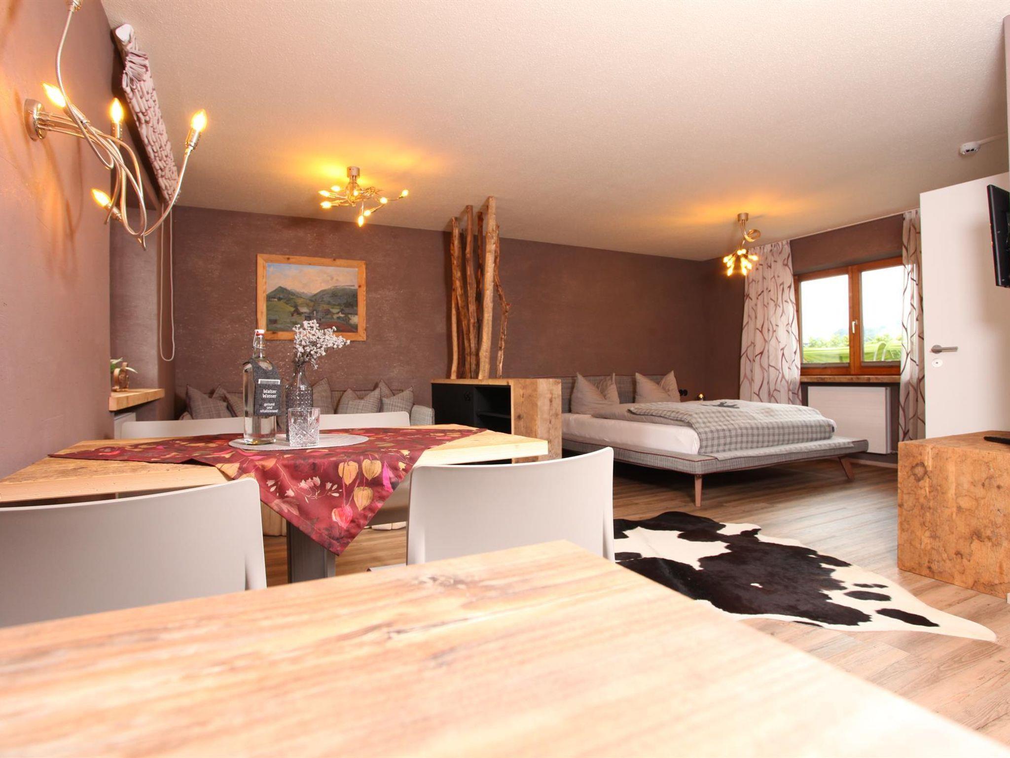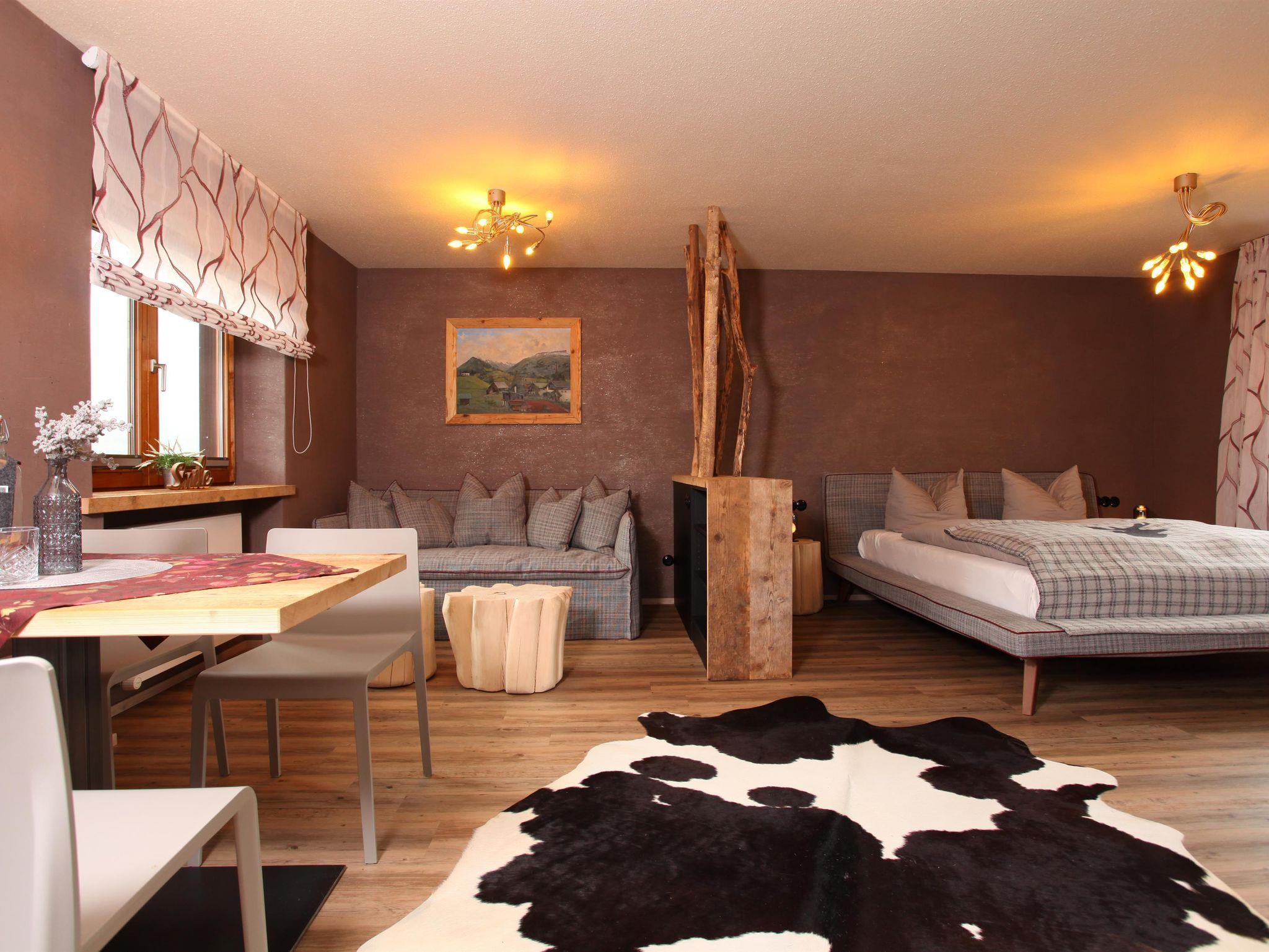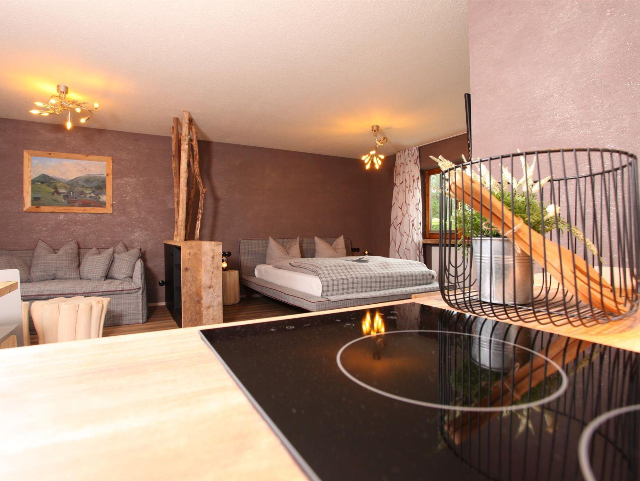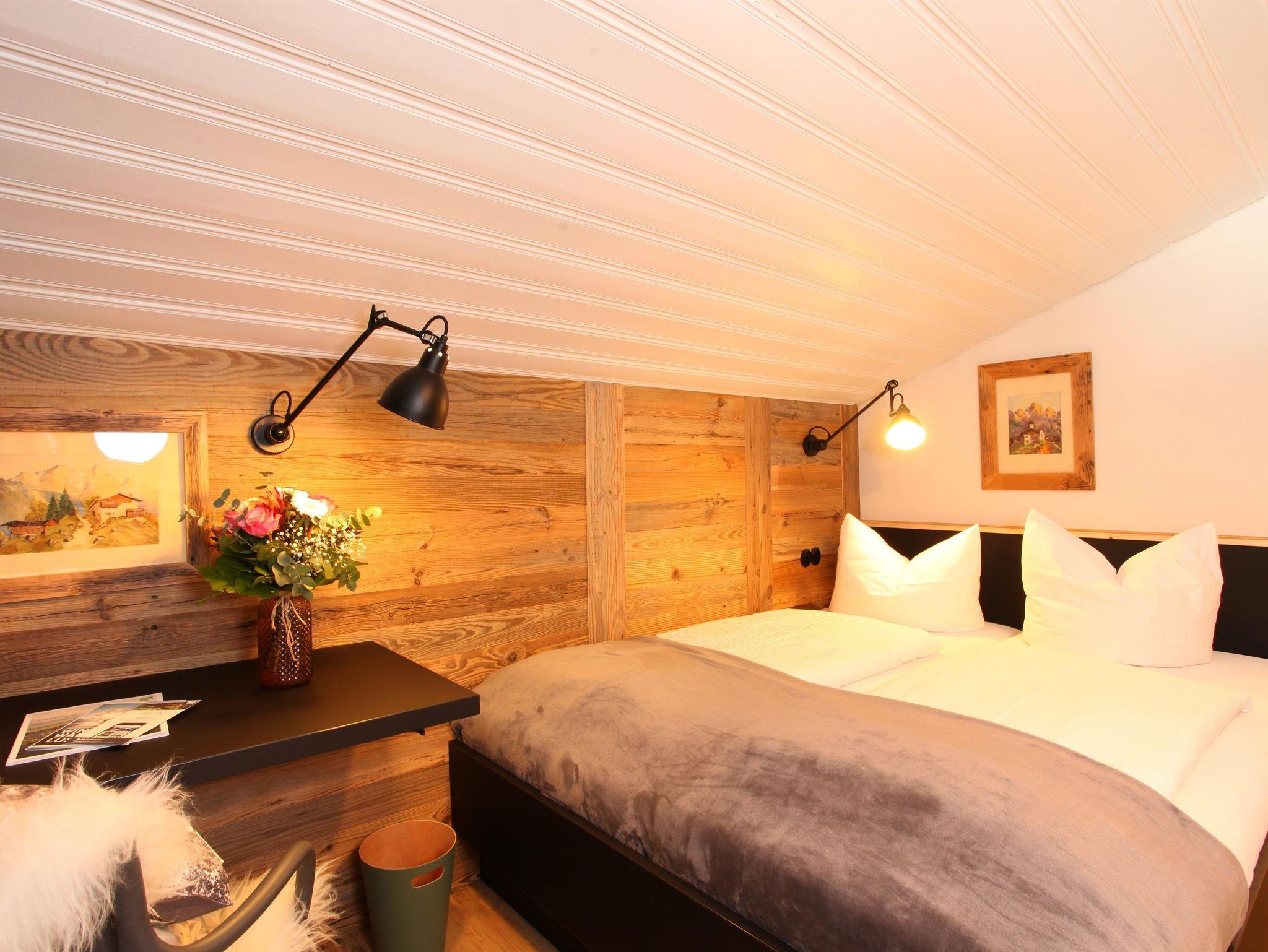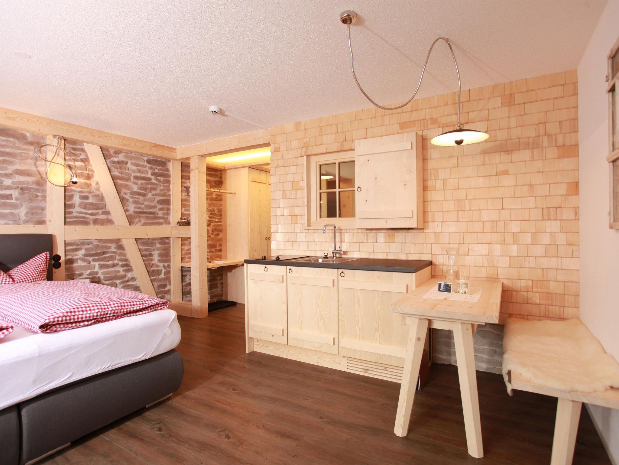Appartement „Gipfelstürmer“ bis max. 4 Personen. Das geräumige Zimmer verbindet den Charme der Alpen mit modernem Design!Ein hochwertiges Doppelbett,gemütliche Schlafcouch für 2 Personen,Flatscreen SAT-TV,W-LAN,Safe,Radiowecker,Designerlampen, Designvinylboden, im Wohnraum integrierte moderne Ferienküche mit Spülmaschine,optische Raumtrennung zwischen Schlafbereich und Wohnbereich,Balkon nach Osten mit Blick auf die Kanzelwand,Bad mit Dusche + Regendusche/WC mit Hotelfön,35 m²
