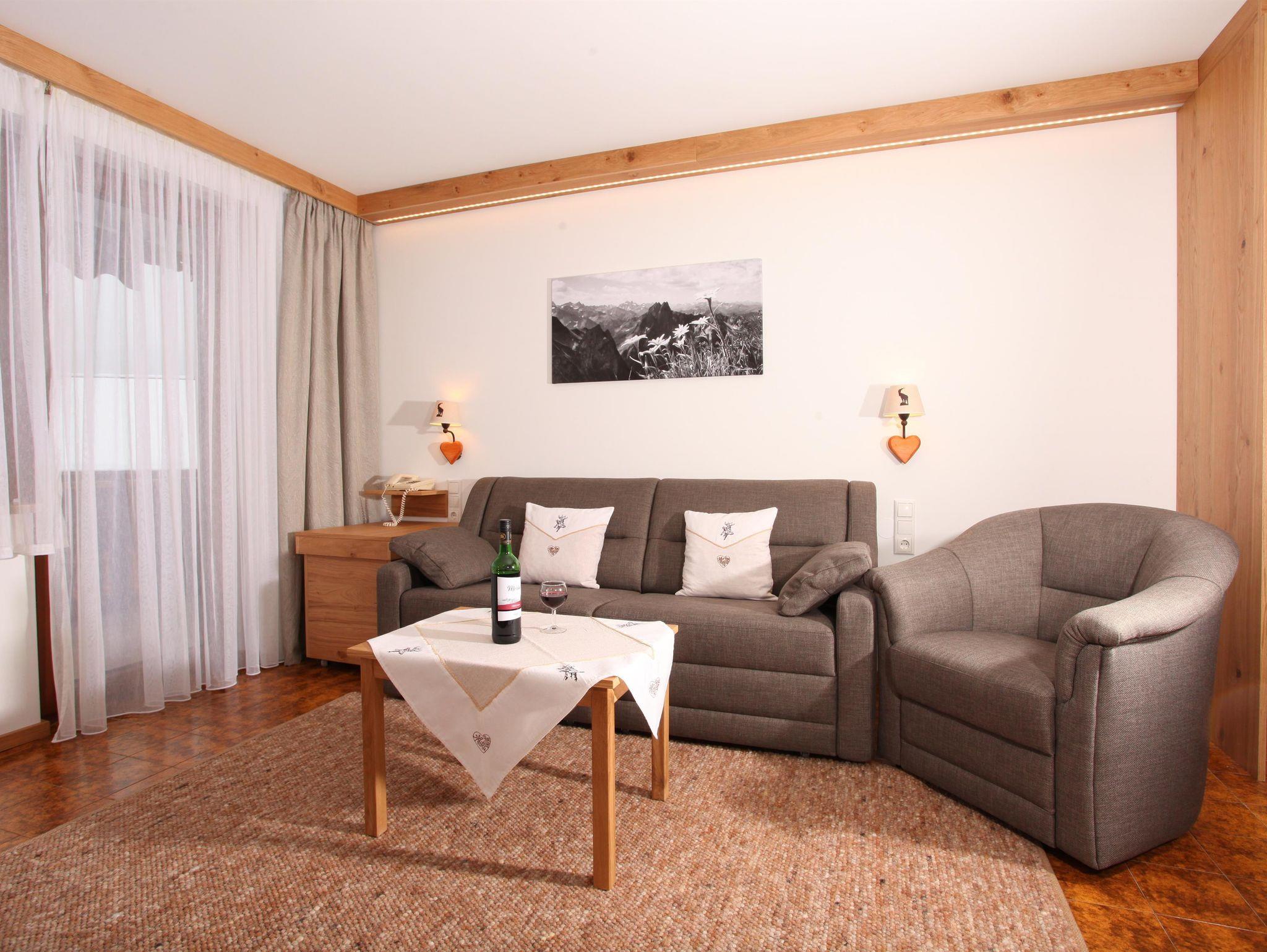 Apartment mit 47qm, großem Wohn- und Schlafbereich separat abtrennbar durch eine Schiebetüre; Doppel Boxspringbett im Schlafbereich, sowie 2 Schrankbetten und 1 Couchecke im Wohnbereich. Küche, gemütliche Essecke, großes Bad mit Doppelwaschbecken und Dusche. Im Vorraum des Apartments sep.WC. Fliesenboden mit Fußbodenheizung sowie Radiatorenheizung. Telefon, Sat-TV, Safe, W-Lan. Der große Südbalkon mit Markise oder die Südterrasse mit Liegewiese und Bergblick. Brötchen- oder Frühstücksservice.