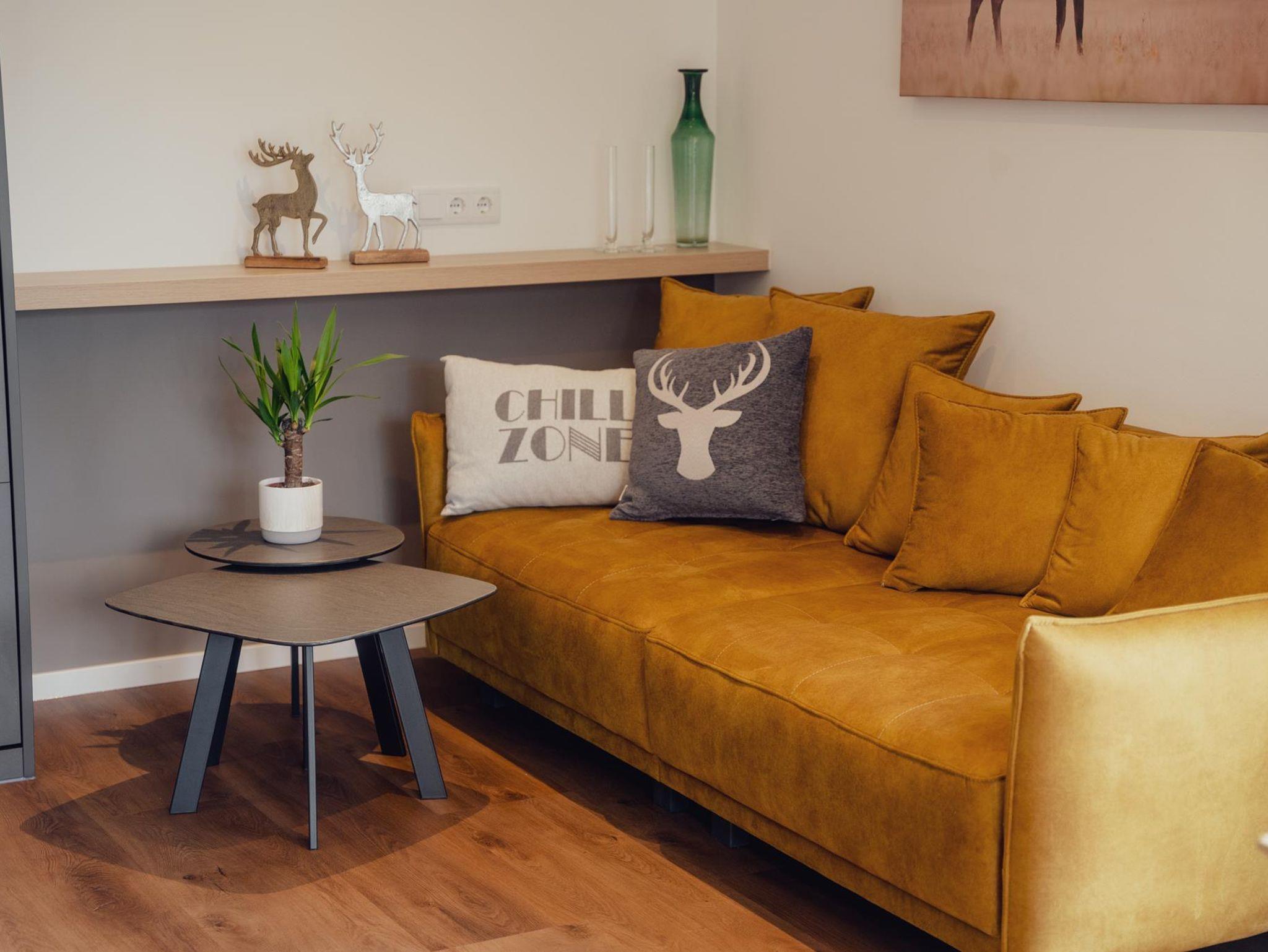 Die 60m2 teilen sich auf in einen Eingangsbereich, einem Schlafzimmer, einem Badezimmer und einem geräumigen Wohnraum. Im Wohnraum befinden sich Küche, Essbereich, Couch + Fernseher sowie ein hochwertiges Klappbett und Zugang zum Balkon.