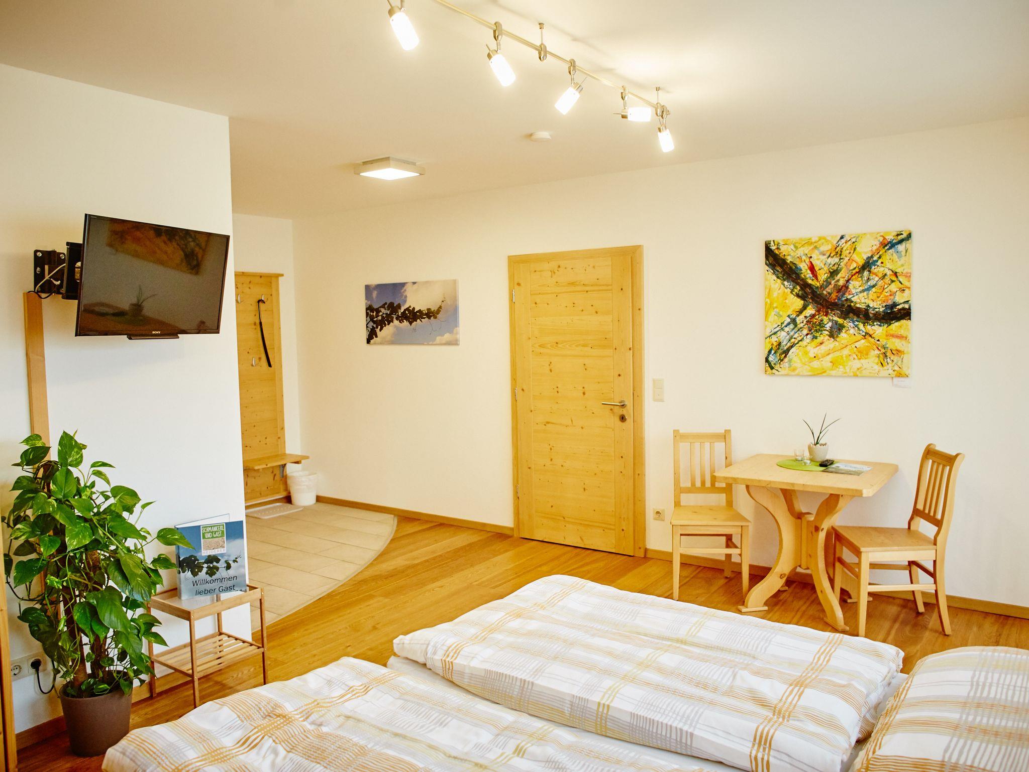 Unser Doppelzimmer Leimer ist mit Vollholzmöbeln ausgestattet und für zwei Personen ausgelegt mit schönem Blick in den ruhigen Innenhof und zum nahen Weinberg. Im kombinierten Wohn- und Schlafzimmer steht ein bequemes Doppelbett und ein SAT-TV. Das große Bad ist barrierefrei und mit Dusche und WC ausgestattet.