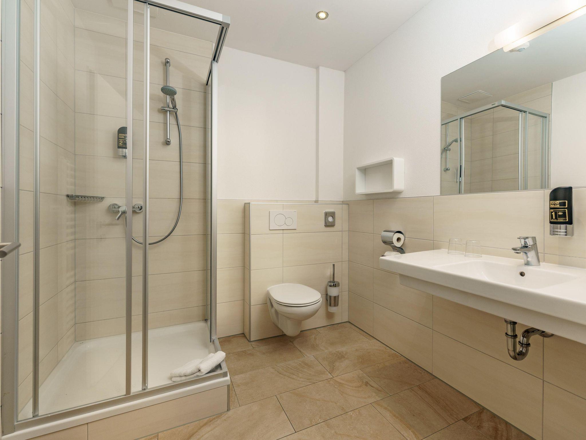 • Badezimmer mit Dusche/WC, Schminkspiegel, Haarföhn & Handtuchtrockner