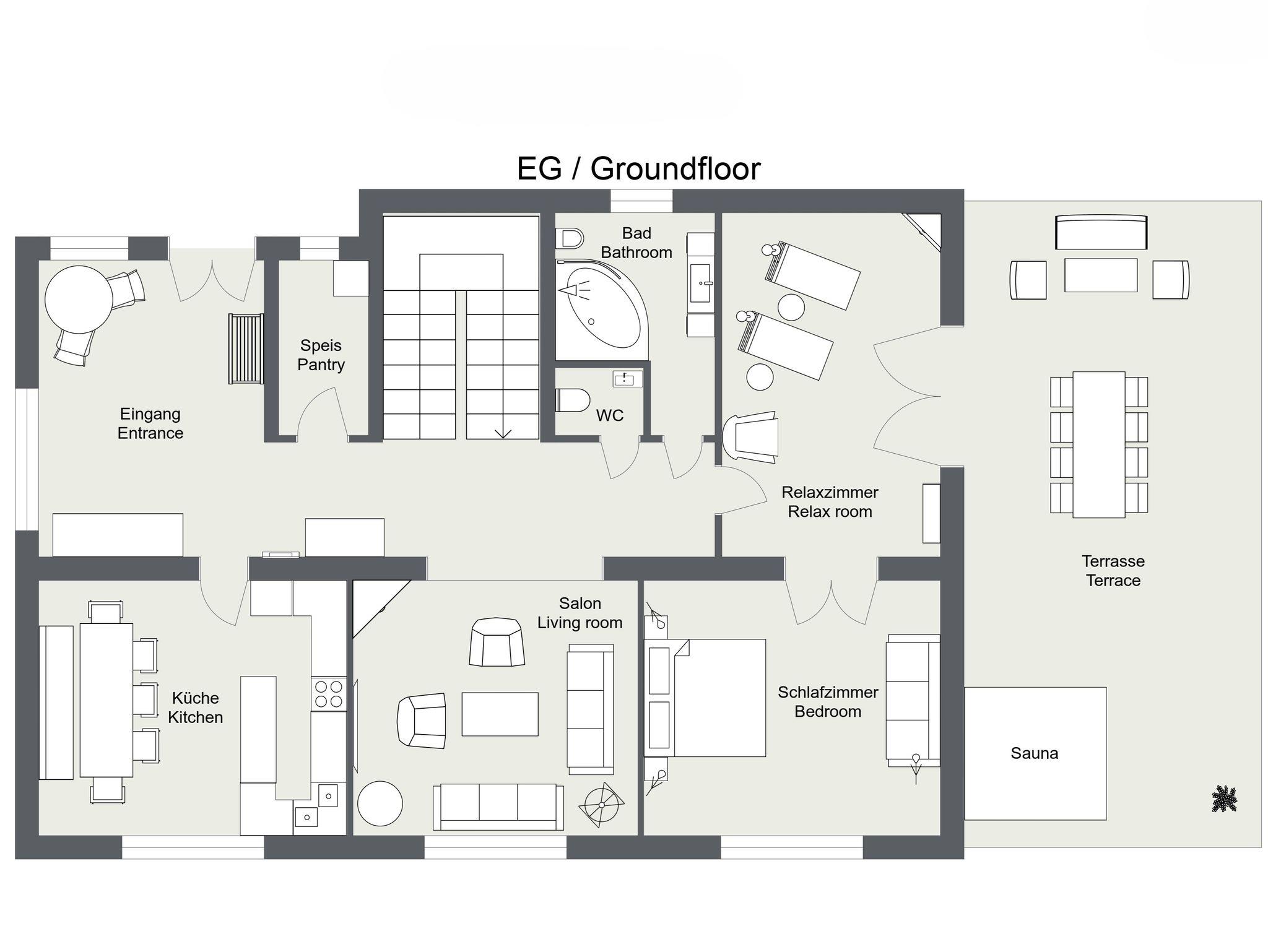 Eindruck hinterlässt auch der Außenbereich des Sandlehen mit seiner großen ebenen Gartenanlage, inklusive Swimming-Pool, Terrasse mit Outdoor-Sauna, vielen Relax- und Ruhebereichen sowie einer großen Spielwiese für Kinder und Erwachsene.