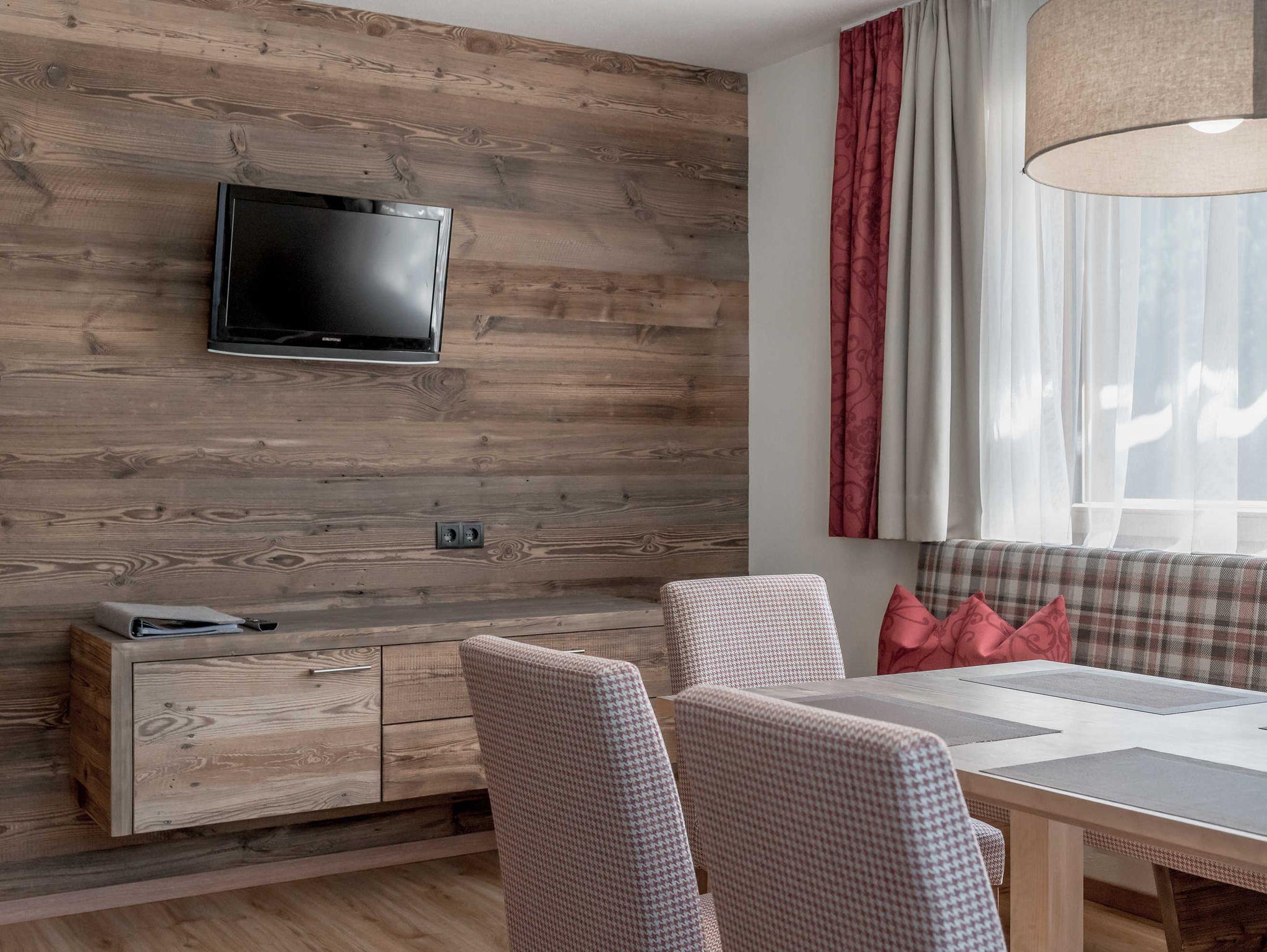 Unsere Ferienwohnungen sind alle hochwertig eingerichtet mit Altholz vom Michl's Stadel, heimischen Hölzern aus den Wäldern des Ötztales sowie mit Steinmauern vom Ötztaler Granit. Die Ferienwohnungen bieten teilweise einen Vorraum mit Garderobe, Doppelzimmer mit Boxspringbetten, teilweise mit Sofa, Bäder mit WC und Regendusche, Föhn, Flat-TV in den Zimmern, Wohnraum mit Essecke und voll ausgestatteter Küche (Backrohr, Ceranfeld mit 4 Platten, Spülmaschine, Kühlschrank mit Gefrierfach, Wasserkocher, Geschirr), Safe, Balkon.