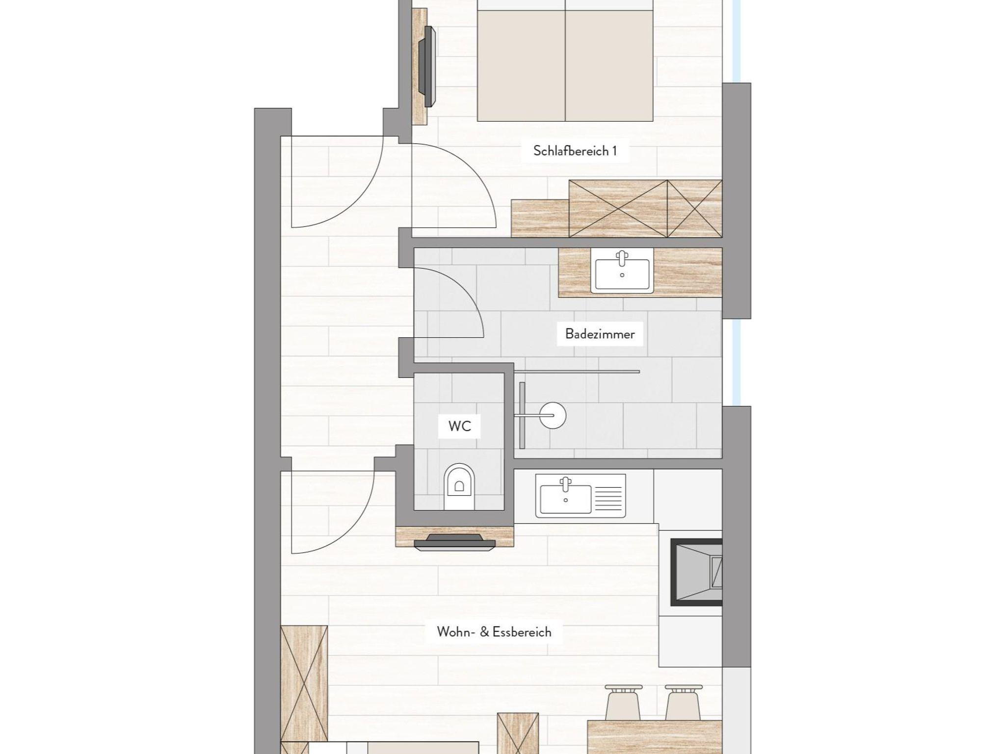 Unser komfortables und großzügiges ausgestattetes Appartement (ca. 39m² für 2-3 Pers.) verfügt über 1 Schlafzimmer + 1 Wohnschlafraum mit Jugendschlafcouch, vollausgestattete Küche, 1 Bad mit Dusche plus zusätzliches separates WC, 2x Kabel-TV, W-LAN, Telefon, Vorraum, ohne Balkon.