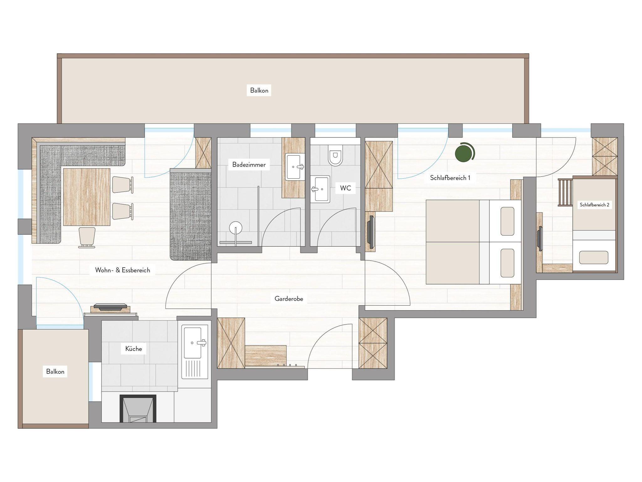 Unser komfortables und großzügiges ausgestattetes Appartement (ca. 54m² für 2-5 Pers.) verfügt über 2 Schlafzimmer (1x Etagenbett) + 1 Wohnschlafraum Einzelcouch, vollausgestattete Küche, 1 Bad mit Dusche plus zusätzliches separates WC, 3x Kabel-TV, W-LAN, Telefon, Vorraum und Balkon.