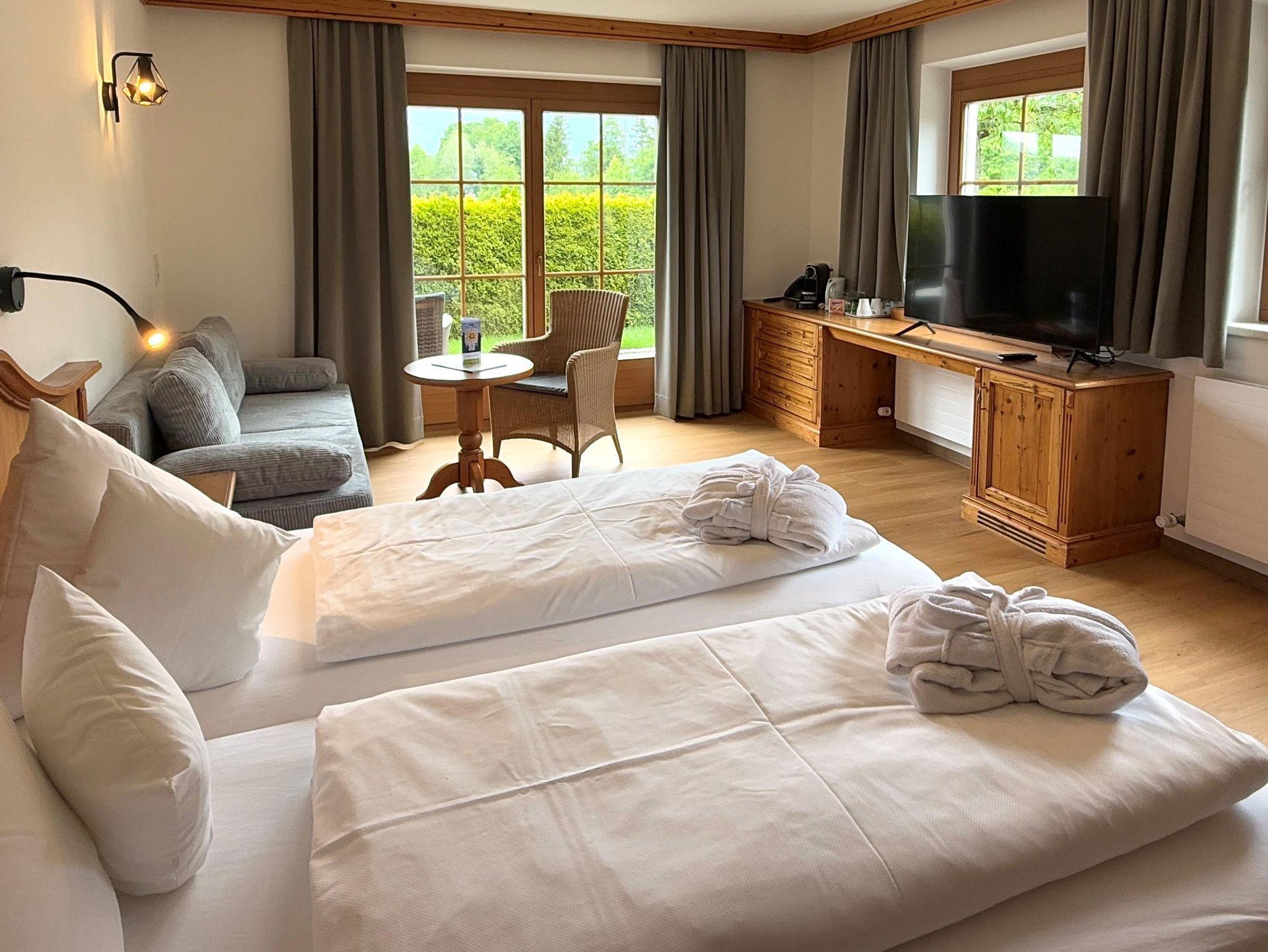 Die Zimmer sind im Erdgeschoss mit Terrasse, Ausblick zum Wilden Kaiser Gebirge und direktem Zugang zum Garten.