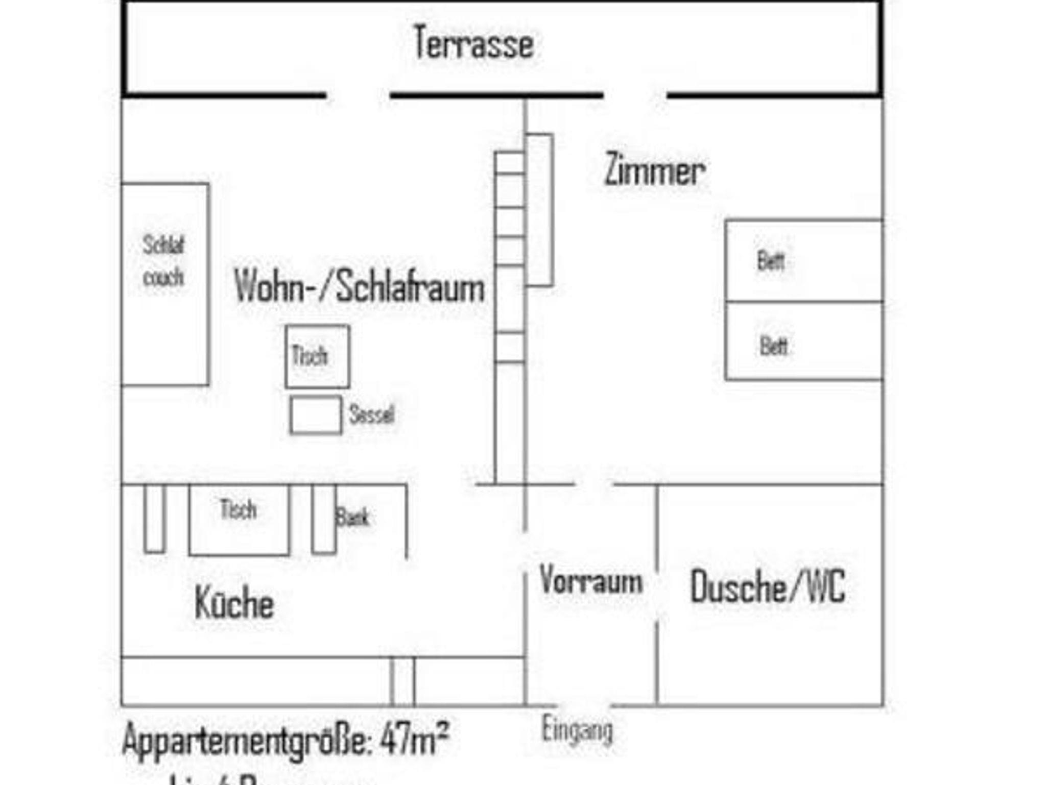 Unsere Ferienwohnung (ca. 47m²) für 2-4 Personen ist mit einem Schlafzimmer für 2 Personen, einem Wohn-Schlafraum mit Ausziehcouch für 2 Personen, Vorraum, Dusche/WC und Küche ausgestattet.