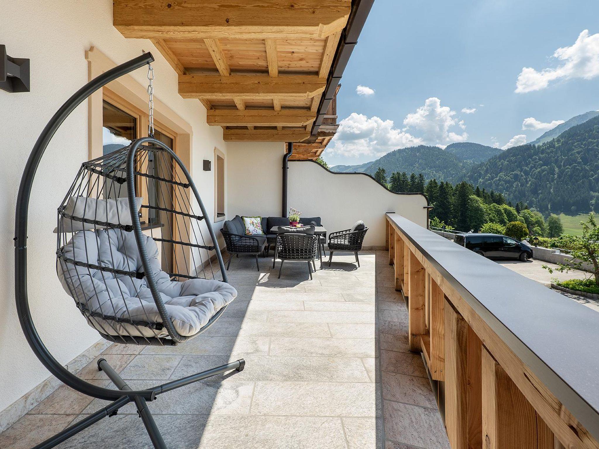 Der nordseitige Balkon ist ein perfekter Ort, um den Urlaubstag zu beginnen oder ausklingen zu lassen. Lehnen Sie sich zurück, atmen Sie die frische Bergluft ein und genießen Sie den Panoramablick auf die Bergwelt.