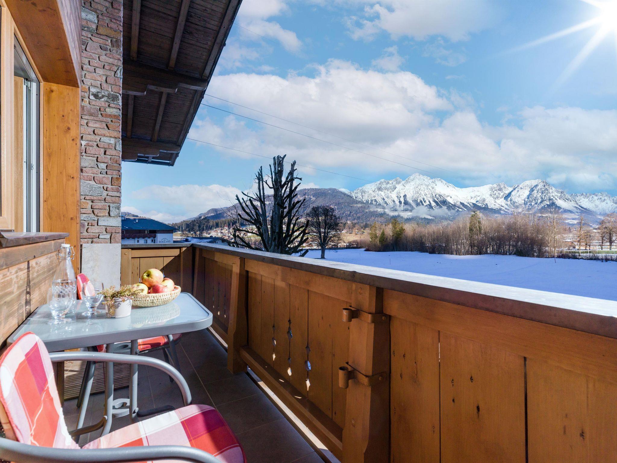 Unsere Appartements sind mit großen Balkonen ausgestattet, die alle einen herrlichen Ausblick auf die umliegende Bergwelt ermöglichen.