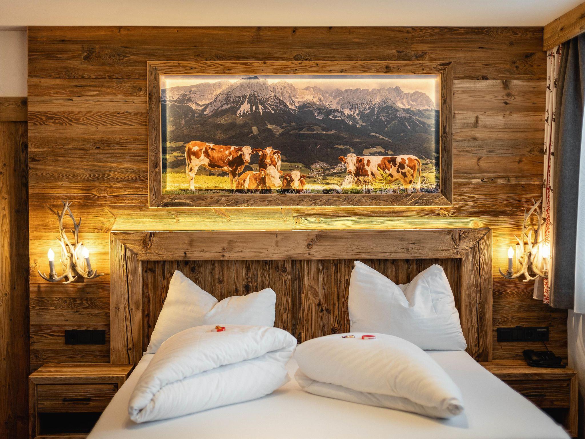 Familiensuite im Tiroler Landhausstil - Balkon - 36m² gesamt - Schlafzimmer mit Doppelbett, Wohnzimmer bzw. Kinderzimmer abgetrennt mit Couch, bei Kinder Ausziehcouch, Zimmersafe, 2x TV, Telefon, Wlan
