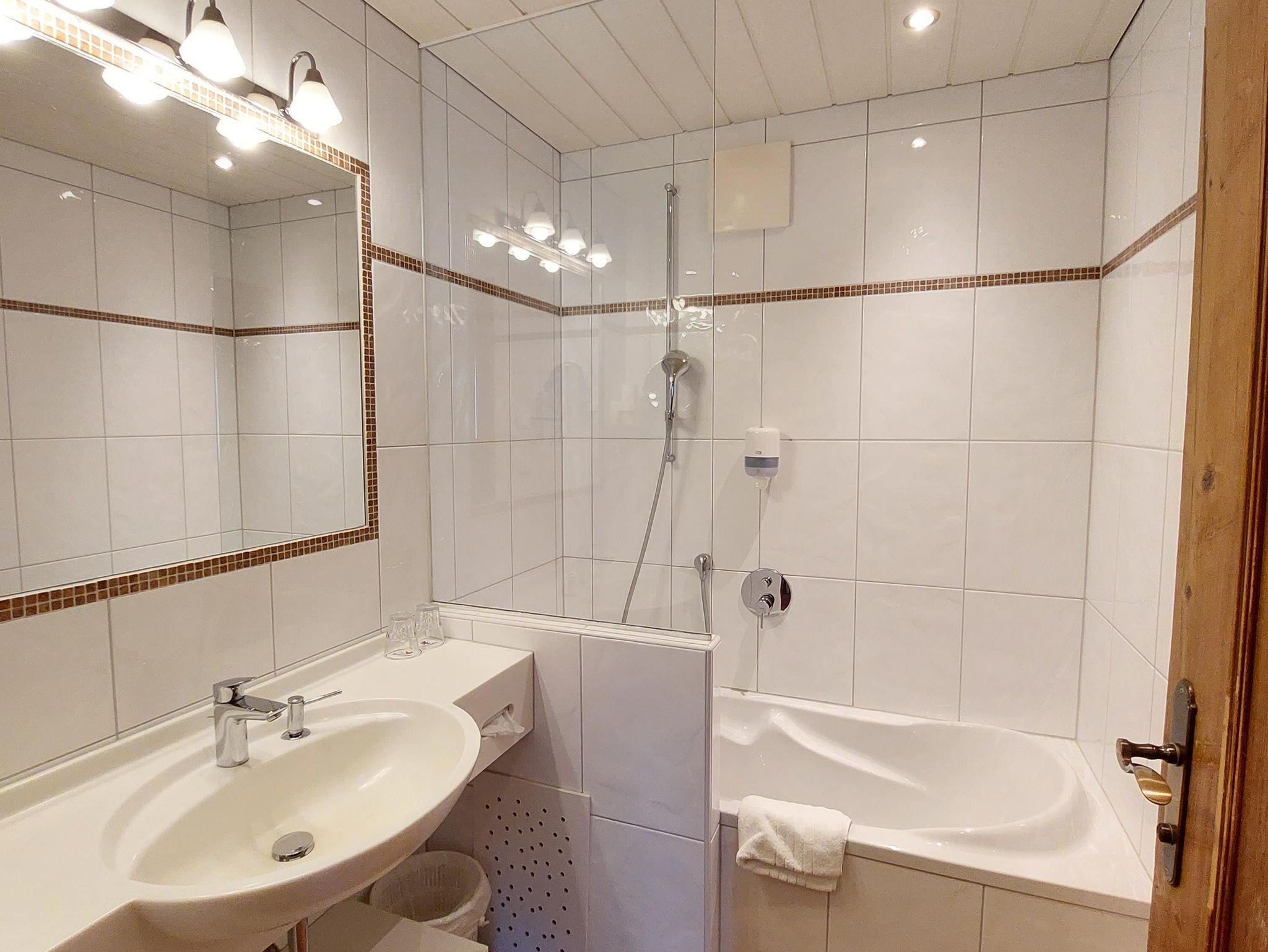 Badezimmer mit Dusche, WC getrennt, Haarfön