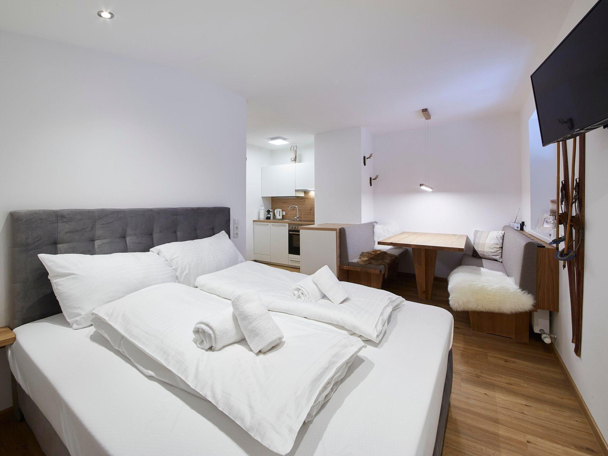 Unser Appartement Bergzeit stellt auf rund 25 m² eine kleine aber feine Unterkunft in ruhiger und doch zentraler Lage zwischen Saalbach und Hinterglemm dar. Die Wohnung bietet einen Wohnbereich mit Doppelbett, einem Essbereich, eine Küche sowie ein Badezimmer mit Dusche und WC. Ein Skiraum sowie ein Innenpool zur Gemeinschaftsnützung stehen unseren Gästen zur Verfügung. Ein kostenloser Parkplatz sind je nach Verfügbarkeit direkt hinter dem Gebäude vorhanden.