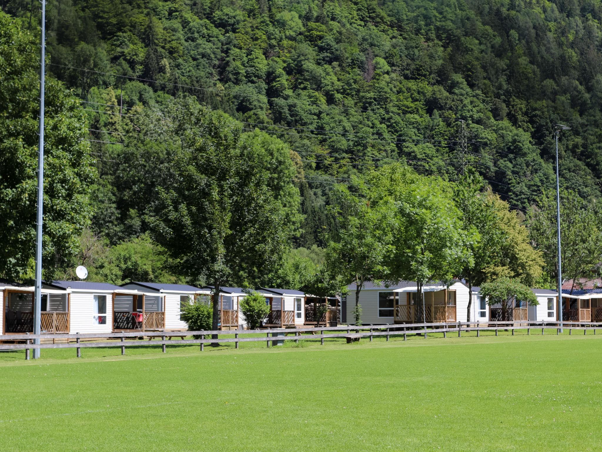 "Wood Cube", 3-room mobile home 24 m2. Object suitable for 4 adults. Comfortable and modern furnishings: 1 double bedroom with 1 french bed (160 cm, length 200 cm). 1 room with 2 beds (80 cm, length 200 cm). Kitchen-/living room (4 induction hot plates, microwave, electric coffee machine, raclette grill) with 1 sleeping facility (130 cm, length 190 cm), dining table, satellite TV and air conditioning. Exit to the terrace. Shower, sep. WC. Electric heating, air-conditioning. Terrace 9 m2, roofed. Terrace furniture, electric barbecue (portable), deck chairs. View of the mountains and the countryside. Facilities: Internet (WiFi, free). Please note: non-smokers only. Private mooring (extra). Maximum 1 pet/ dog allowed.