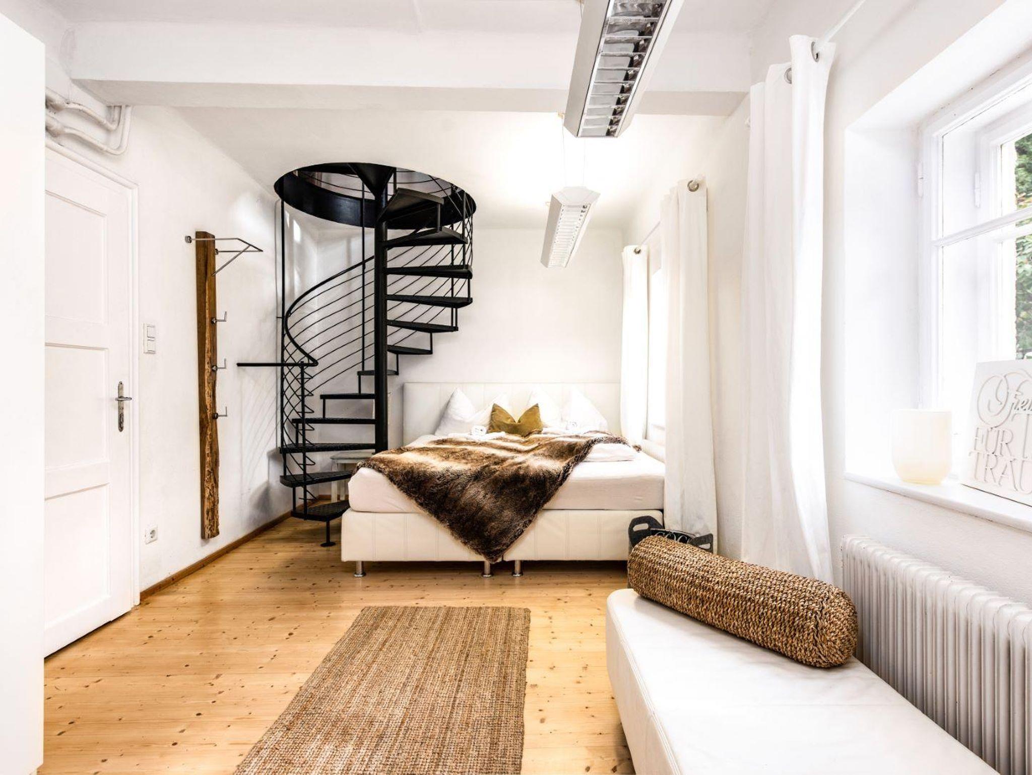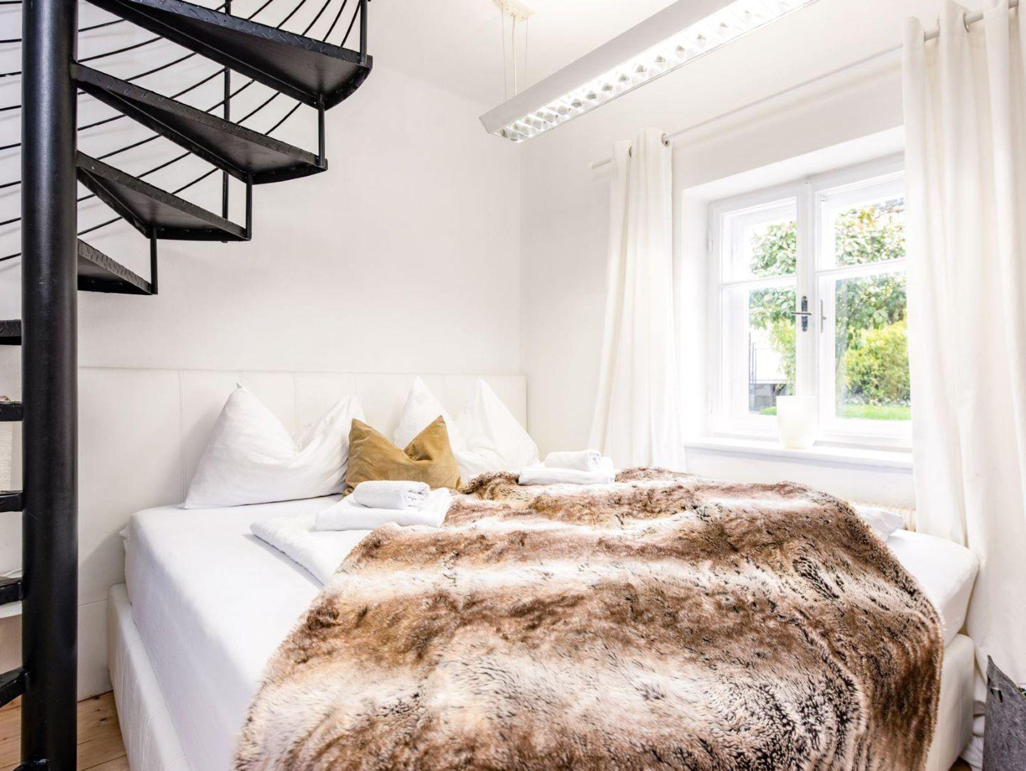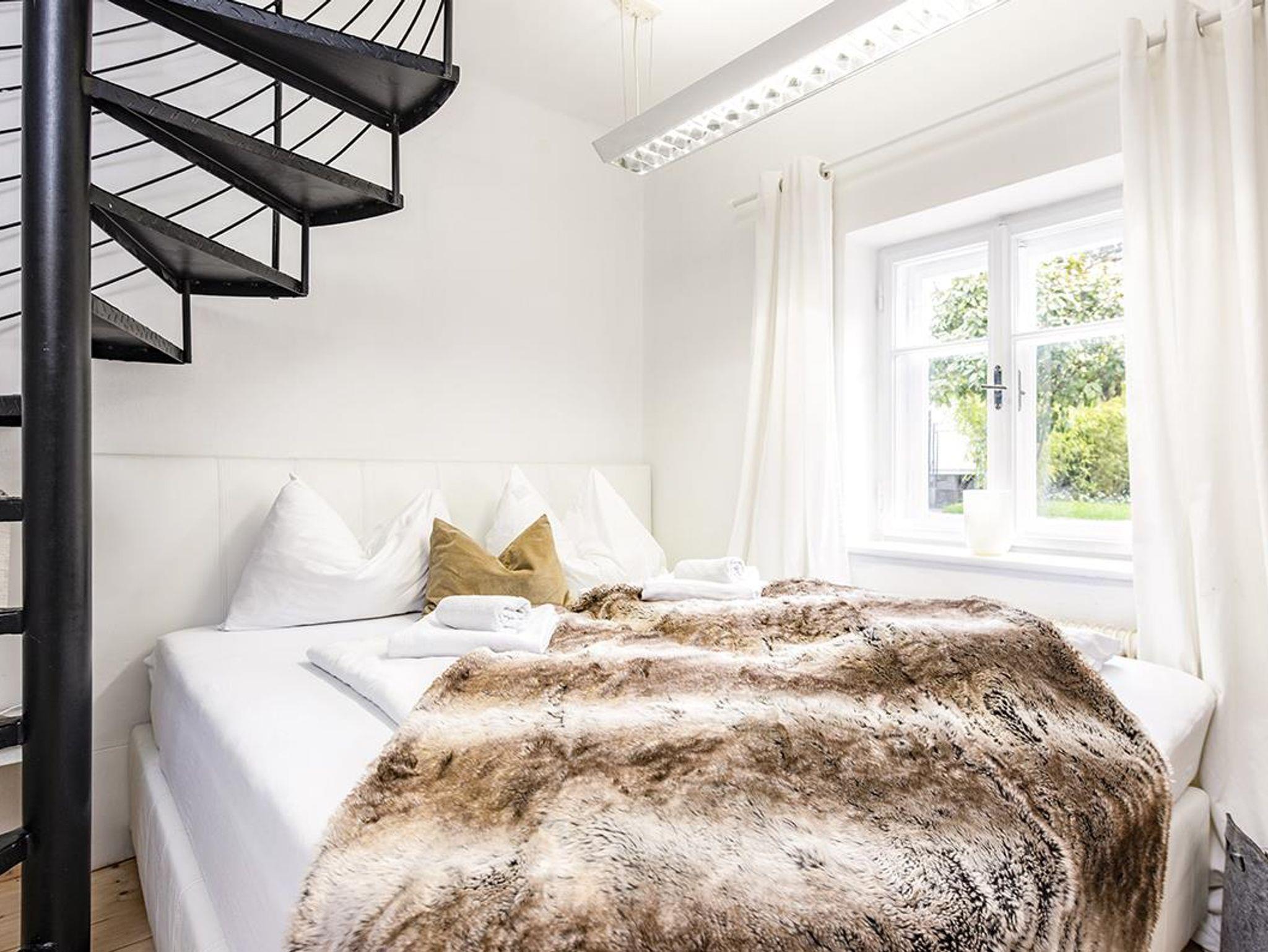 Eine Wendeltreppe führt von hier auch ins Parterre, wo sich das weiße Schlafzimmer mit Badezimmer und Toilette befindet. Und natürlich einen separaten weißen Lounge Bereich mit TV, um sich mal auszuklinken. Über diesen kommst Du durch eine Tür auch direkt in den Garten.