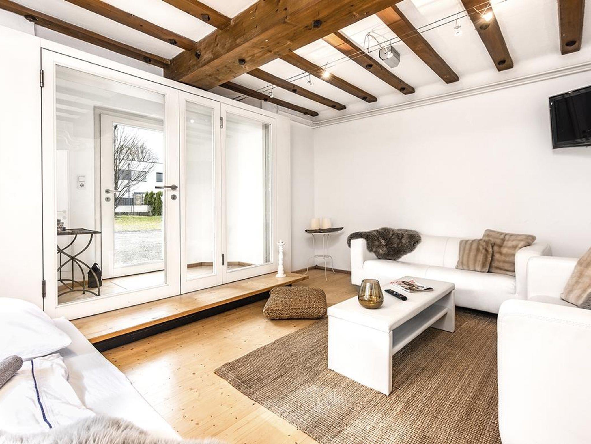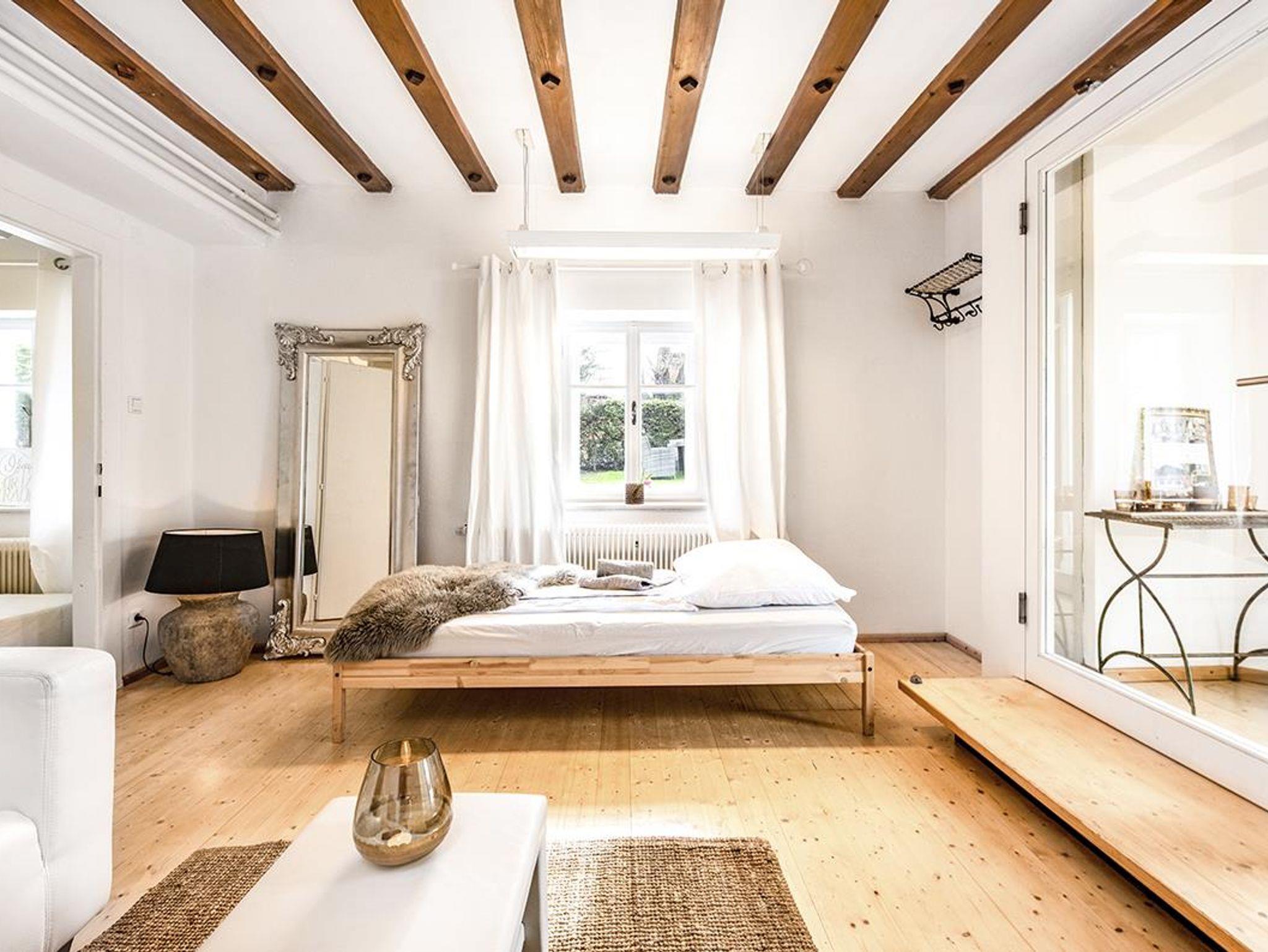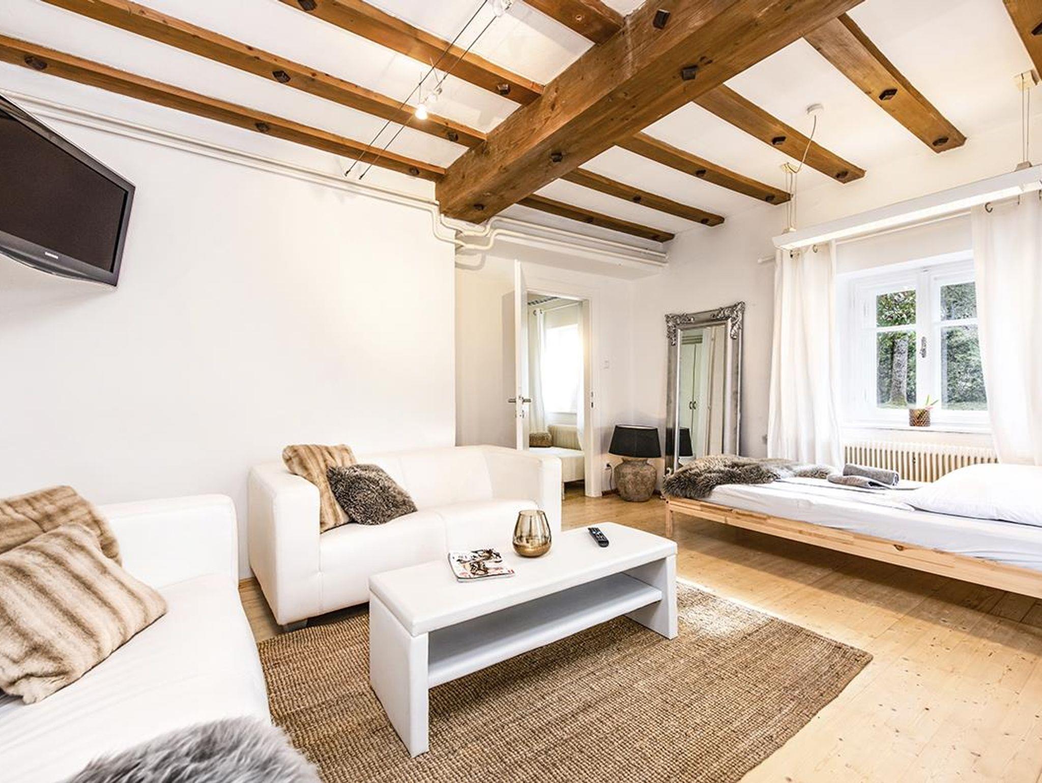 Eine Wendeltreppe führt von hier auch ins Parterre, wo sich das weiße Schlafzimmer mit Badezimmer und Toilette befindet. Und natürlich einen separaten weißen Lounge Bereich mit TV, um sich mal auszuklinken. Über diesen kommst Du durch eine Tür auch direkt in den Garten.