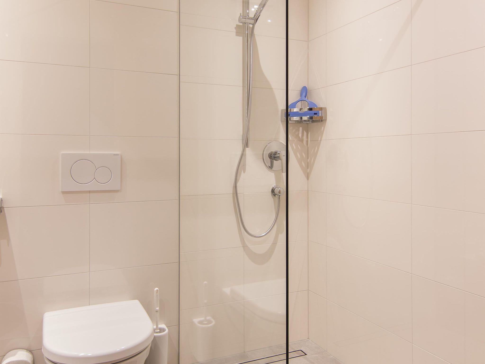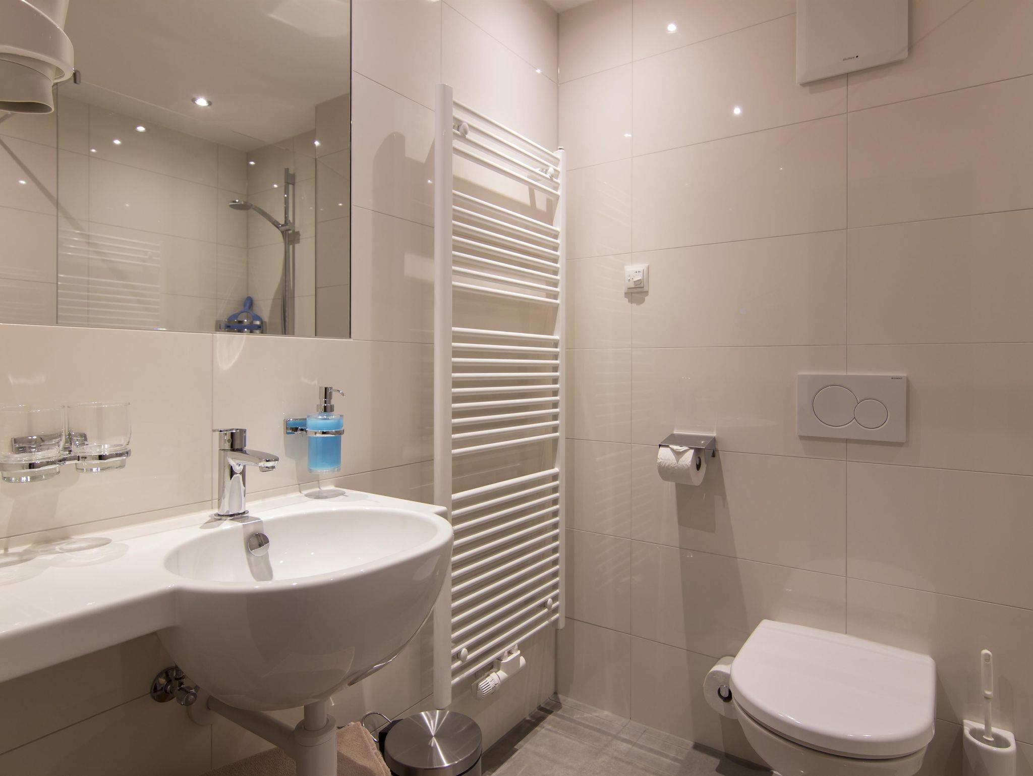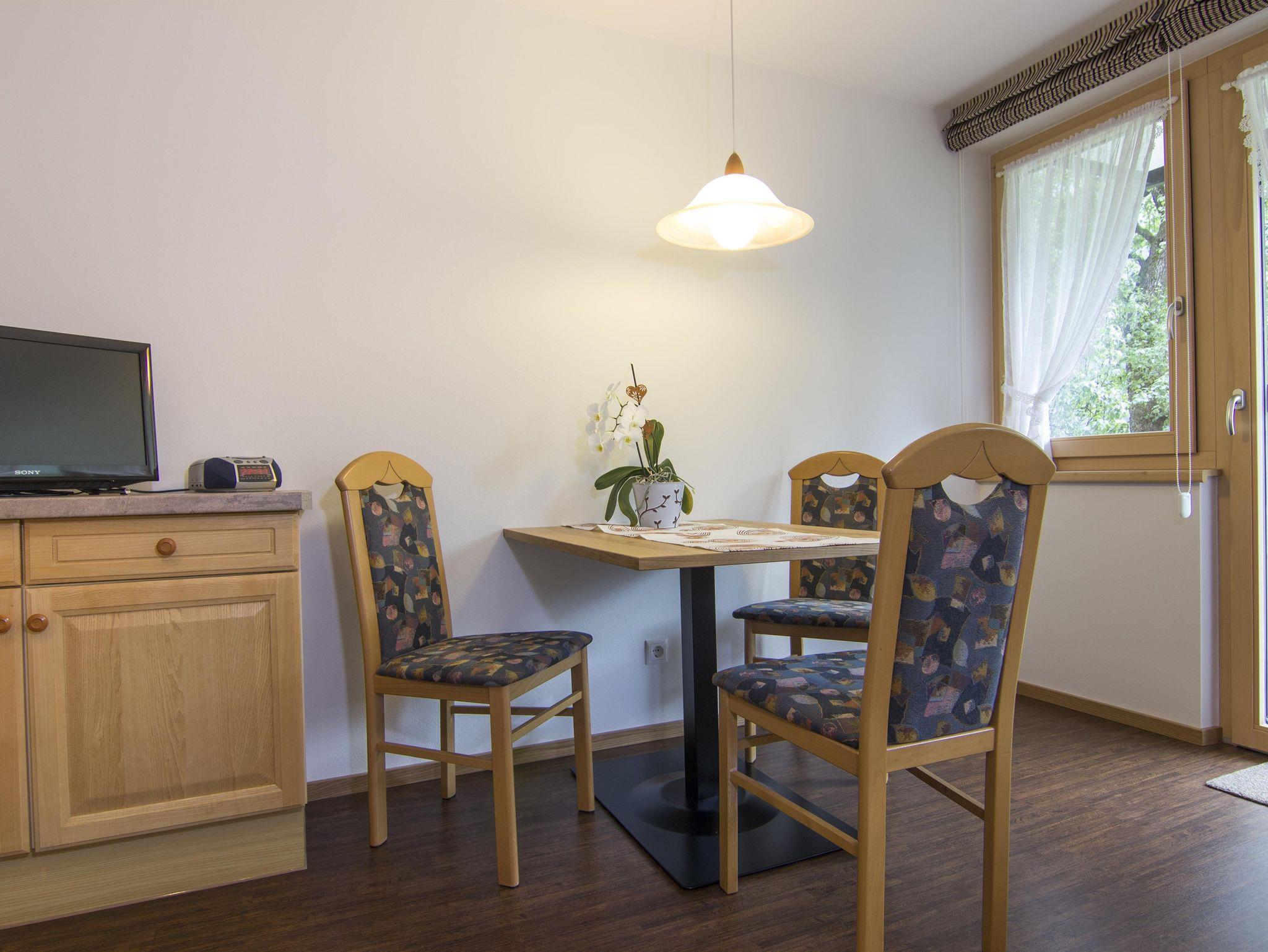 Wohnung 2 mit 33m² für 2 Personen, verfügt über ein Doppelzimmer, einem Badezimmer mit Dusche/WC, einer Küche mit Esstisch, kleine Sitzcouch und einem Südbalkon. Die Küche ist komplett ausgestattet mit 4 Platten E-Herd, Backofen, Geschirrspülmaschine, Filter,- und Nespressokaffeemaschine, Soda Stream, Wasserkocher und Toaster.