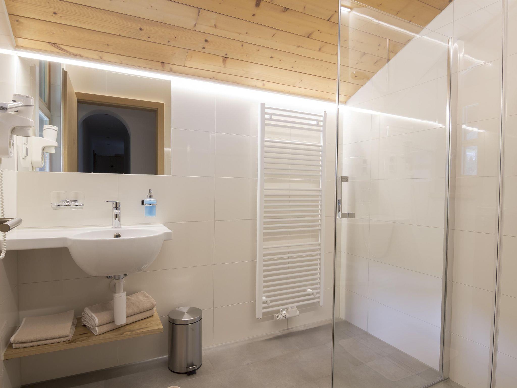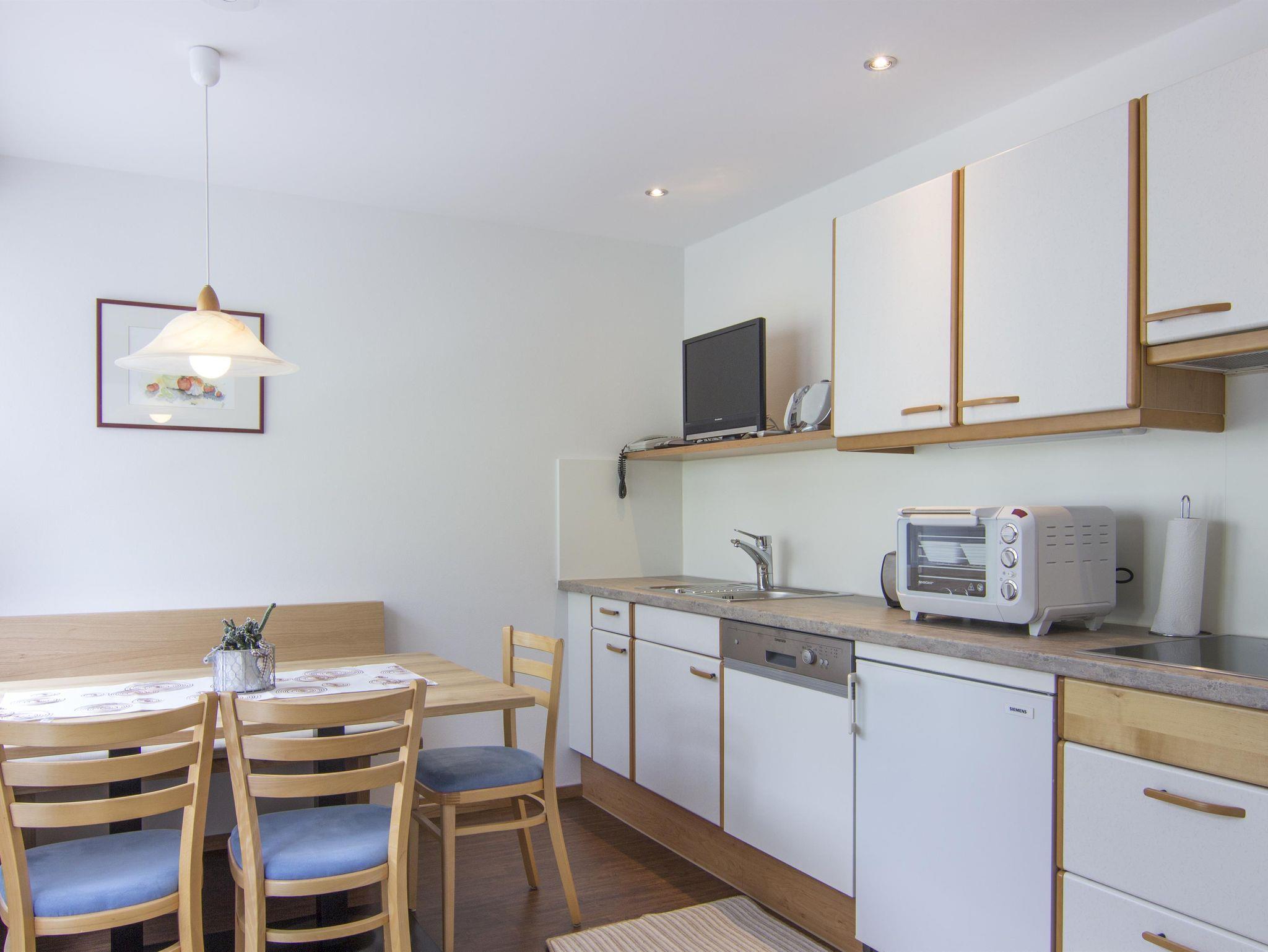 Wohnung 5 mit 50m² für 3-5 Personen verfügt über zwei Doppelzimmer, einem Badzimmer mit Dusche und separatem WC, einer Küche mit Esstisch und einem Nordbalkon. Die Küche ist komplett ausgestattet mit 4 Platten Ceranfeld, kleiner Grill u. Backautomat, Kühlschrank, Geschirrspülmaschine und Filter,- und Nespressokaffeemaschine, Wasserkocher, Toaster.