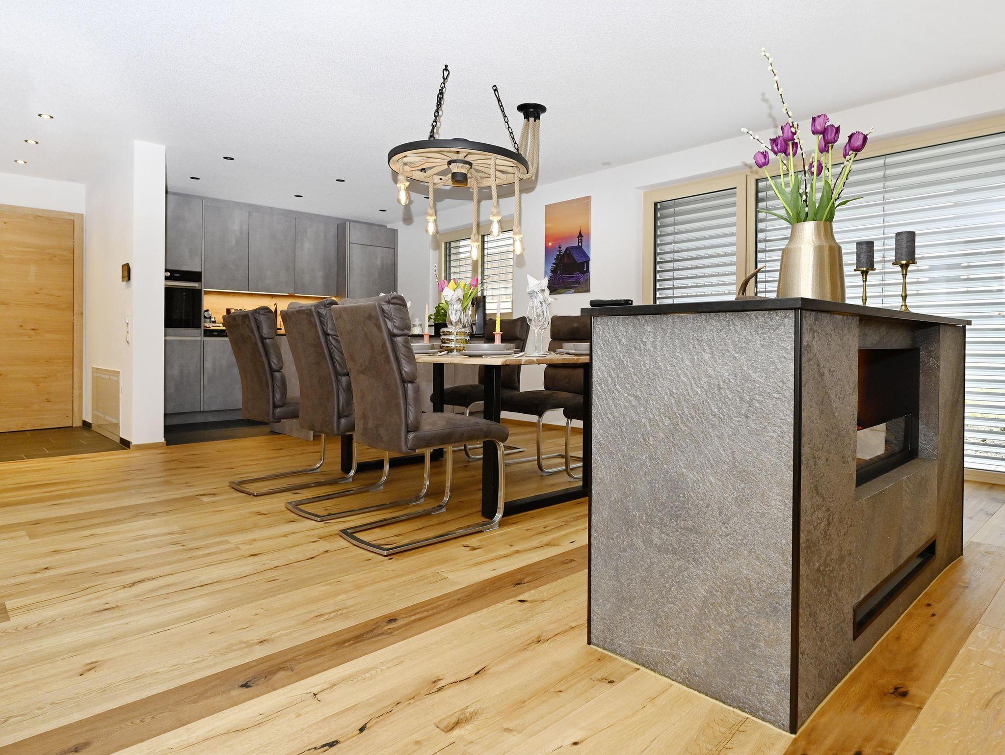 2 Schlafzimmer mit Doppelbetten (1 x zusätzliches Stockbett) und jeweils TV, 2 x Wellnessduschen und WCs, zusätzliches Gäste-WC, Wohnzimmer mit Ess- und Sitzbereich, voll ausgestattete Küche, E-Kamin, 65 Zoll TV, Ski- und Trockenraum mit Schuhtrockner, Feuerschale und Sitzplatz im Freien