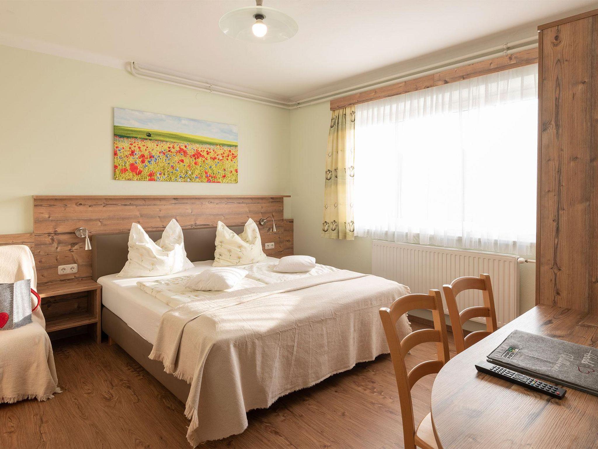 Der Landgasthof verfügt über fünf Doppelzimmer. Ausgestattet sind die Doppelzimmer mit einem Bett (200 x 180 cm) aus Vollholz, einem Tisch, zwei Sesseln, einem großen Kleiderschrank, SAT-TV, WC, Dusche, Waschbecken und Fön.