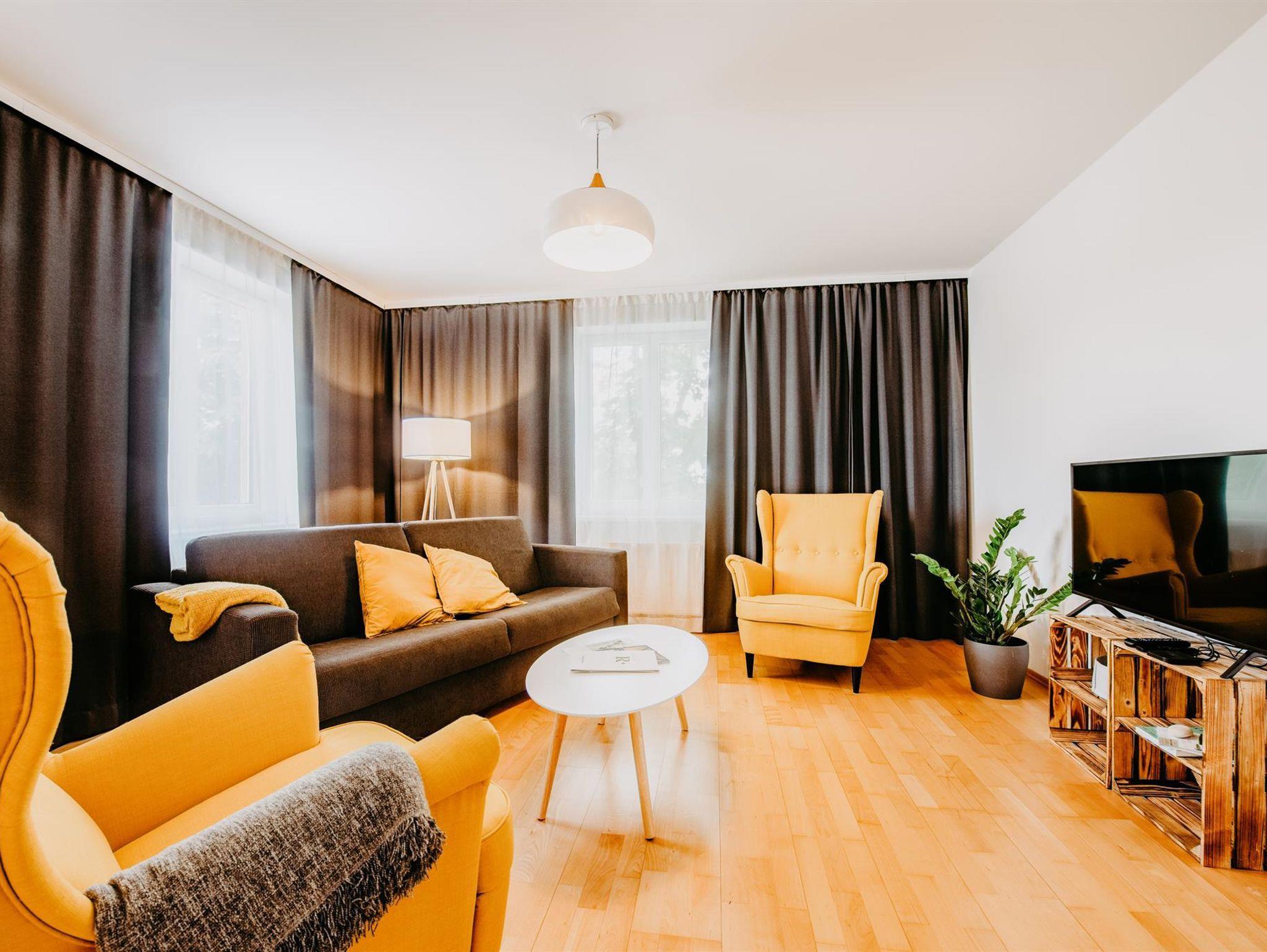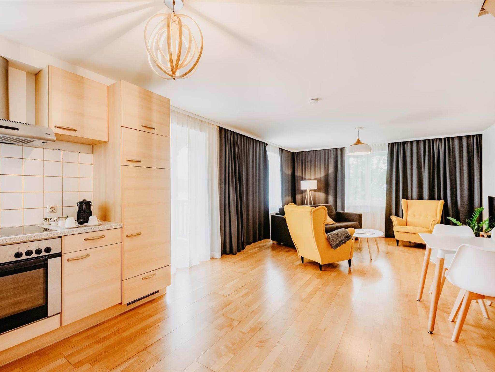 Zurücklehnen, erholen, genießen. Die Studios im modernen Landhausstil (ca.70m²) bieten viel Platz für bis zu fünf Personen. Sie bestehen aus je einem Schlafzimmer, einem Wohn-Schlaf-Bereich und einem weiteren Einzelzimmer. Der Wohnbereich lockt mit einer Essgruppe inkl. kleiner Kochmöglichkeit und einer gemütlichen Sofaecke. Hier können Sie im Ohrensessel die Zeit vergessen und ganz entspannt den Urlaub genießen. Kostenloses WLAN und ein Full-HD TV mit Streamingdienst (Netflix) ergänzen das Angebot dieser Kategorie.