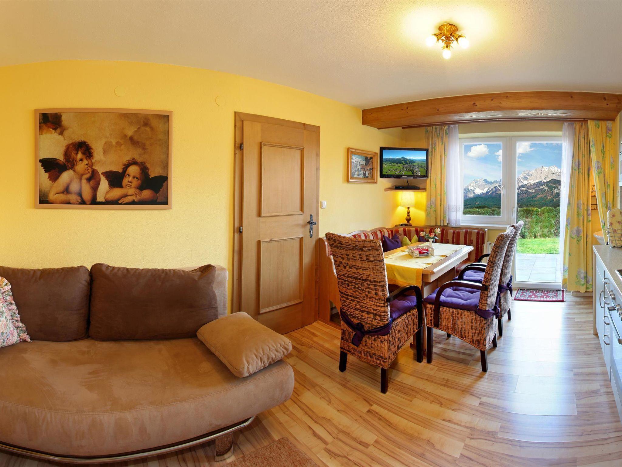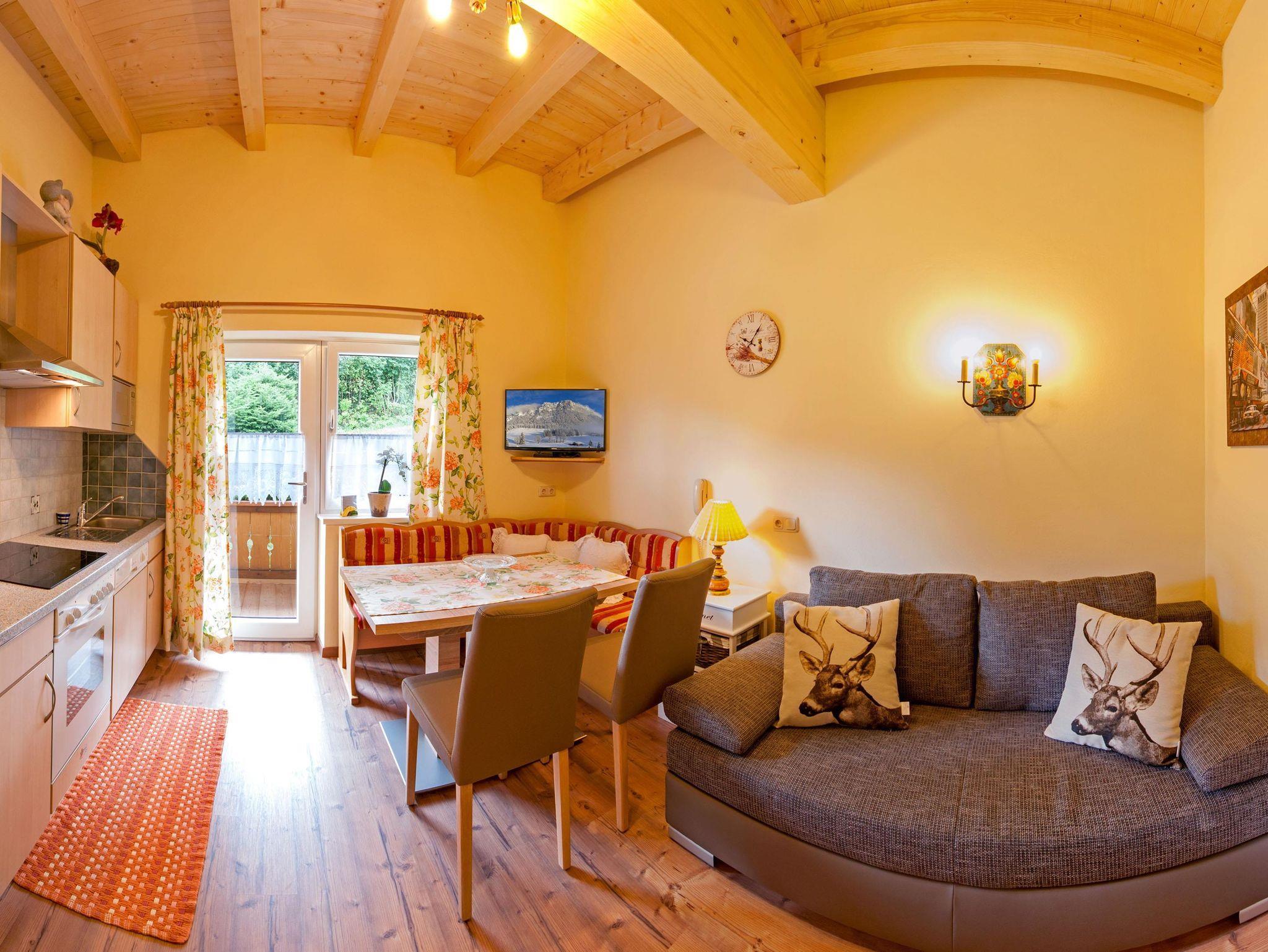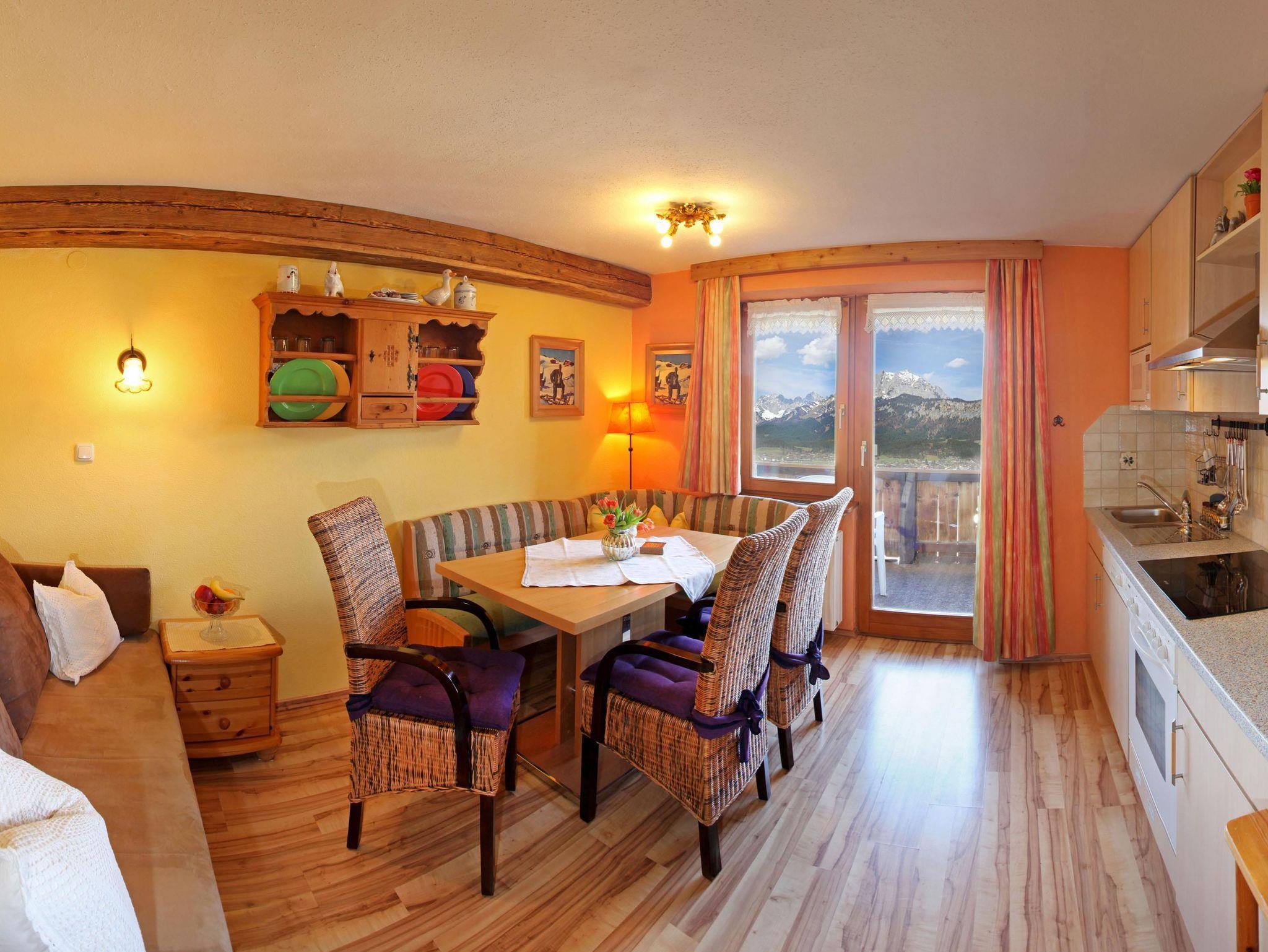 Warmes und helles Holzambiente heißt im 3-Zimmer-Appartement „Tirol“ 2 – 5 Personen willkommen. Die neu renovierte Ferienwohnung verfügt über zwei Schlafzimmer, eine gemütliche Wohnküche mit Ausziehcouch und zwei Balkonen. Ostbalkon mit Blick zum Kitzbüheler Horn und vom zweiten west Balkon ist die Aussicht zum Wilden Kaiser überragend.