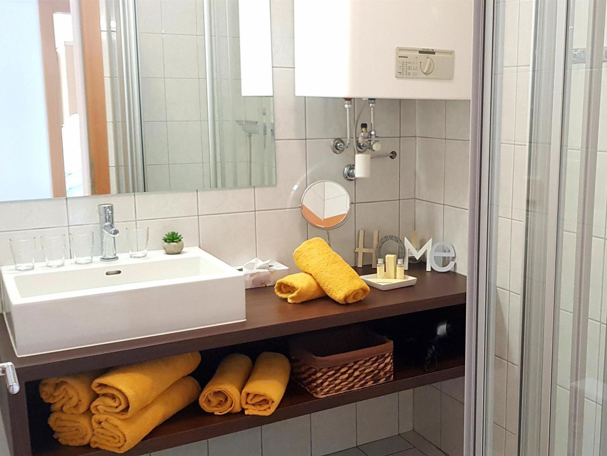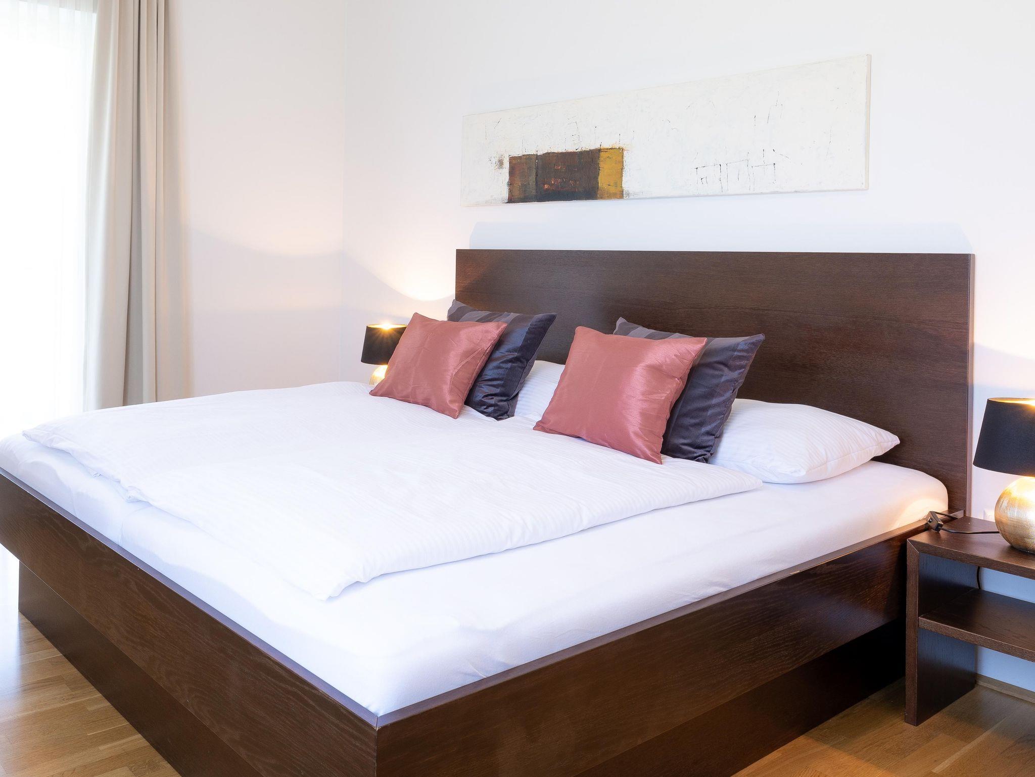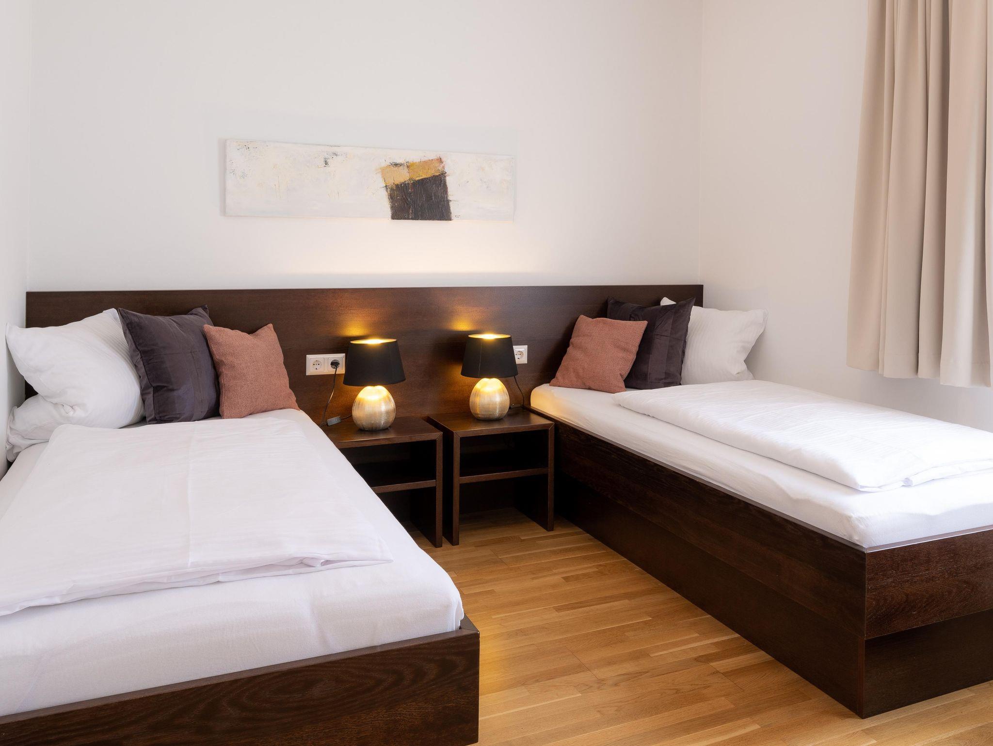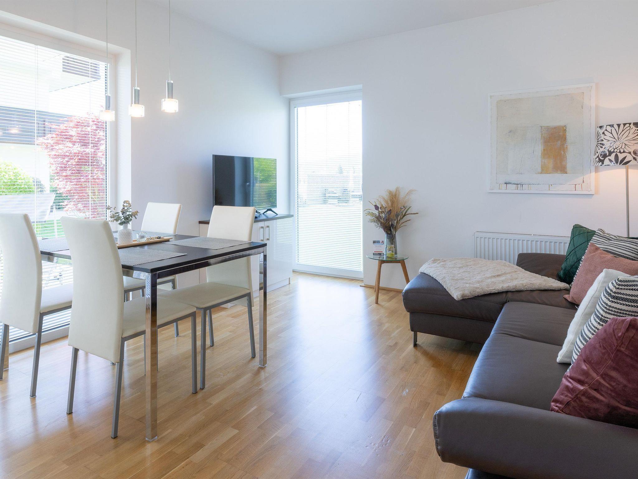 Die Wohnungen bestehen aus einem Vorraum, zwei Doppelzimmer, Badezimmer/WC,Fön, einem Wohnzimmer mit ausziehbarer Couchgarnitur, Esstisch, LCD-TV mit Musikkanal, Internet über W-LAN, komplett ausgestatteter Küche mit Mikrowelle, Geschirrspüler, Backofen, Kaffeemaschine, Sodastream uvm. sowie einer großen Terrassen mit Terrassenmöbel, 2 Sonnenliegen und einen Griller. Bett- u. Tischwäsche, Geschirr- u. Handtücher werden bereitgestellt. Auf Wunsch Zustellbett, Kinderbett (Gitterbett) und Hochstuhl. Waschservice gegen Gebühr im Haus.