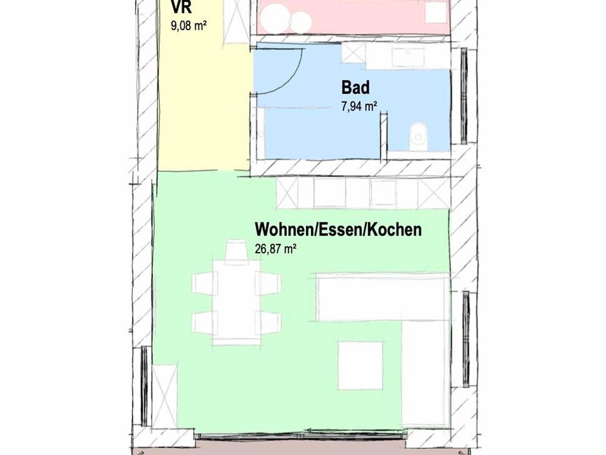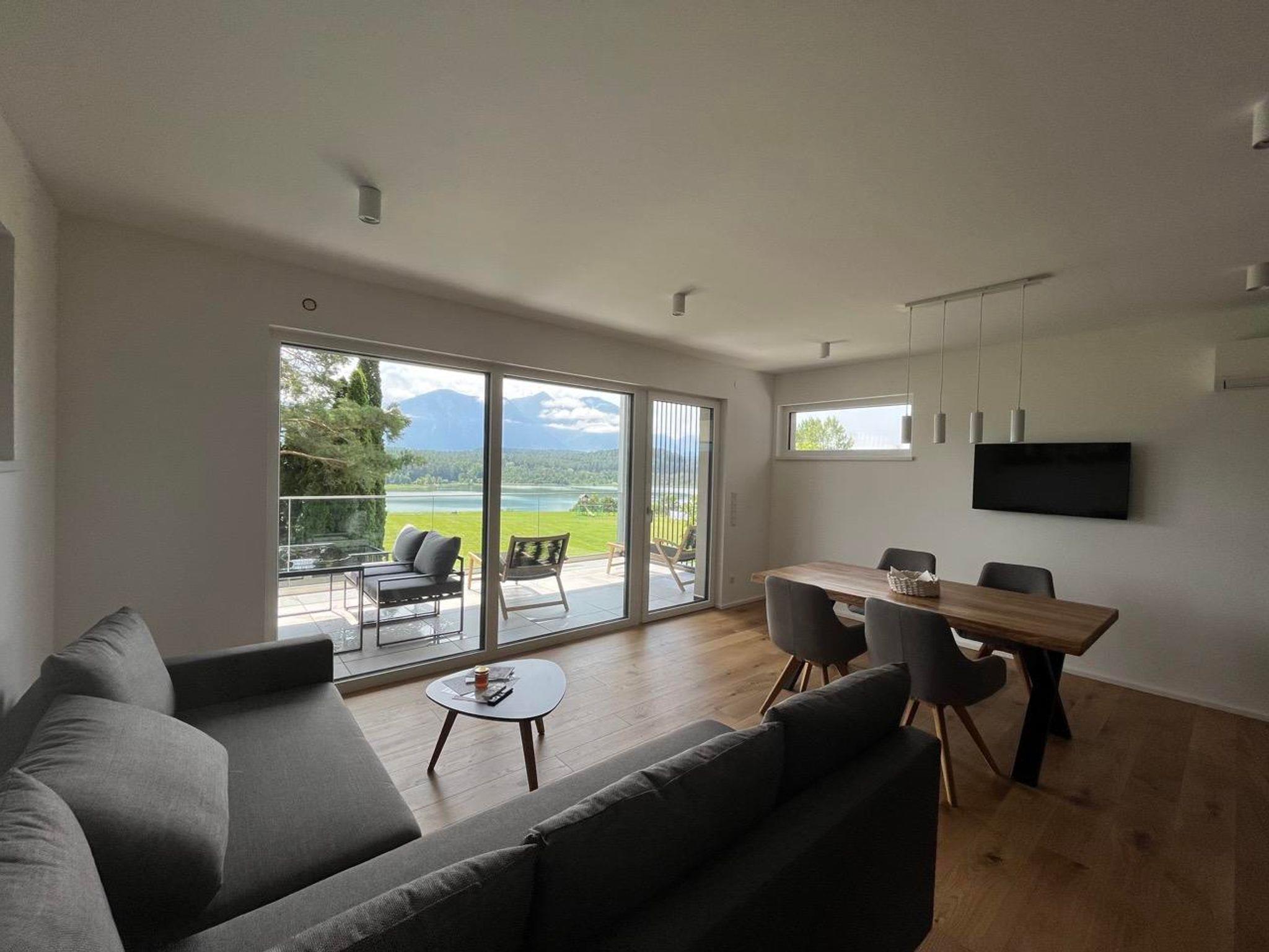 Der Wohnraum besticht mit seiner großen Glasfront, die direkt auf die Terrasse führt. Im Wohnraum befindet sich eine moderne Küche, ausgestattet mit Kühlschrank, Gefrierfach, Ceranfeld, Backrohr, Geschirrspüler, Spüle, Kaffeemaschine und Wasserkocher. Die Küche enthält ein vollständiges Besteck- und Geschirrservice. Der Esstisch, für bis zu 4 Personen, ermöglicht einen einzigartigen Ausblick auf den See während dem Essen. Zum Entspannen lädt die große Couch mit Fernseher ein. Bei mehr als 2 Personen, finden bis zu 2 weitere Personen auf der gemütlichen Ausziehcouch Platz.