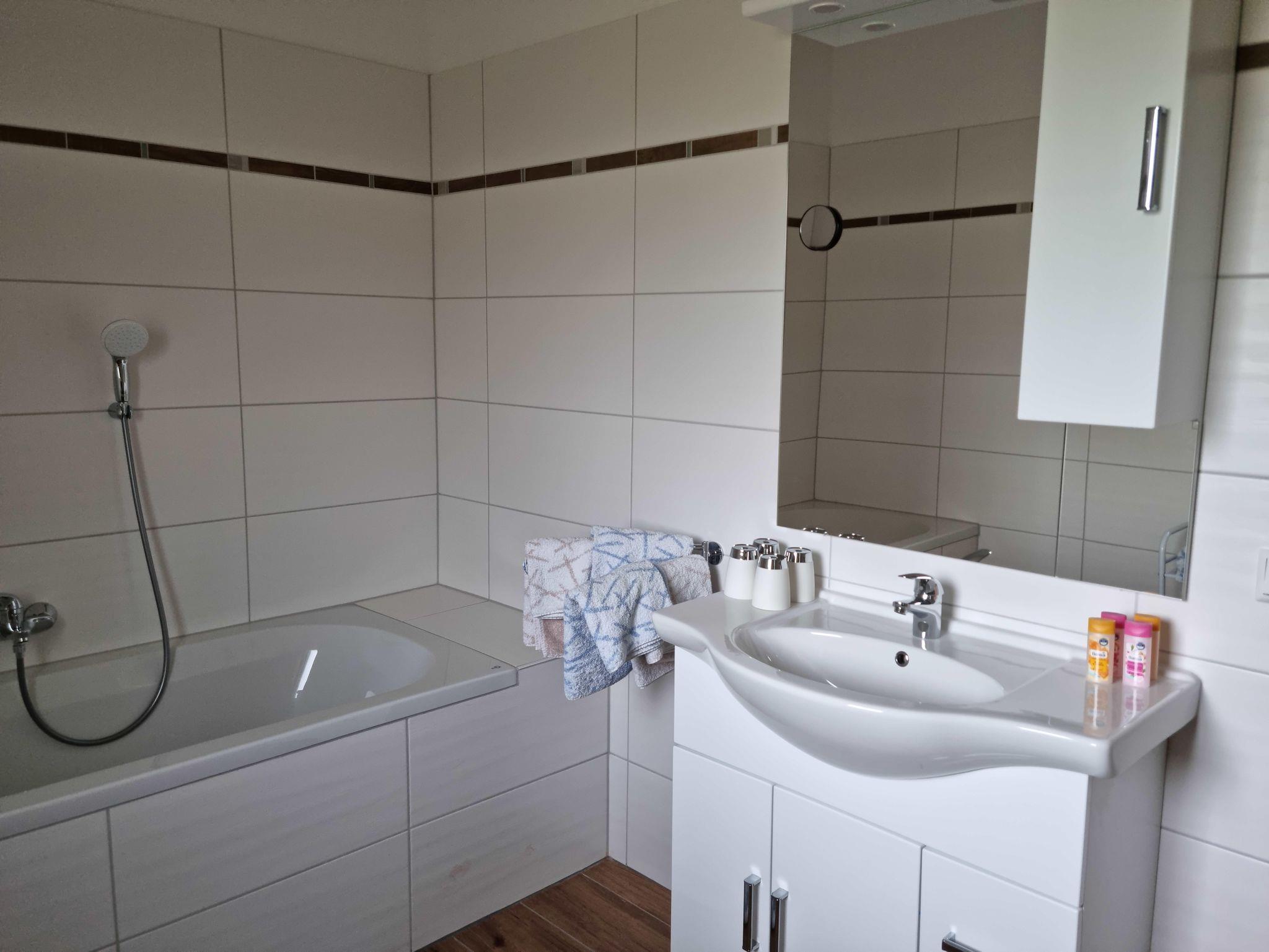 Das neu errichtete Appartement verfügt über eine Wohnküche, zwei große Schlafzimmer, eine Wohnküche, ein Badezimmer mit Badewanne und einer geräumigen ebenerdigen Dusche und einem Waschbecken mit Spiegelschrank. Das WC ist getrennt. Bei einem Schlafzimmer gibt es einen Balkon mit Sitzgelegenheit. Von der Wohnküche gelangen Sie auf einen schönen großen Balkon mit Sitzgelegenheit. Hier können Sie die Nachmittagssonne mit Blick in den Garten bis zum Sonnenuntergang genießen.