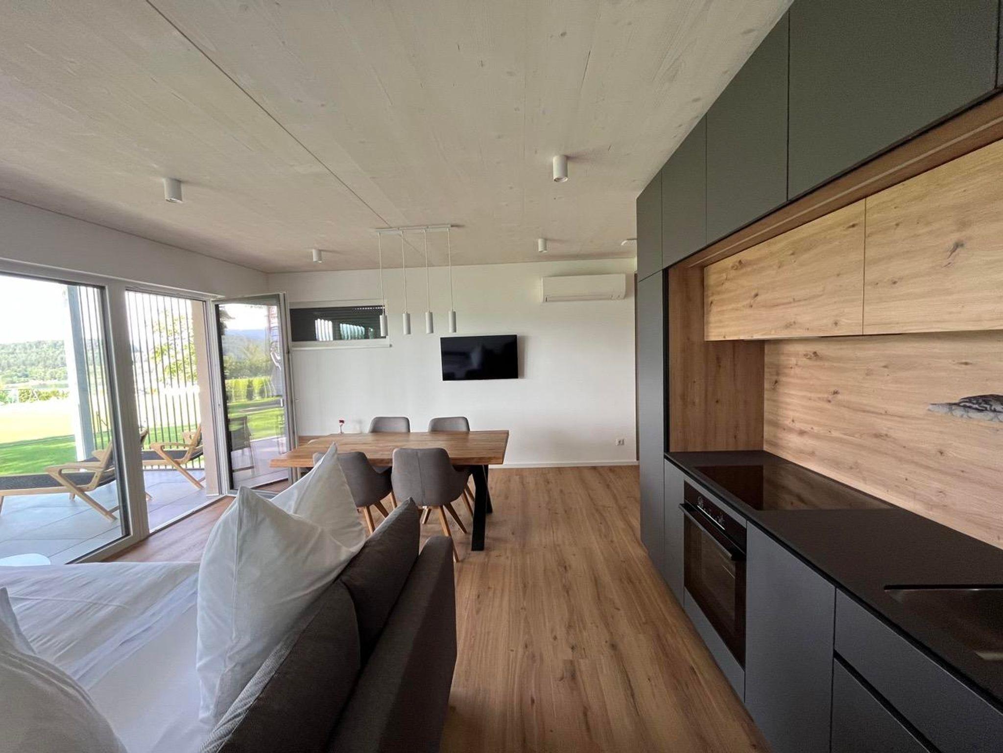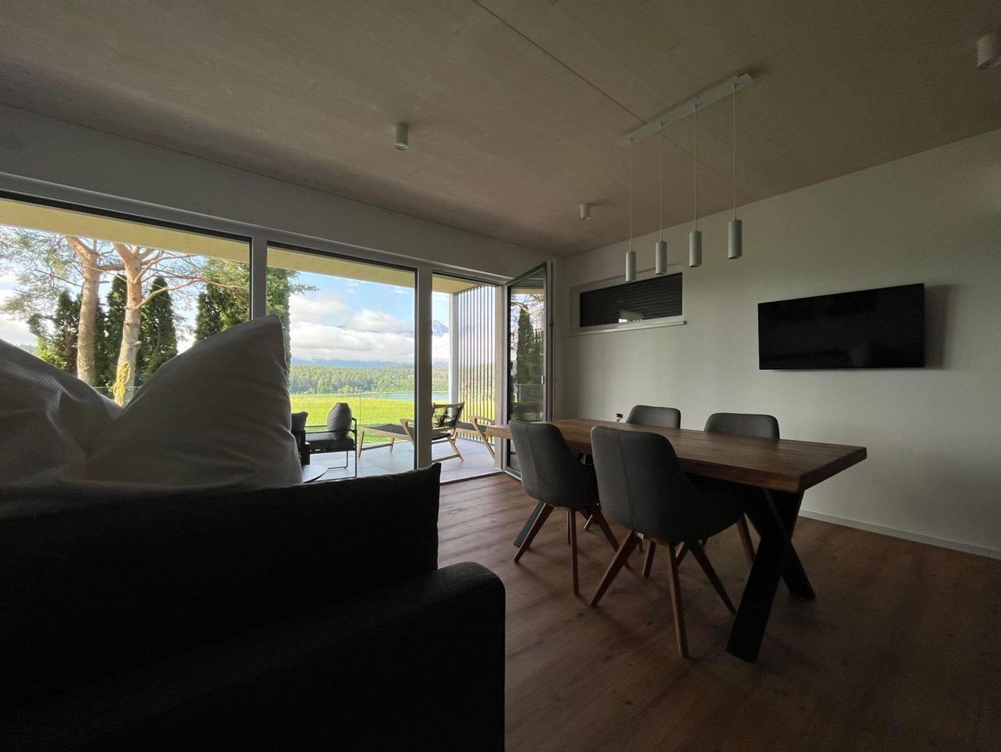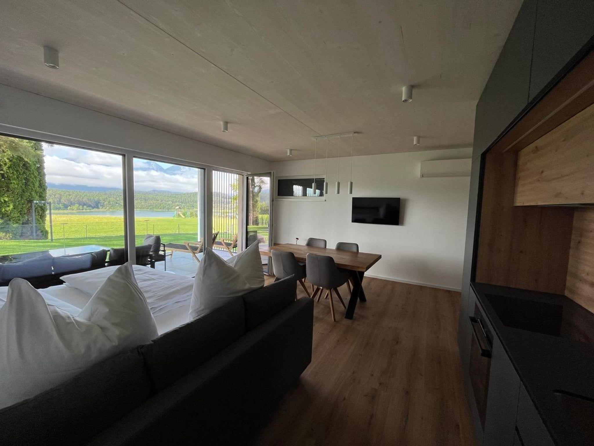 Der Wohnraum besticht mit seiner großen Glasfront, die direkt auf die Terrasse führt. Im Wohnraum befindet sich eine moderne Küche, ausgestattet mit Kühlschrank, Gefrierfach, Ceranfeld, Backrohr, Geschirrspüler, Spüle, Kaffeemaschine und Wasserkocher. Die Küche enthält ein vollständiges Besteck- und Geschirrservice. Der Esstisch, für bis zu 4 Personen, ermöglicht einen einzigartigen Ausblick auf den See während dem Essen. Zum Entspannen lädt die große Couch mit Fernseher ein. Bei mehr als 2 Personen, finden bis zu 2 weitere Personen auf der gemütlichen Ausziehcouch Platz.