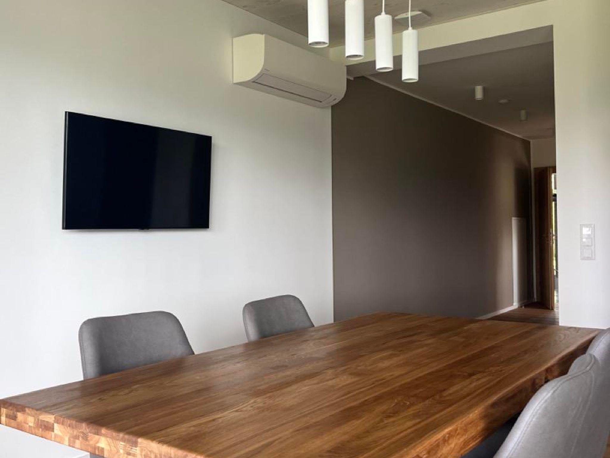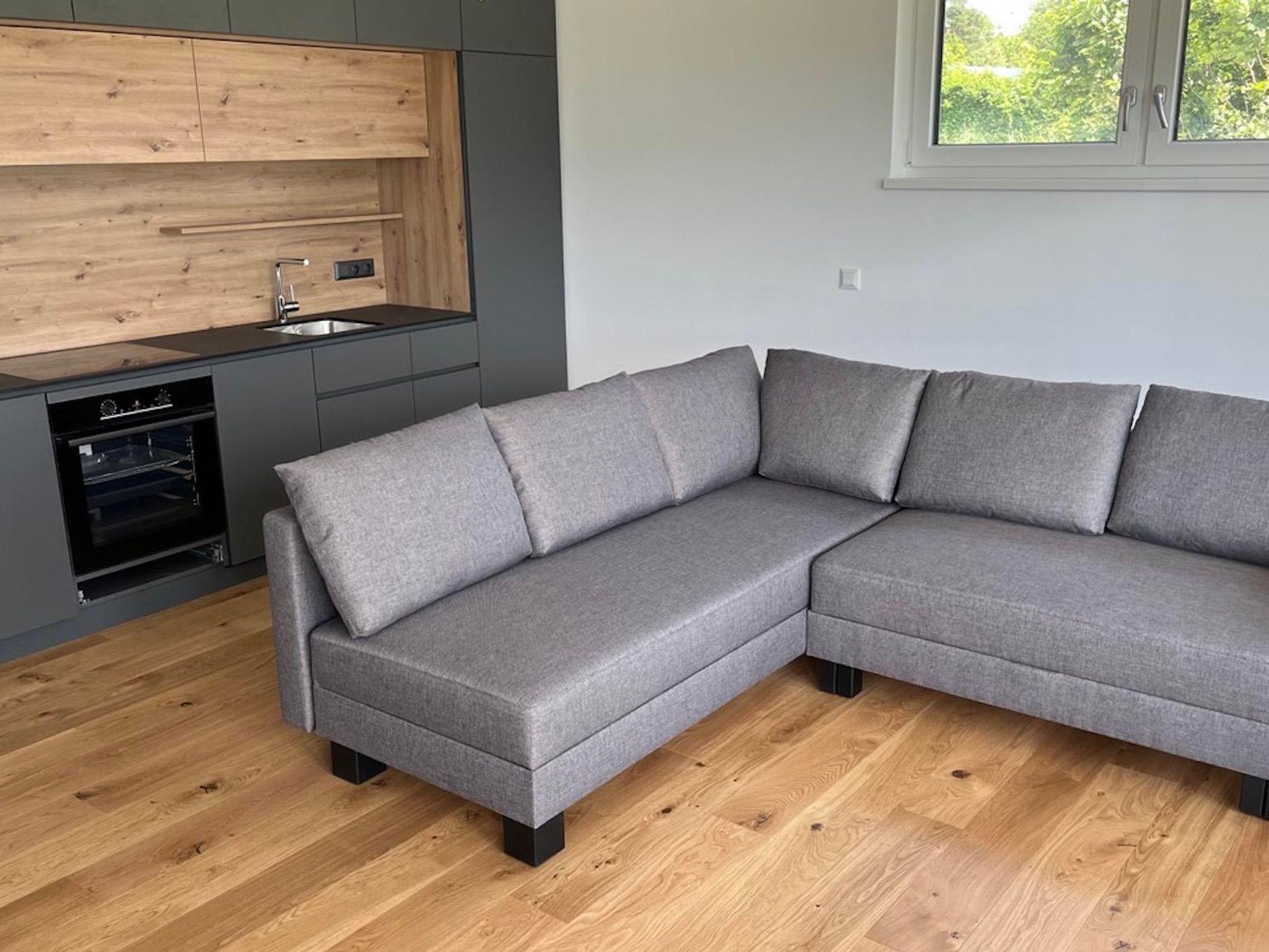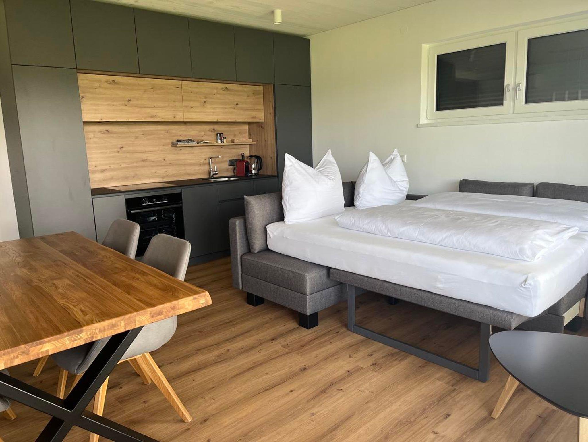 Der Wohnraum besticht mit seiner großen Glasfront, die direkt auf die Terrasse führt. Im Wohnraum befindet sich eine moderne Küche, ausgestattet mit Kühlschrank, Gefrierfach, Ceranfeld, Backrohr, Geschirrspüler, Spüle, Kaffeemaschine und Wasserkocher. Die Küche enthält ein vollständiges Besteck- und Geschirrservice. Der Esstisch, für bis zu 4 Personen, ermöglicht einen einzigartigen Ausblick auf den See während dem Essen. Zum Entspannen lädt die große Couch mit Fernseher ein. Bei mehr als 2 Personen, finden bis zu 2 weitere Personen auf der gemütlichen Ausziehcouch Platz.